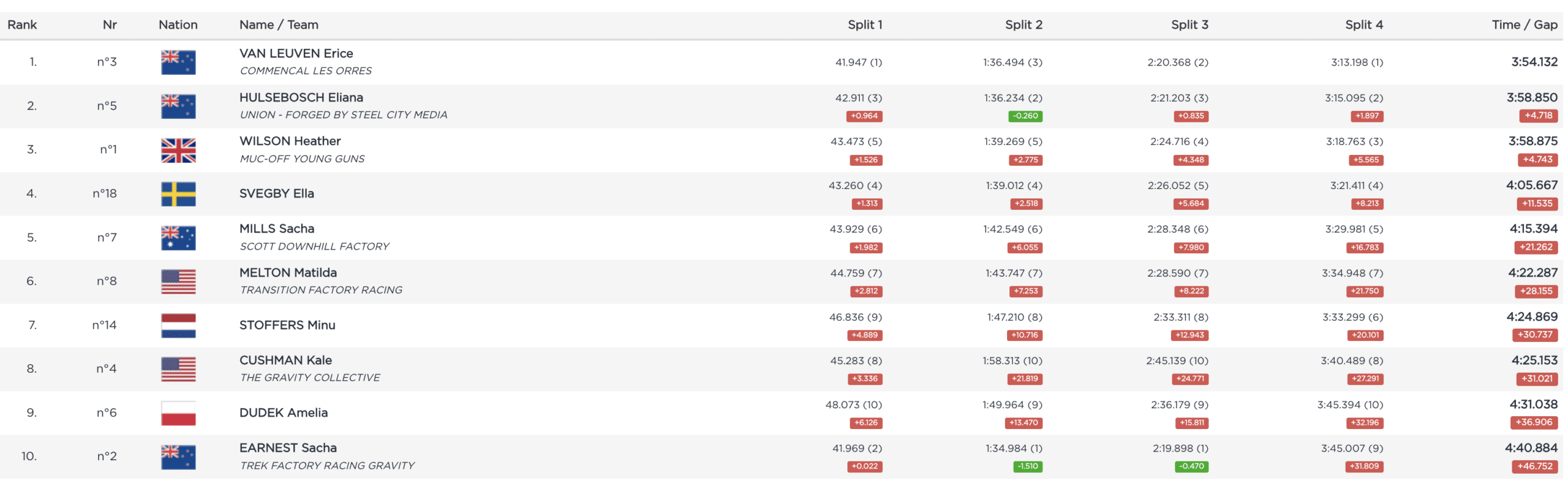 Jessica Blewitt va elle connaitre moins de réussite. Pourtant en avance de 2 secondes sur Myriam Nicole après la motorway de milieu de piste, elle est victime d’une chute stupide dans le bois final, suivie d’une autre un peu plus bas. Scénario presque identique pour Tahnée Seagrave, avec de l’avance avant le fameux bois et une chute quasi au même endroit… Elles termineront respectivement 10e et 12e de cette finale.