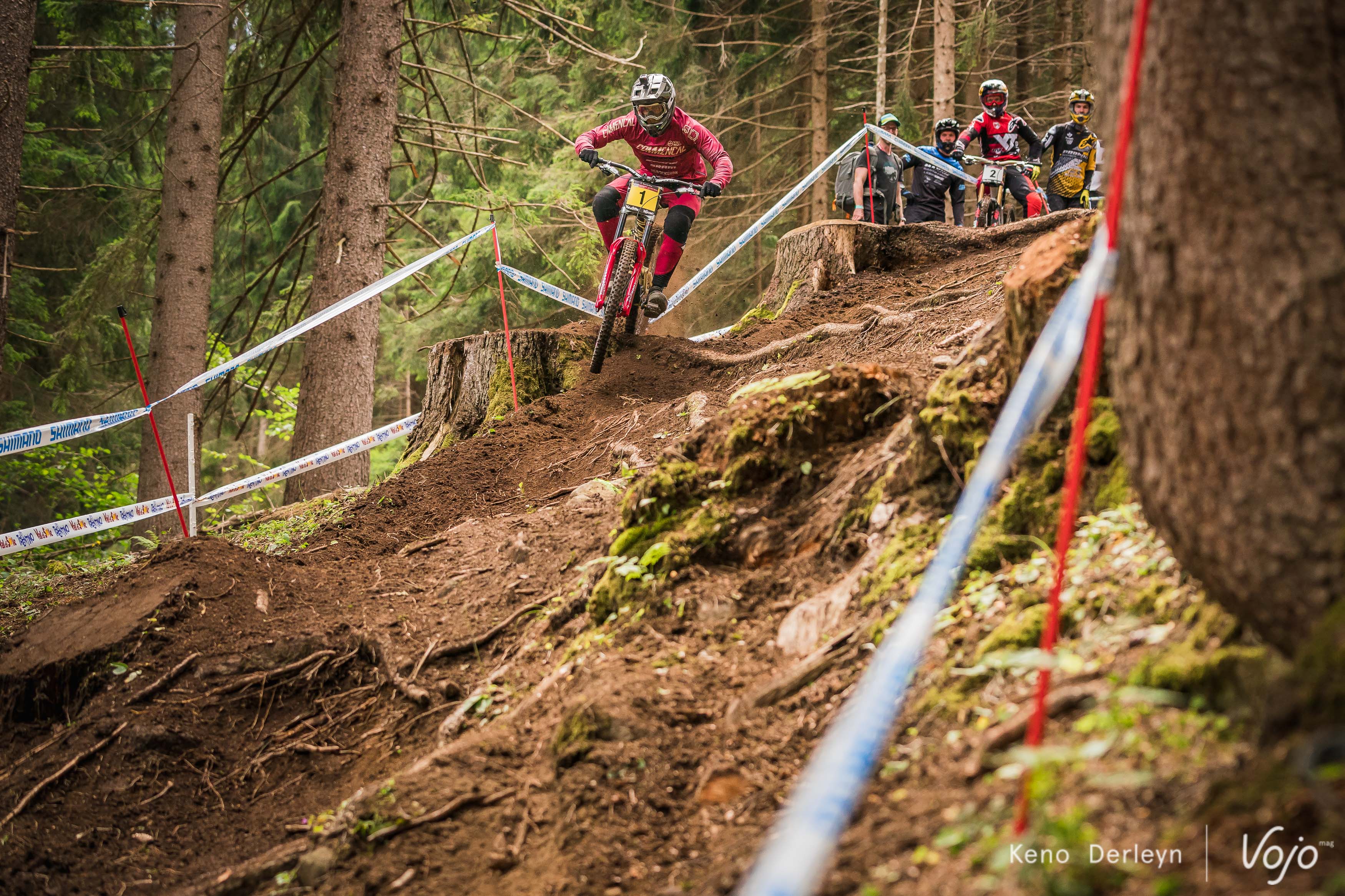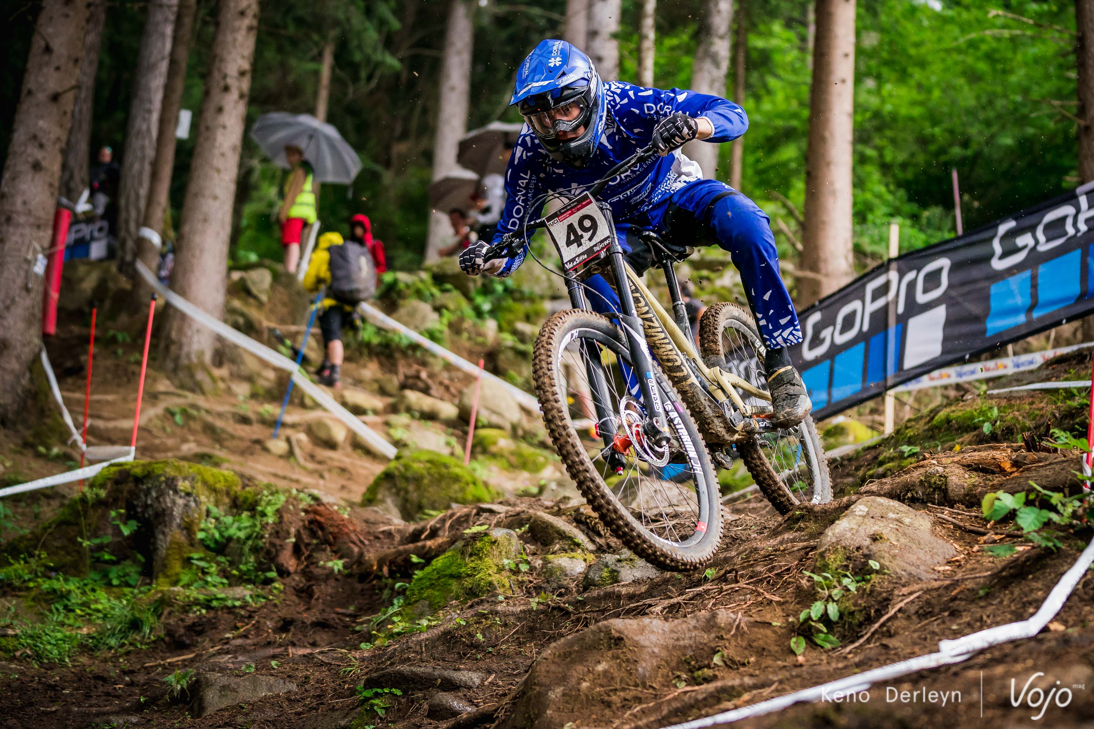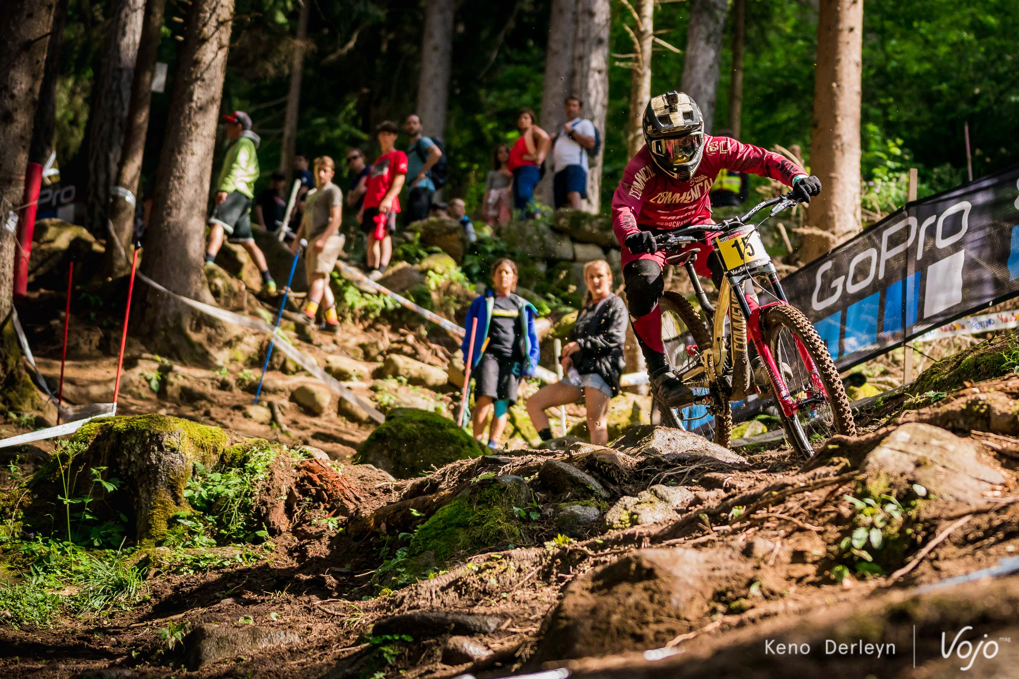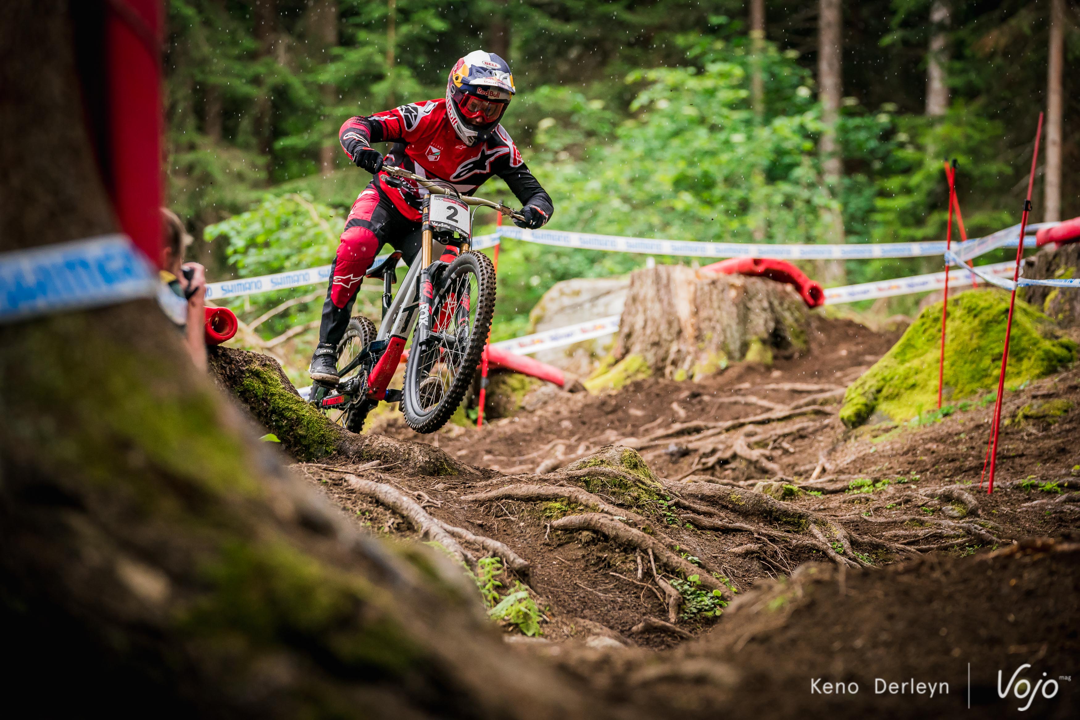 Il était parti frustré de Leogang (11e) et quand Loïc Bruni est fâché, il faut s’attendre à un retour fracassant ! Ce weekend notre Champion du Monde roule à nouveau au guidon de son Specialized Demo en 27,5 » après avoir essayé le 29 pouces il y a deux semaines aux Crankworx des Gets : « Le vélo n’est pas prêt », explique-t-il tout simplement. Concernant la piste, voici ce qu’il explique : « La piste s’est déjà dégradée et ça n’a fait que de pleuvoir donc il y a des lignes qui ne sont pas trop possibles. Au début des entraînements, j’ai pris le temps de regarder les lignes et je suis parti rouler en enchainant un peu plus sur la fin, quand il s’est mis à pleuvoir, j’étais deg. En fait sur cette piste, c’est dur de s’adapter et c’est dur d’aller vite. Sinon dans l’ensemble j’ai pratiquement validé toutes mes lignes, il y a seulement quelques endroits où j’ai foiré et où je vais devoir corriger ça. » Nous l’avons suivi lors de la reconnaissance à pied, nous le retrouvons après une première journée d’entraînement. Amaury Pierron nous raconte sa première journée d’entraînement : « C’est une piste très changeante et on s’y attendait. Ce n’est pas facile de trouver les bonnes lignes, je dirais même qu’il faut être visionnaire ! Je ne sais pas si je le suis mais en tout cas j’essaye d’anticiper l’évolution du terrain. Là, je pense que le gros a été fait avec les passages d’aujourd’hui et que ça ne devrait plus trop trop bouger. Si tu as choisi des lignes qui sont déjà tendues, il vaut mieux les oublier et opter pour des trajectoire un peu plus ‘safe’ ! Au Time Training j’ai fait un run en entier et c’était méga dur ! Physiquement parlant, c’est un truc de fou ! Je l’ai ressenti par rapport aux reconnaissances du matin, je roulais à fond et j’avais l’impression que je n’avançais pas. Il faudrait être hulk ici pour rouler à fond. En fait il n’y a pas de répit et on sent qu’on n’est plus à Leogang et Fort William où ça coule tout le long. Là ça tape de A à Z et si je dois trouver une pause, je dirais qu’elle est entre F et G et qu’elle ne dure que cinq secondes ! » Le leader de la Coupe du Monde réalise tout de même le deuxième temps des entraînements. Certes il est à +3.839 secondes du meilleur temps mais un tel résultat est toujours un bon signe avant la course. Il est donc tout à fait normal qu’Aaron Gwin l’observe rouler (voir photo ci-dessus)… En parlant de Time Training, Benoit Coulanges signe le troisième meilleur temps. Et il était ravi et on le comprend: « Je suis allé à Morzine la semaine dernière durant 3/4 jours pour rouler et je retrouve ici quasiment les mêmes conditions. J’aime vraiment ce type de terrain et c’est aussi ce que j’ai chez moi au Mont Pilat : il y a de la pente, de la tourbe et des racines. Alors c’est vrai que j’ai de suite trouvé un bon rythme et je me sens donc un peu comme à la maison. Après la piste est super physique et c’est d’autant plus dur car c’est en bas qu’il y a les plus grands chocs. » Alors à la question : « Est-ce que tu garderas donc de l’énergie pour en bas ? », il répond sans hésiter : « Ah non, je vais tout donner tout au long du tracé ! Après ce serait bien si les conditions pouvaient rester comme ce matin, c’était humide mais le grip était juste parfait. Puis s’il pleut, il faut qu’il pleuve pour tout le monde. » Il faut aussi noter que le sociétaire du team Dorval AM roule depuis Leogang avec un Commencal : « En fait je n’étais plus très à l’aise sur mon ancien vélo alors j’ai contacté Yannick (responsable marketing Commencal, ndlr) et on a trouvé un deal. J’ai un bon équipement dessus, de bons pneus avec des roues montées maison (Asterion) donc je l’ai assemblé de la meilleure des façons. Je me sentais bien depuis le début de l’année mais je sentais que quelque chose me bloquait. Là tout est différent alors pourvu que ça dure ! » Du côté des Dames, Myriam Nicole ne s’affolait pas : « J’ai un peu testé toutes les conditions mais je n’ai pas pris trop d’averses. Je n’ai pas roulé le dernier run de la journée car il y avait eu une grosse pluie et je n’ai pas voulu prendre trop de risques. C’est une piste bien engagée, qui est fun à rouler mais sur laquelle il faut bien réfléchir car il y a beaucoup de trajectoires. J’ai envie de dire qu’il y aura des choses à valider jusqu’au dernier moment ! »