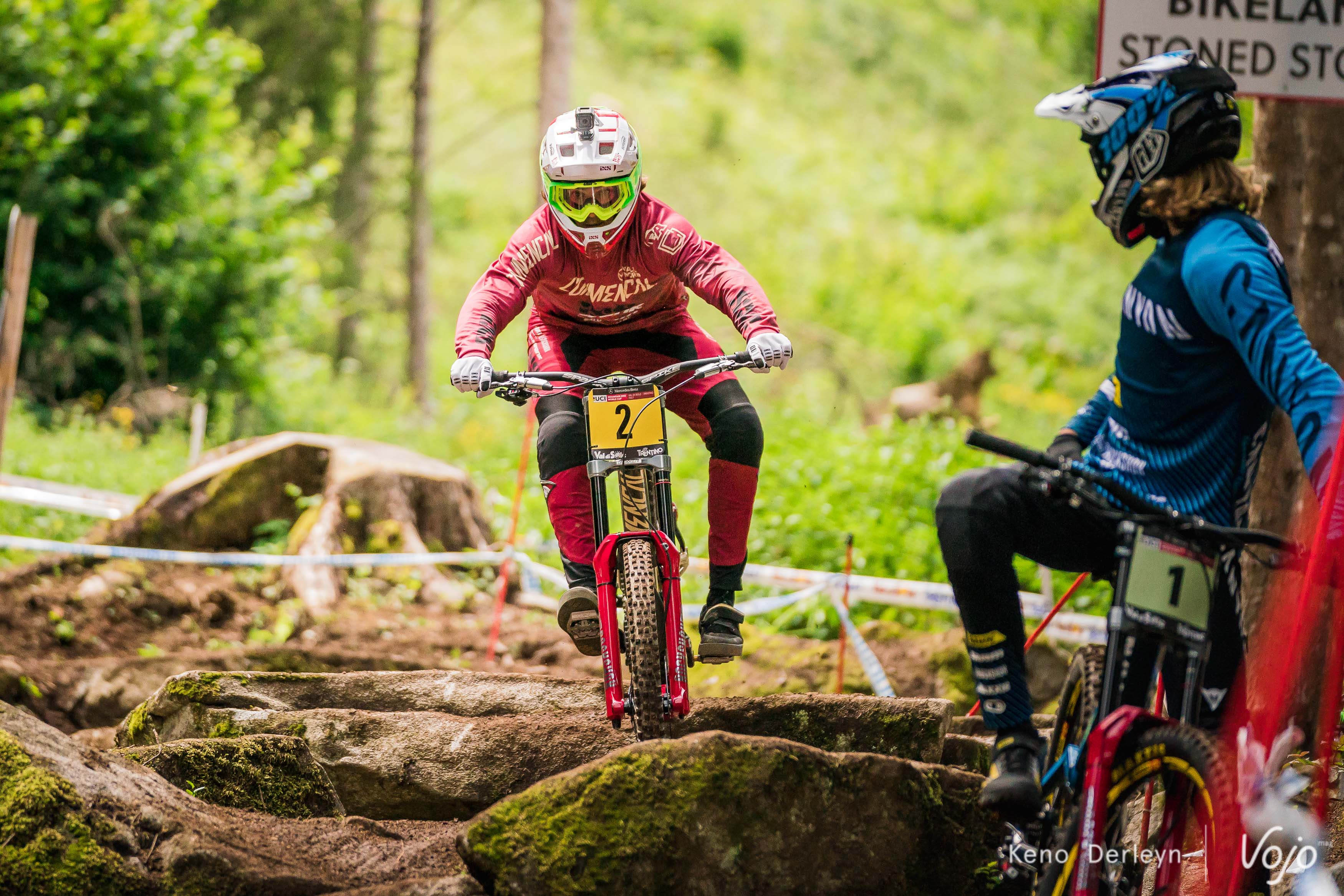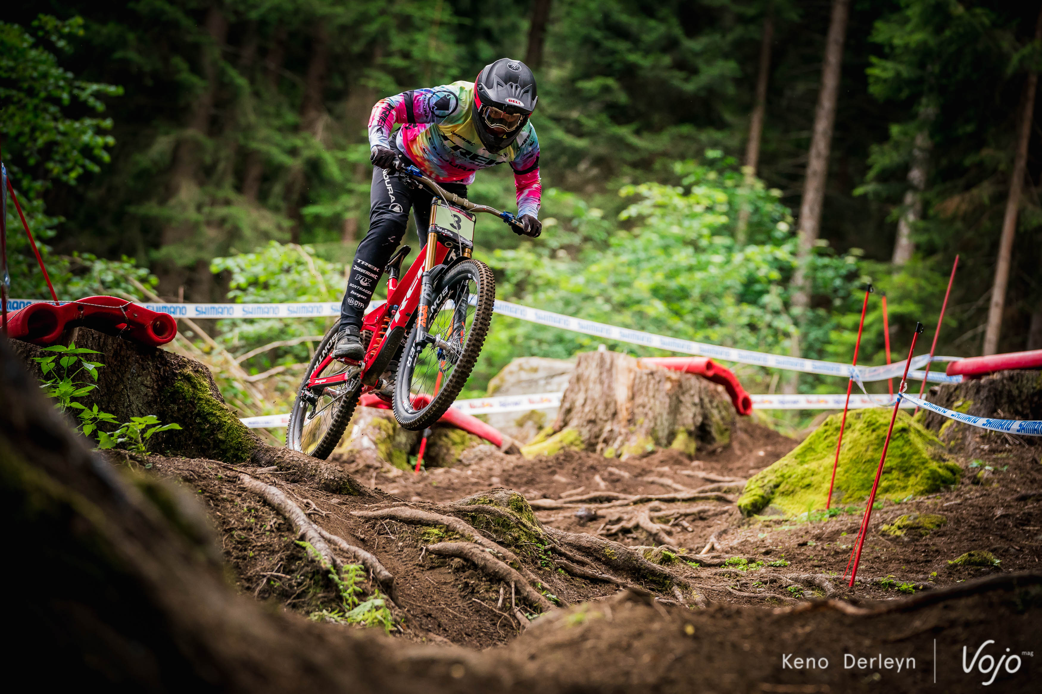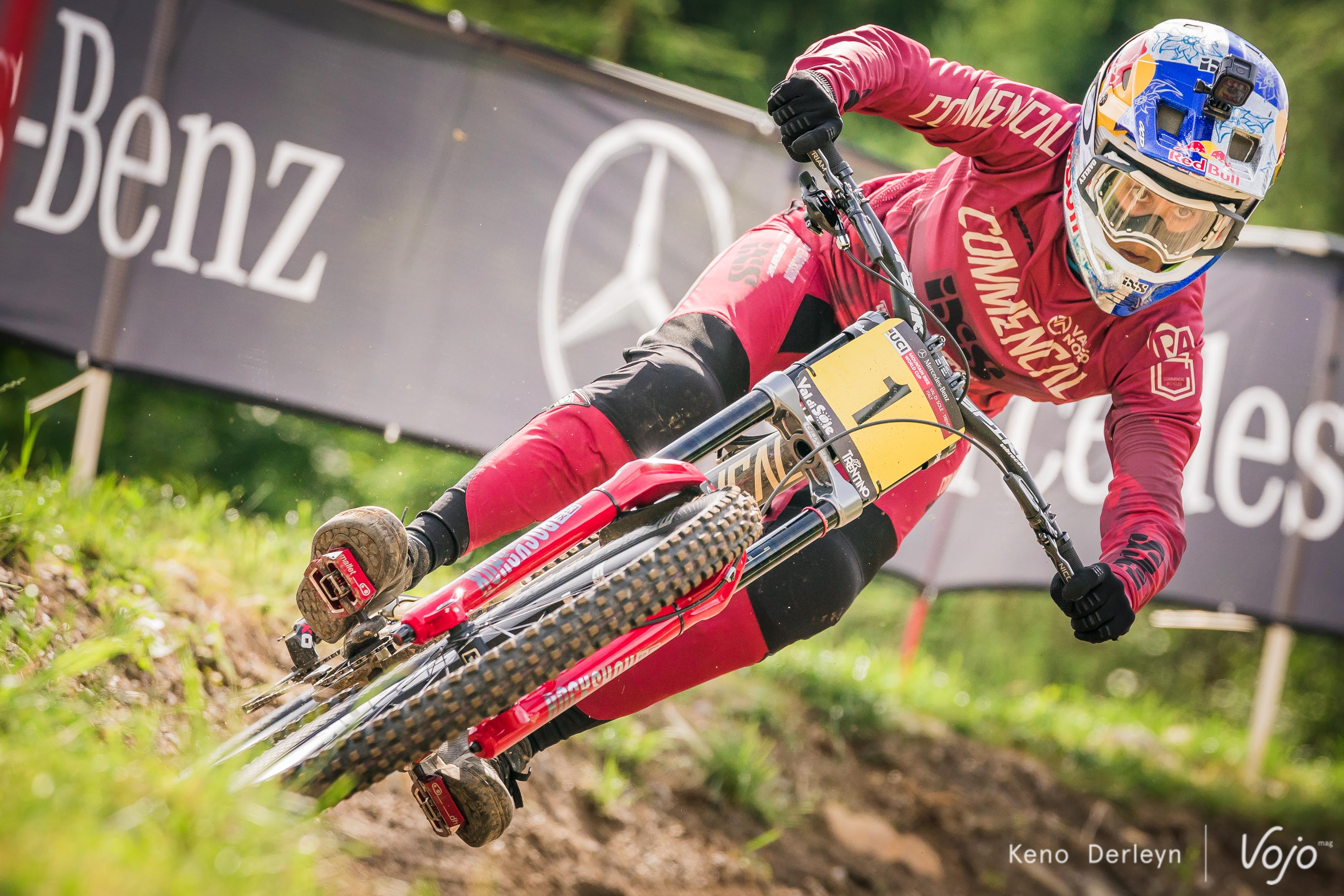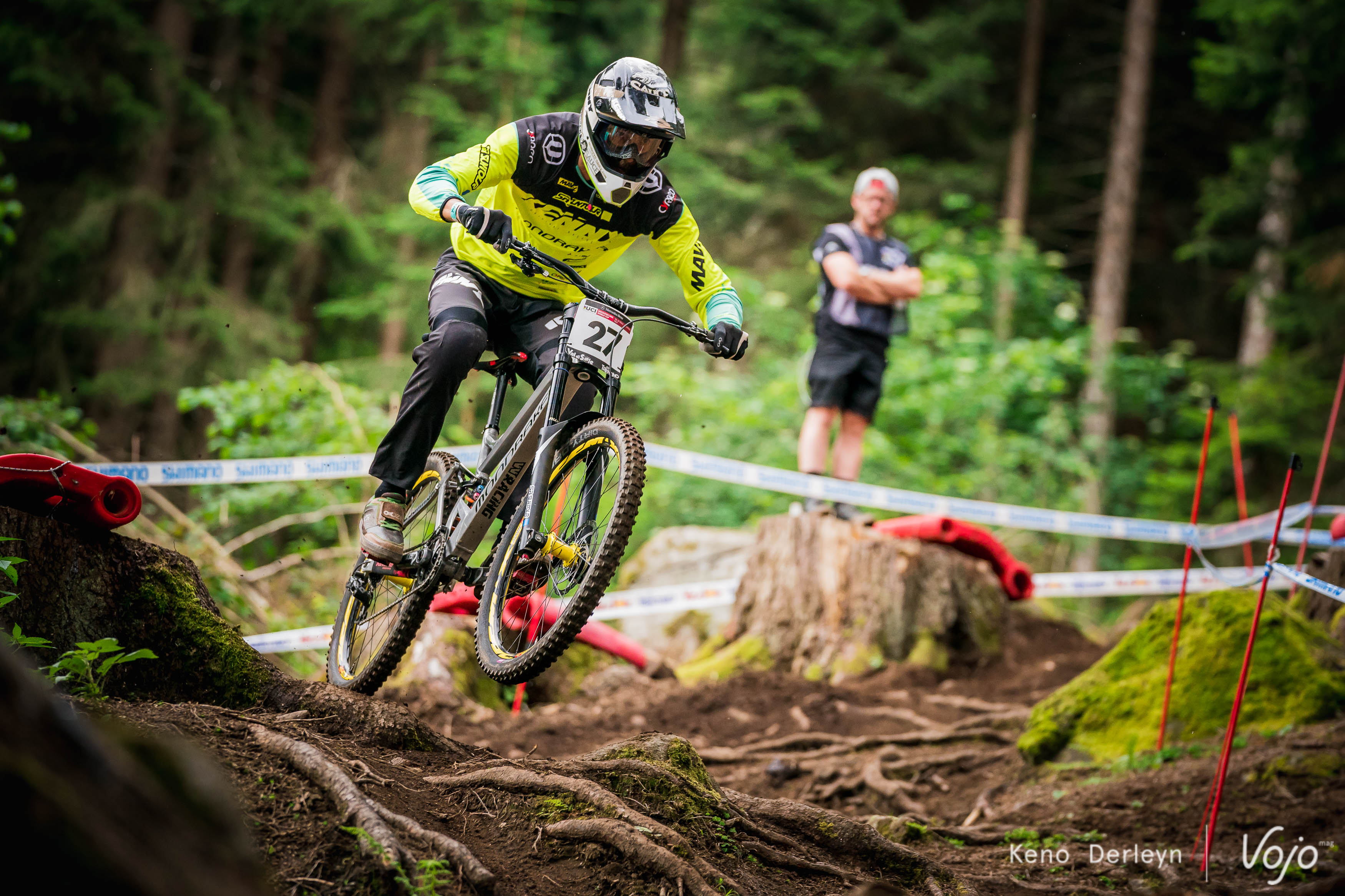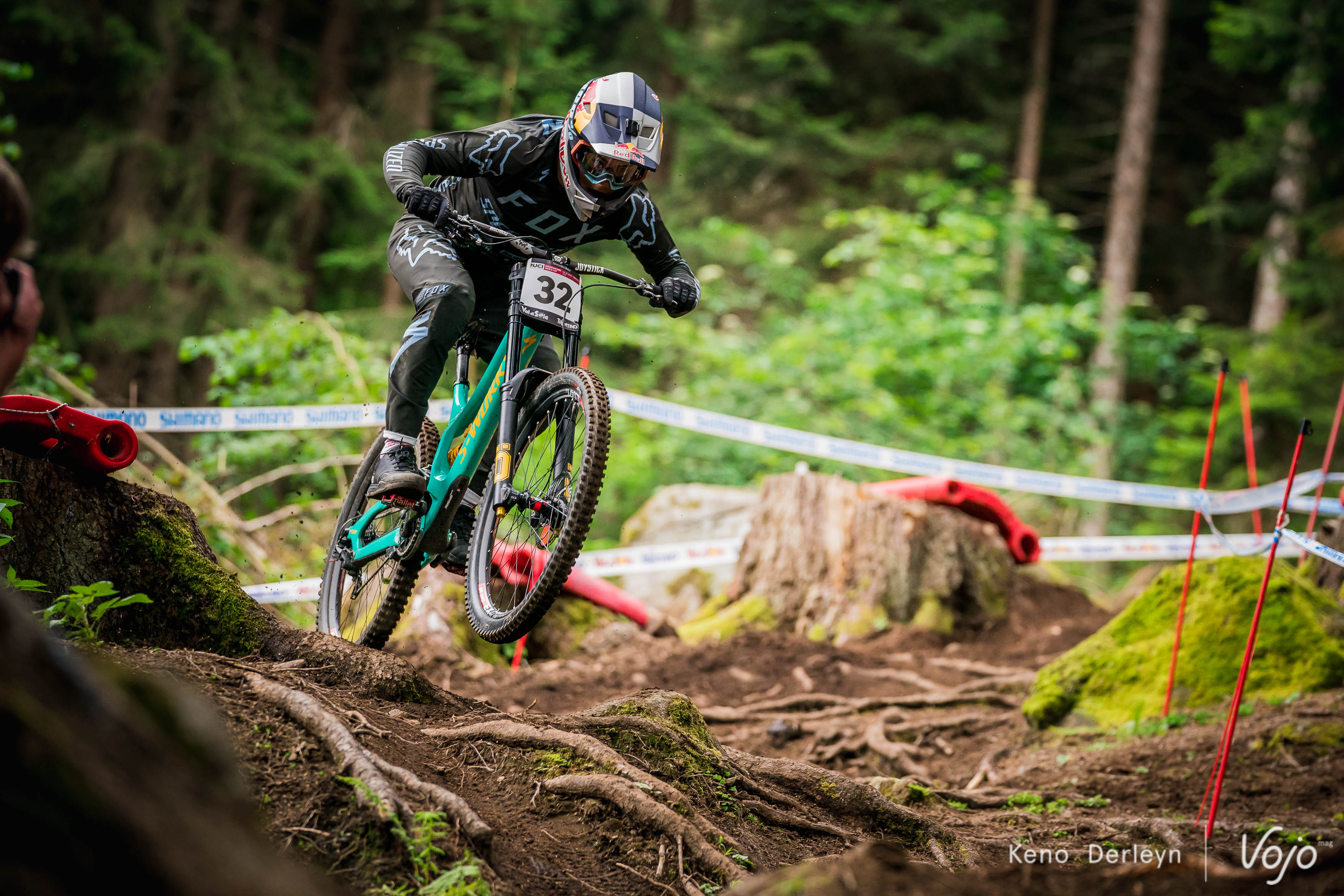 Il était parti frustré de Leogang (11e) et quand Loïc Bruni est fâché, il faut s’attendre à un retour fracassant ! Ce weekend notre Champion du Monde roule à nouveau au guidon de son Specialized Demo en 27,5 » après avoir essayé le 29 pouces il y a deux semaines aux Crankworx des Gets : « Le vélo n’est pas prêt », explique-t-il tout simplement. Concernant la piste, voici ce qu’il explique : « La piste s’est déjà dégradée et ça n’a fait que de pleuvoir donc il y a des lignes qui ne sont pas trop possibles. Au début des entraînements, j’ai pris le temps de regarder les lignes et je suis parti rouler en enchainant un peu plus sur la fin, quand il s’est mis à pleuvoir, j’étais deg. En fait sur cette piste, c’est dur de s’adapter et c’est dur d’aller vite. Sinon dans l’ensemble j’ai pratiquement validé toutes mes lignes, il y a seulement quelques endroits où j’ai foiré et où je vais devoir corriger ça. » Nous l’avons suivi lors de la reconnaissance à pied, nous le retrouvons après une première journée d’entraînement. Amaury Pierron nous raconte sa première journée d’entraînement : « C’est une piste très changeante et on s’y attendait. Ce n’est pas facile de trouver les bonnes lignes, je dirais même qu’il faut être visionnaire ! Je ne sais pas si je le suis mais en tout cas j’essaye d’anticiper l’évolution du terrain. Là, je pense que le gros a été fait avec les passages d’aujourd’hui et que ça ne devrait plus trop trop bouger. Si tu as choisi des lignes qui sont déjà tendues, il vaut mieux les oublier et opter pour des trajectoire un peu plus ‘safe’ ! Au Time Training j’ai fait un run en entier et c’était méga dur ! Physiquement parlant, c’est un truc de fou ! Je l’ai ressenti par rapport aux reconnaissances du matin, je roulais à fond et j’avais l’impression que je n’avançais pas. Il faudrait être hulk ici pour rouler à fond. En fait il n’y a pas de répit et on sent qu’on n’est plus à Leogang et Fort William où ça coule tout le long. Là ça tape de A à Z et si je dois trouver une pause, je dirais qu’elle est entre F et G et qu’elle ne dure que cinq secondes ! » Le leader de la Coupe du Monde réalise tout de même le deuxième temps des entraînements. Certes il est à +3.839 secondes du meilleur temps mais un tel résultat est toujours un bon signe avant la course. Il est donc tout à fait normal qu’Aaron Gwin l’observe rouler (voir photo ci-dessus)… En parlant de Time Training, Benoit Coulanges signe le troisième meilleur temps. Et il était ravi et on le comprend: « Je suis allé à Morzine la semaine dernière durant 3/4 jours pour rouler et je retrouve ici quasiment les mêmes conditions. J’aime vraiment ce type de terrain et c’est aussi ce que j’ai chez moi au Mont Pilat : il y a de la pente, de la tourbe et des racines. Alors c’est vrai que j’ai de suite trouvé un bon rythme et je me sens donc un peu comme à la maison. Après la piste est super physique et c’est d’autant plus dur car c’est en bas qu’il y a les plus grands chocs. » Alors à la question : « Est-ce que tu garderas donc de l’énergie pour en bas ? », il répond sans hésiter : « Ah non, je vais tout donner tout au long du tracé ! Après ce serait bien si les conditions pouvaient rester comme ce matin, c’était humide mais le grip était juste parfait. Puis s’il pleut, il faut qu’il pleuve pour tout le monde. » Il faut aussi noter que le sociétaire du team Dorval AM roule depuis Leogang avec un Commencal : « En fait je n’étais plus très à l’aise sur mon ancien vélo alors j’ai contacté Yannick (responsable marketing Commencal, ndlr) et on a trouvé un deal. J’ai un bon équipement dessus, de bons pneus avec des roues montées maison (Asterion) donc je l’ai assemblé de la meilleure des façons. Je me sentais bien depuis le début de l’année mais je sentais que quelque chose me bloquait. Là tout est différent alors pourvu que ça dure ! » Du côté des Dames, Myriam Nicole ne s’affolait pas : « J’ai un peu testé toutes les conditions mais je n’ai pas pris trop d’averses. Je n’ai pas roulé le dernier run de la journée car il y avait eu une grosse pluie et je n’ai pas voulu prendre trop de risques. C’est une piste bien engagée, qui est fun à rouler mais sur laquelle il faut bien réfléchir car il y a beaucoup de trajectoires. J’ai envie de dire qu’il y aura des choses à valider jusqu’au dernier moment ! »