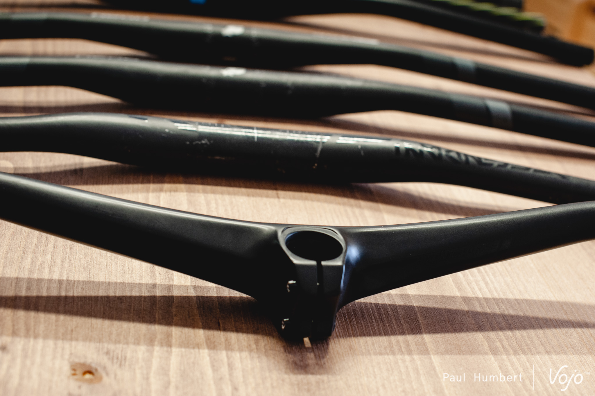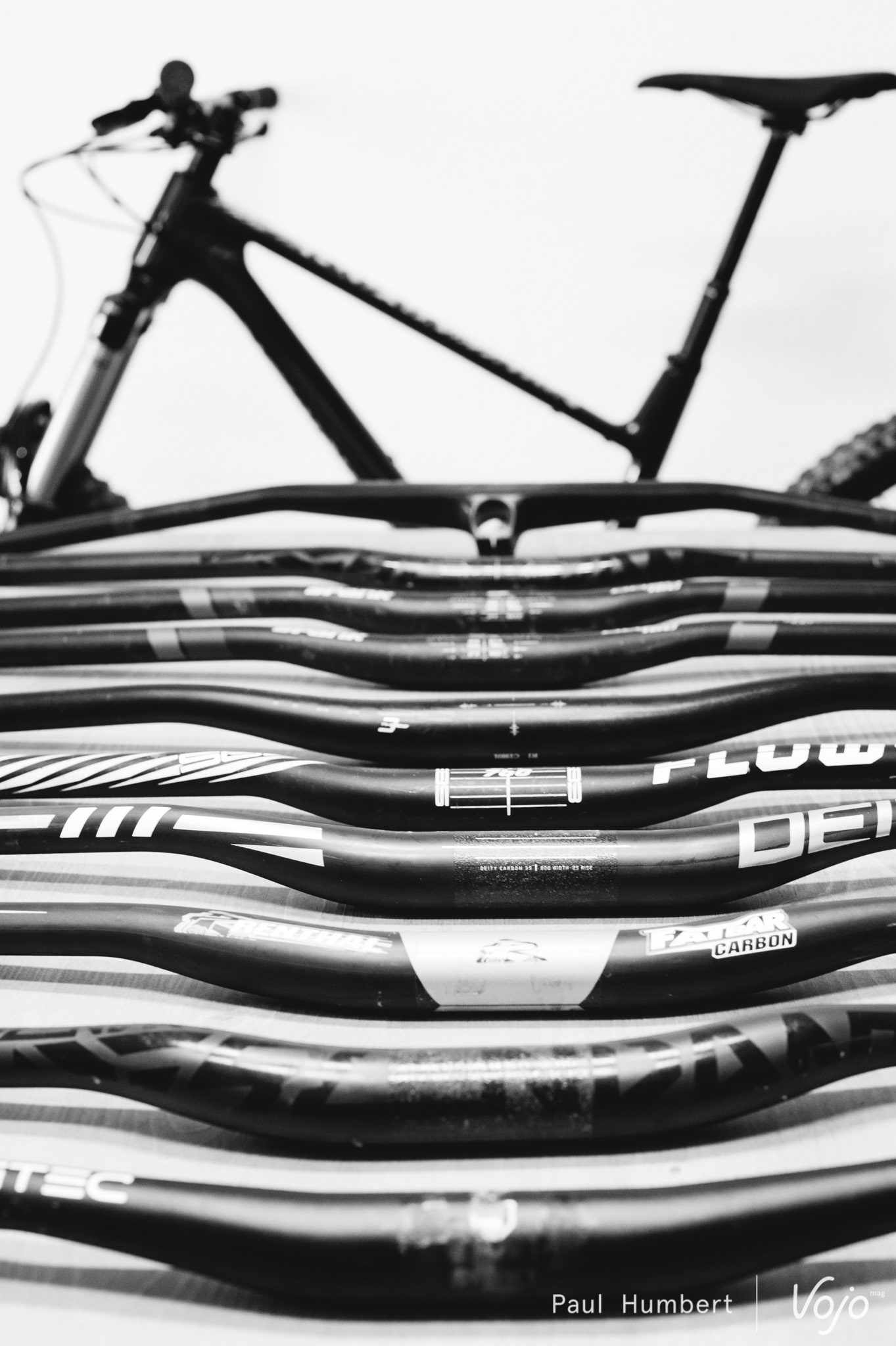 Les marques et les modèles importaient au final assez peu car ce n’est pas une comparaison de produits mais de standards et de matériaux. Diamètre 31,8 mm ou 35 mm, carbone ou aluminium, nous avons cherché à mixer ces deux paramètres tout conservant des dimensions (largeurs et angles) les plus proches possible d’un modèle à l’autre, de façon à ne pas « parasiter » la comparaison avec d’autres éléments. Vous ne trouverez pas dans cet article de résumé sur les points forts et points faibles de chaque modèle testé, ce n’est pas le propos.