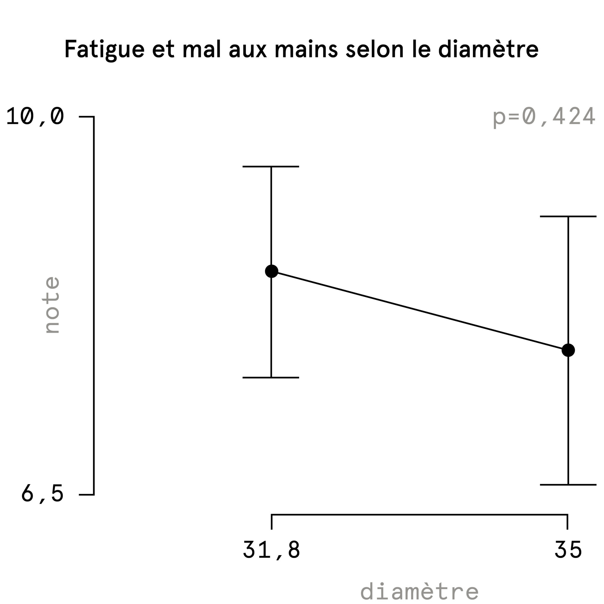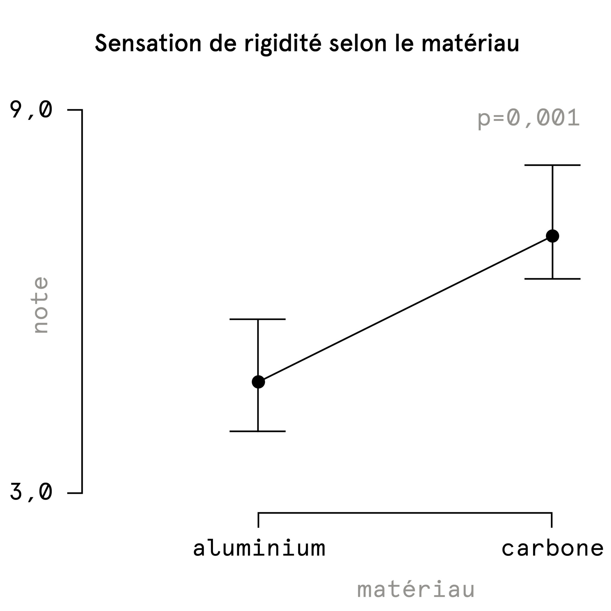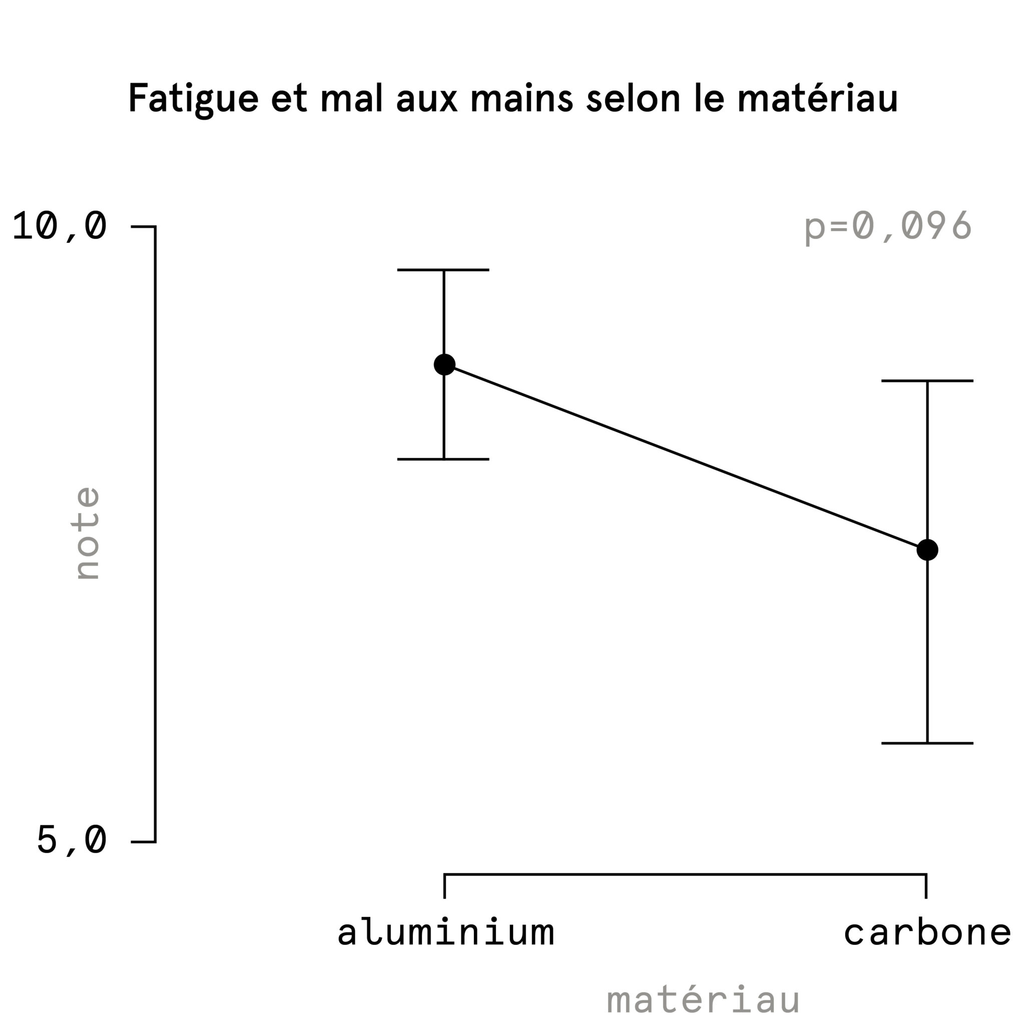 Quand on plonge un peu plus en détails dans l’analyse, on remarque que les combinaisons 35 mm × aluminium et 31,8 mm × carbone donnent des résultats identiques ou presque (aucune différence d’un point de vue statistique). A l’opposé, les 35 mm × carbone et 31,8 mm × aluminium sont eux bien différents, la deuxième combinaison étant significativement moins fatigante. Cependant, avec seulement deux cintres dans chaque catégorie, on se doit de prendre ces résultats avec plus de pincettes que ceux décrits précédemment.