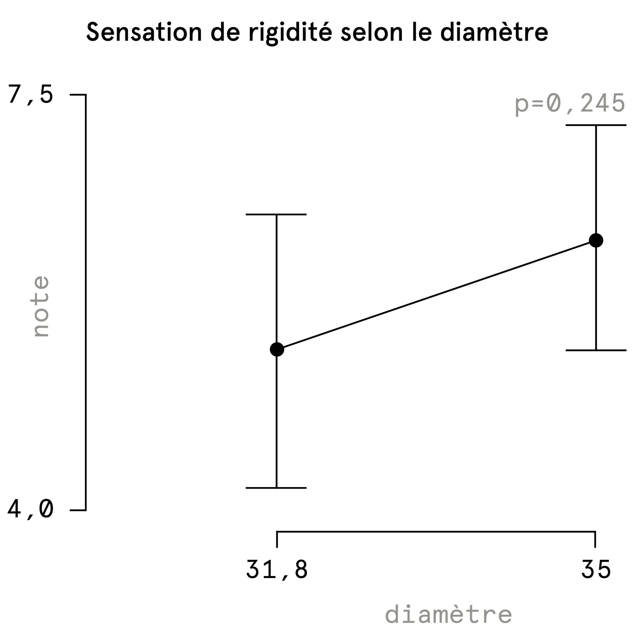 Ces derniers permettent de déterminer si les différences observées sont réelles ou si elles sont le fruit du hasard et auraient pu être générées aléatoirement par un ordinateur. Le résultat du test statistique, c’est un « risque », celui que les différences soient le fruit du hasard. On l’exprime le plus souvent en pourcentage. Plus on a de données à soumettre au test, plus il est juste et c’est pour cette raison que nous avions au moins quatre cintres pour chaque matériau ou diamètre, ainsi que 4 testeurs.