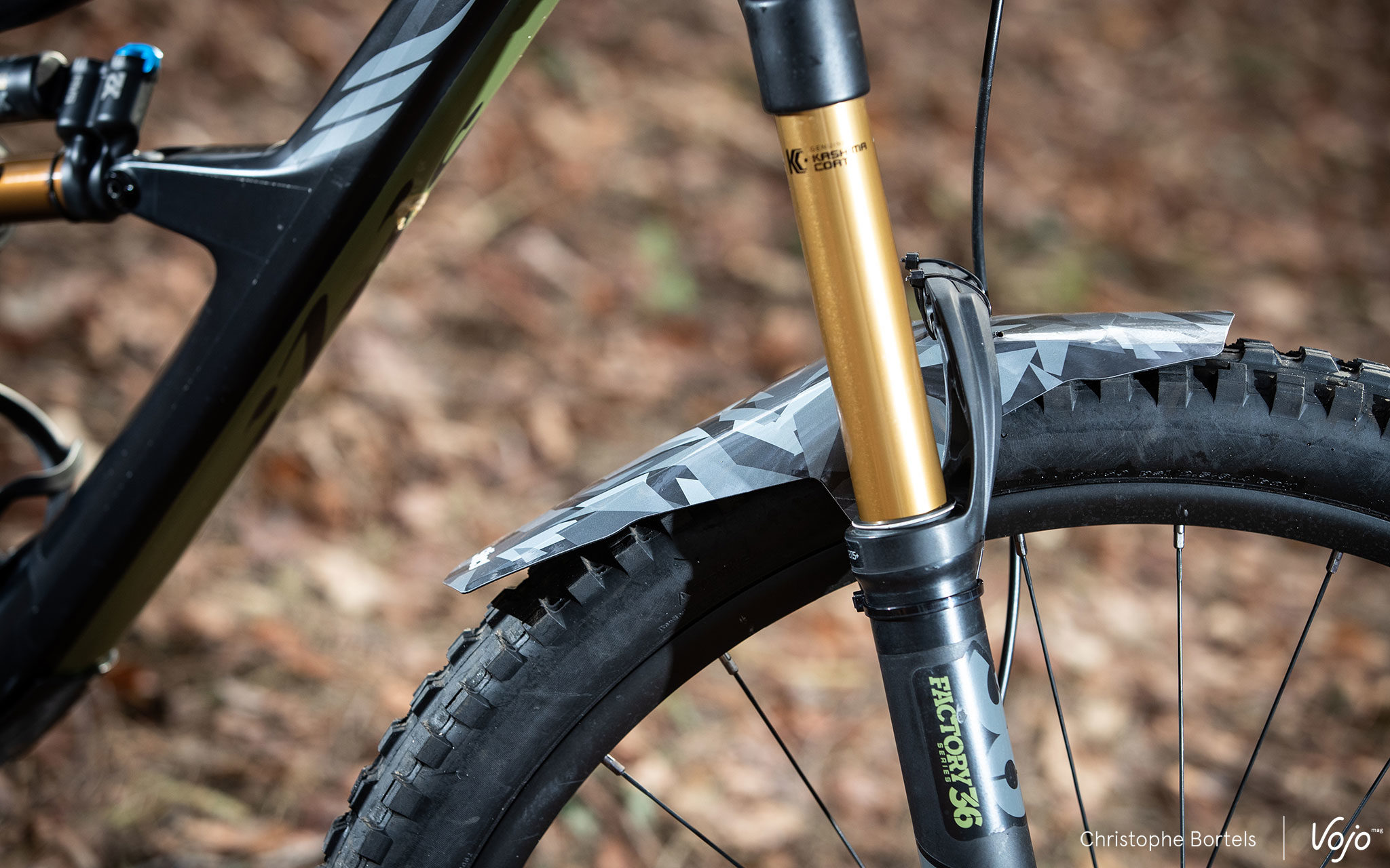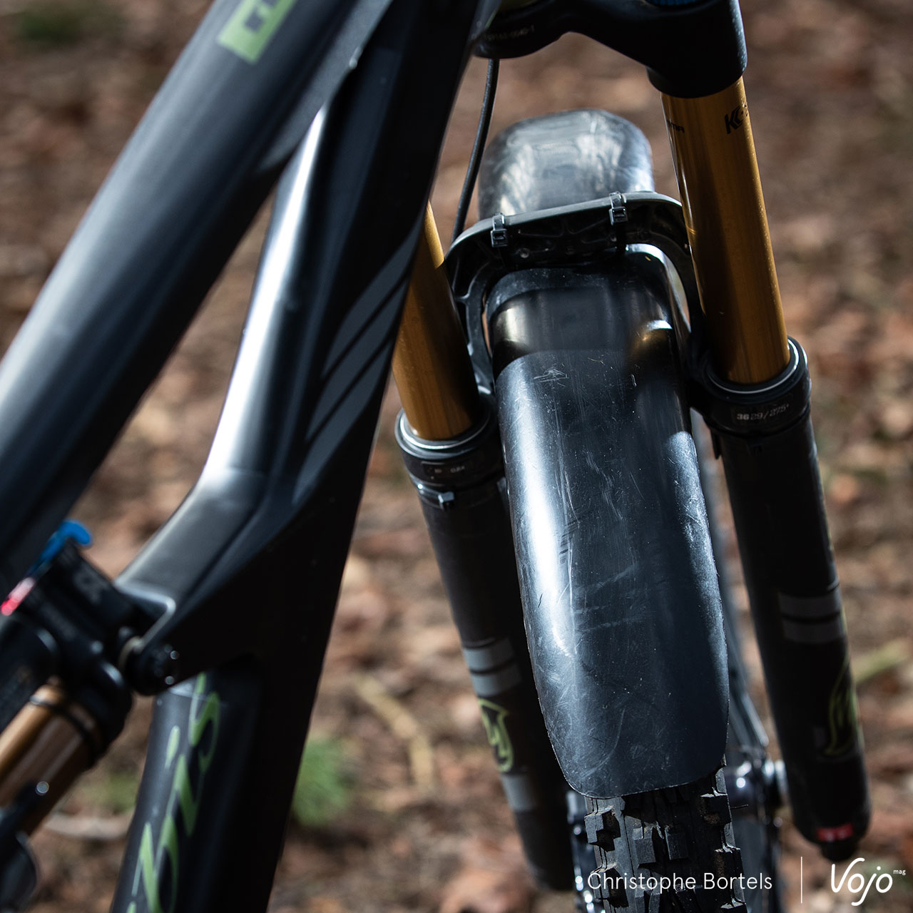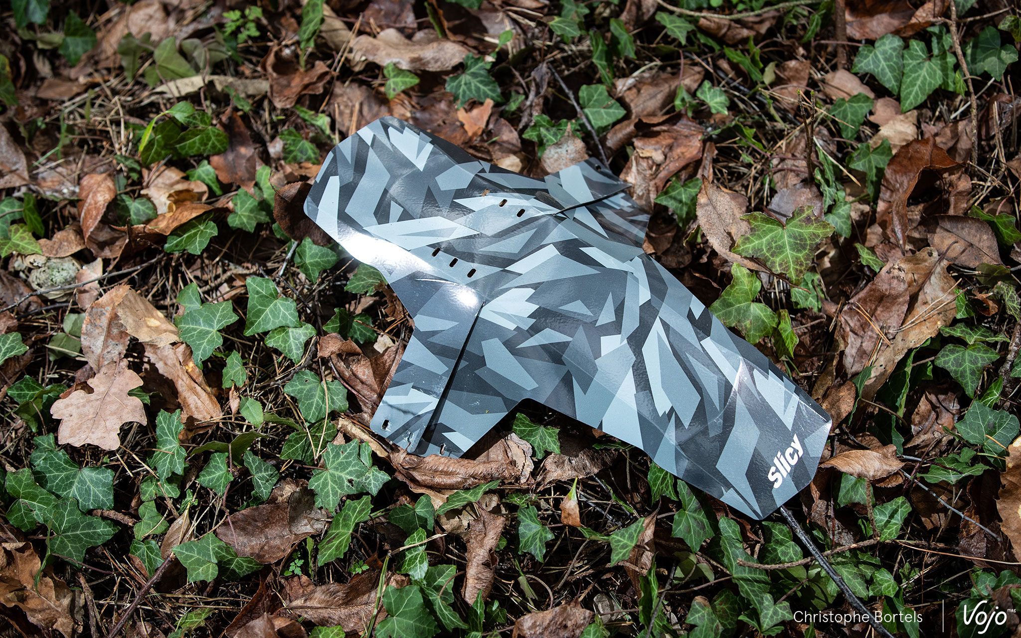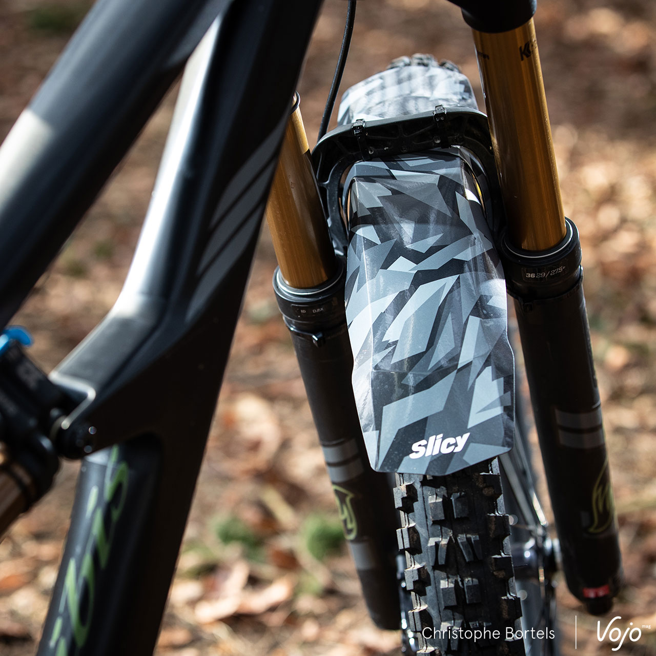 On se retrouve donc avec un garde-boue relativement long (35cm), qui dépasse à l’avant comme à l’arrière, mais dont l’esthétique reste harmonieuse et finalement plutôt discrète…si on met de côté le motif bien entendu. Dans certaines configurations, roue de 29″ sur Fox 36 par exemple, ce Slicy se retrouve un peu trop proche du pneu à notre goût, ce qui peut poser des soucis de bourrage en cas de boue collante. Par contre, l’efficacité est bien là et le gain de protection est clairement perceptible face aux modèles plus minimalistes évoqués ci-dessus avec une remontée d’eau et de boue bien mieux contrôlée, que ce soit à travers la fourche ou en avant de l’arceau grâce à sa longueur frontale.