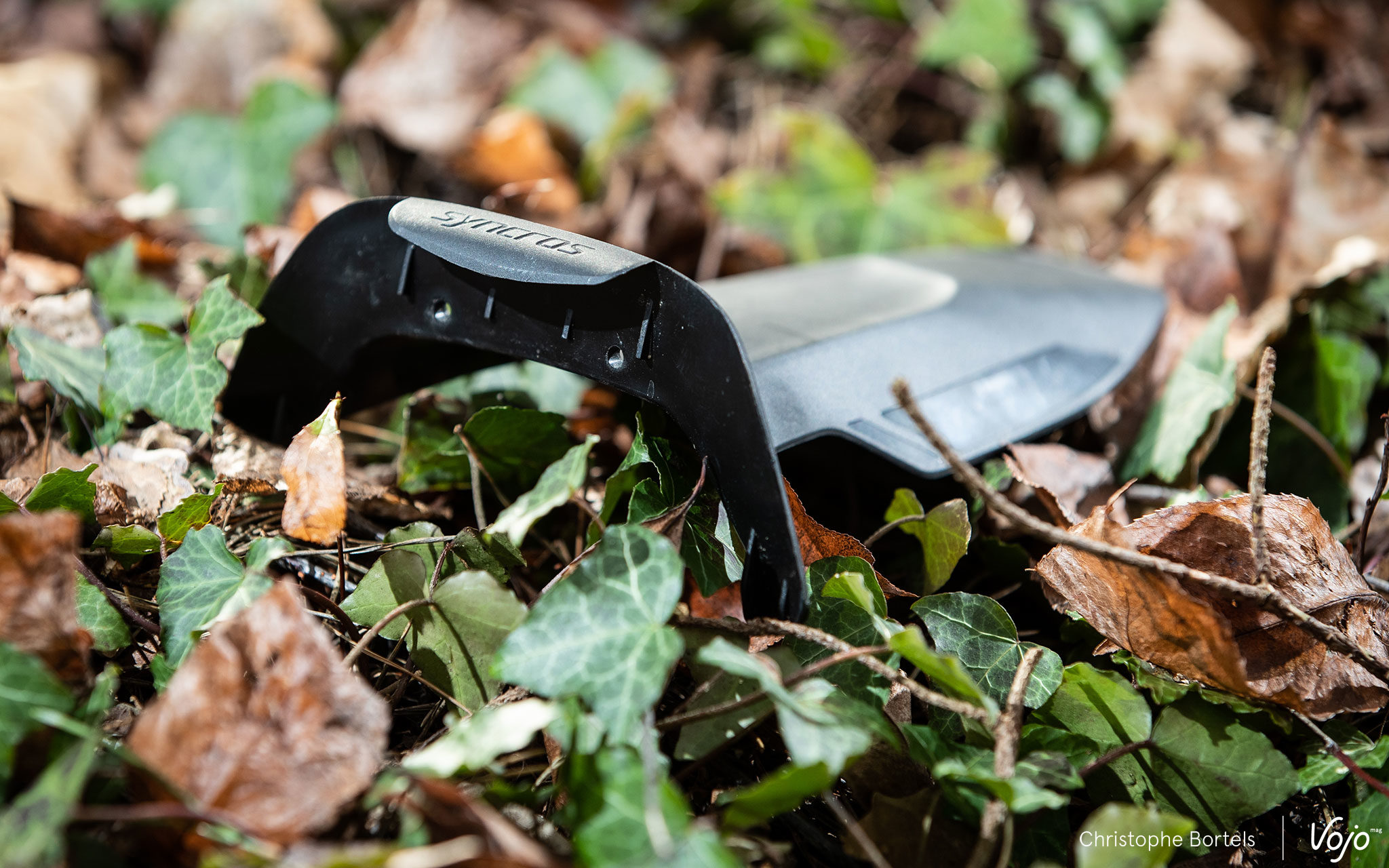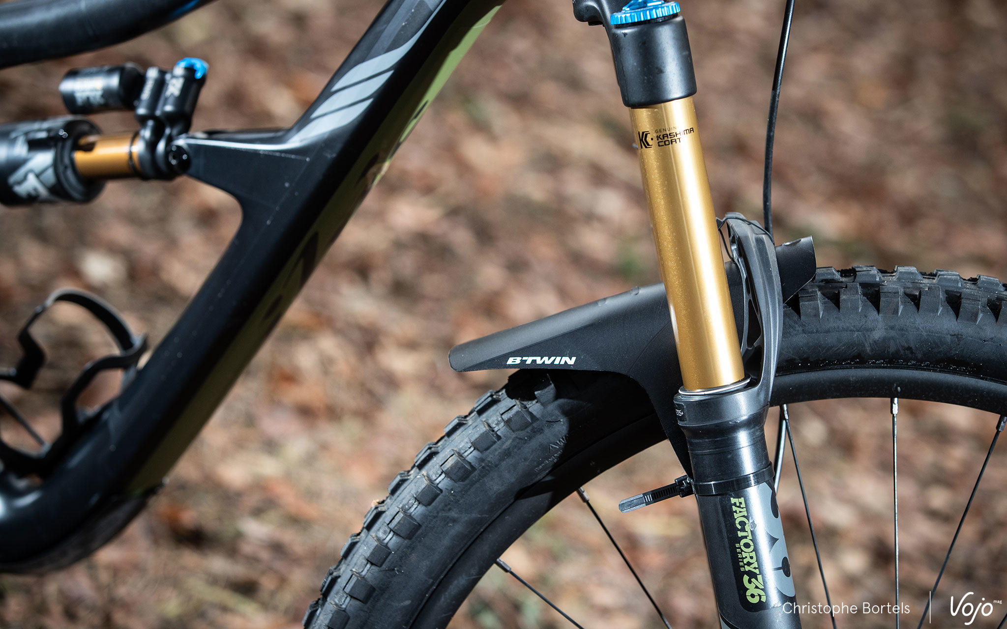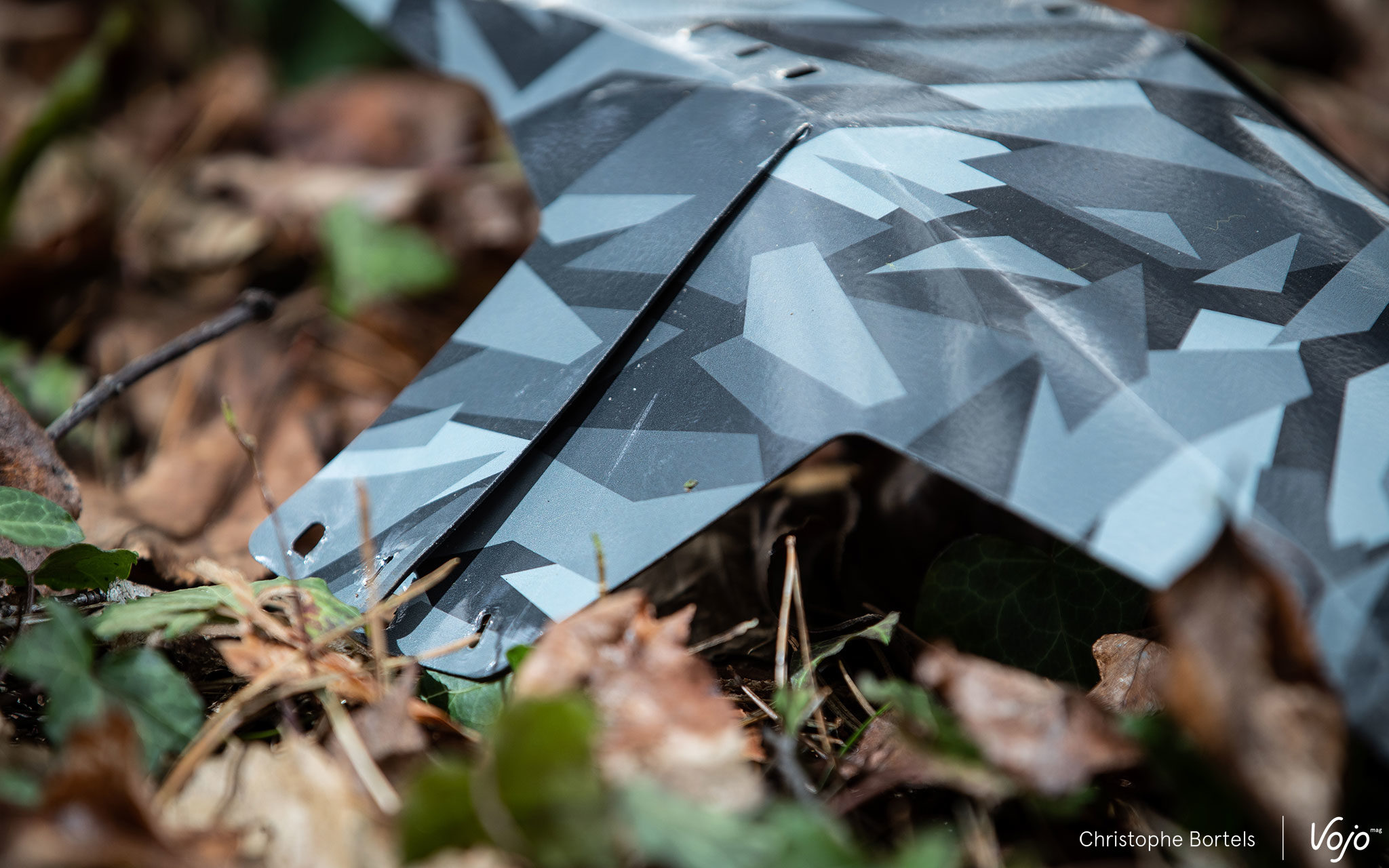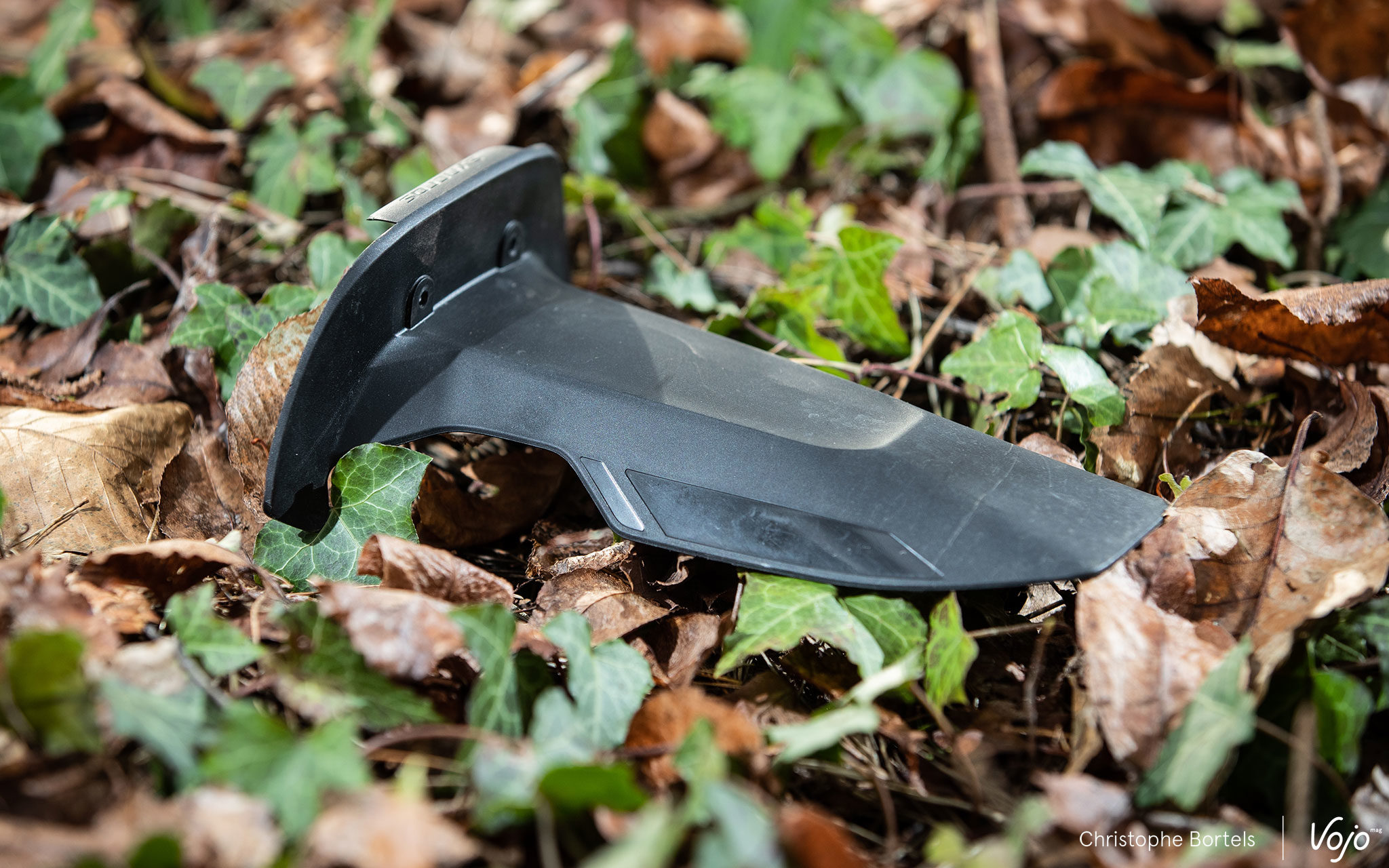 On se retrouve donc avec un garde-boue relativement long (35cm), qui dépasse à l’avant comme à l’arrière, mais dont l’esthétique reste harmonieuse et finalement plutôt discrète…si on met de côté le motif bien entendu. Dans certaines configurations, roue de 29″ sur Fox 36 par exemple, ce Slicy se retrouve un peu trop proche du pneu à notre goût, ce qui peut poser des soucis de bourrage en cas de boue collante. Par contre, l’efficacité est bien là et le gain de protection est clairement perceptible face aux modèles plus minimalistes évoqués ci-dessus avec une remontée d’eau et de boue bien mieux contrôlée, que ce soit à travers la fourche ou en avant de l’arceau grâce à sa longueur frontale.