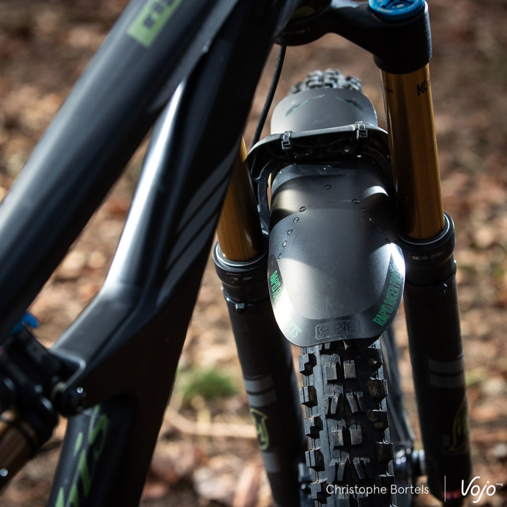 Vu la longueur encore plus importante que le Mudhugger (50cm soit 5 cm de plus), l’efficacité est forcément là aussi au rendez-vous avec des remontées vraiment très limitées quand il fait humide. Et s’il trouve également ses limites dans la boue collante, c’est moins problématique avec la possibilité de le décoller du pneu en le relevant un peu. C’est d’ailleurs la position qu’on a fini par adopter par défaut car, au plus bas, on pouvait entendre le garde-boue taper dans le pneu lors de certains gros chocs. On trouve là la limite de l’unique point de fixation quand il est appliqué à un modèle plus long. Précisons aussi que RRP a eu la bonne idée de placer des petits pads en caoutchouc juste sous les joints racleurs, à l’endroit où le garde-boue vient au contact des fourreaux et où il pourrait frotter lorsqu’il bouge, pour épargner la peinture de la fourche. Et que si nous testons ici la version Standard, il existe une déclinaison Mini qui, comme son nom l’indique, est plus courte.