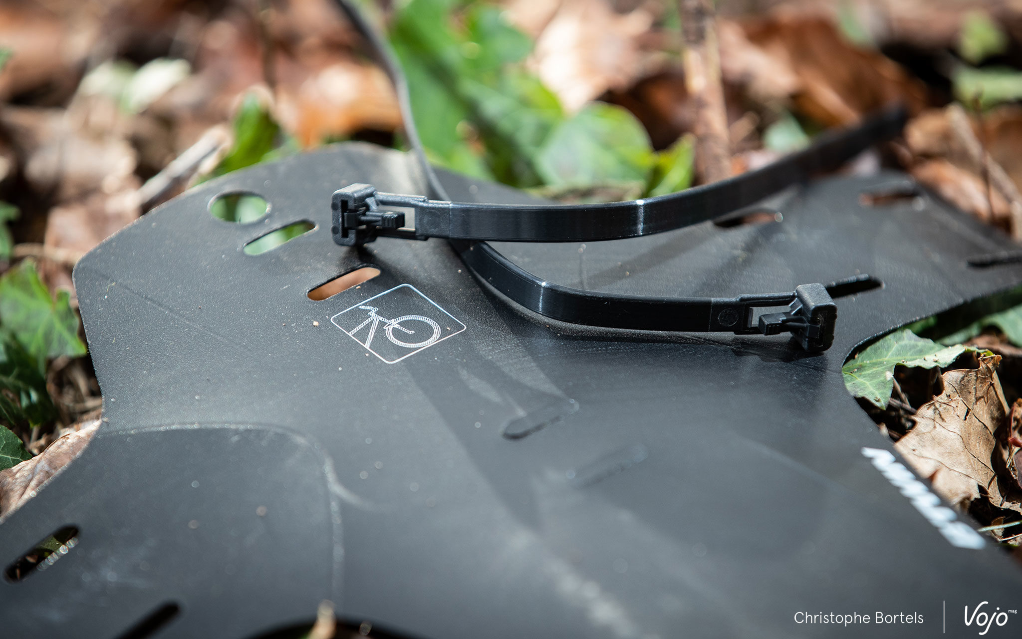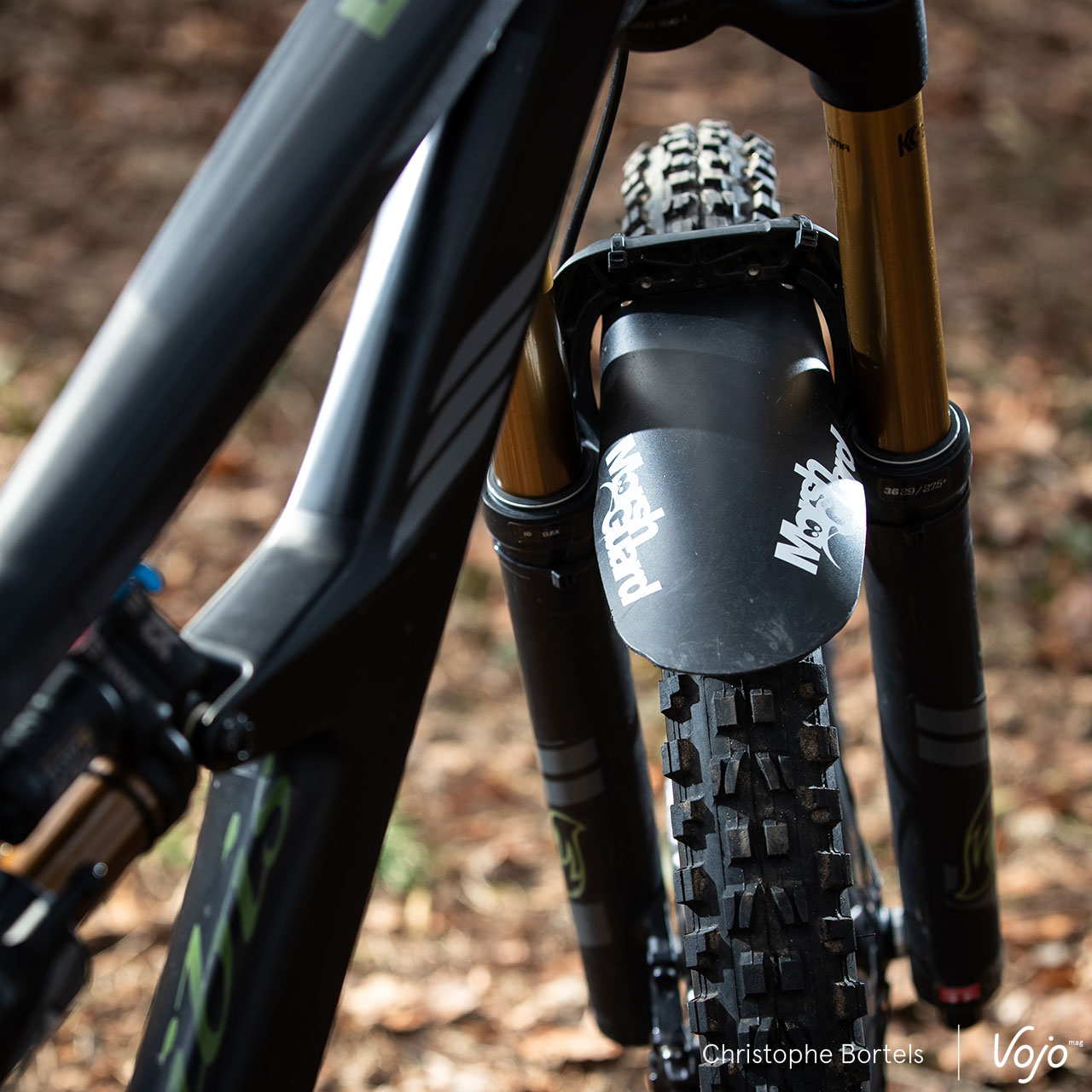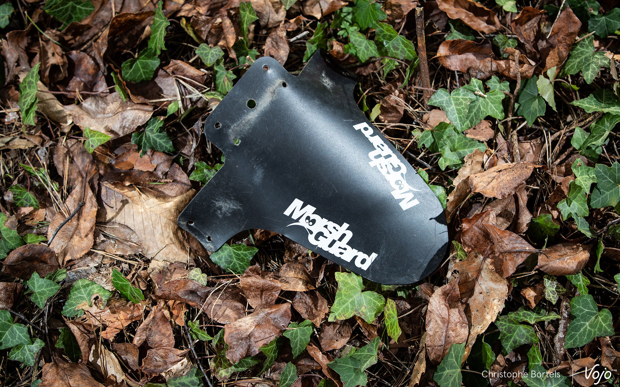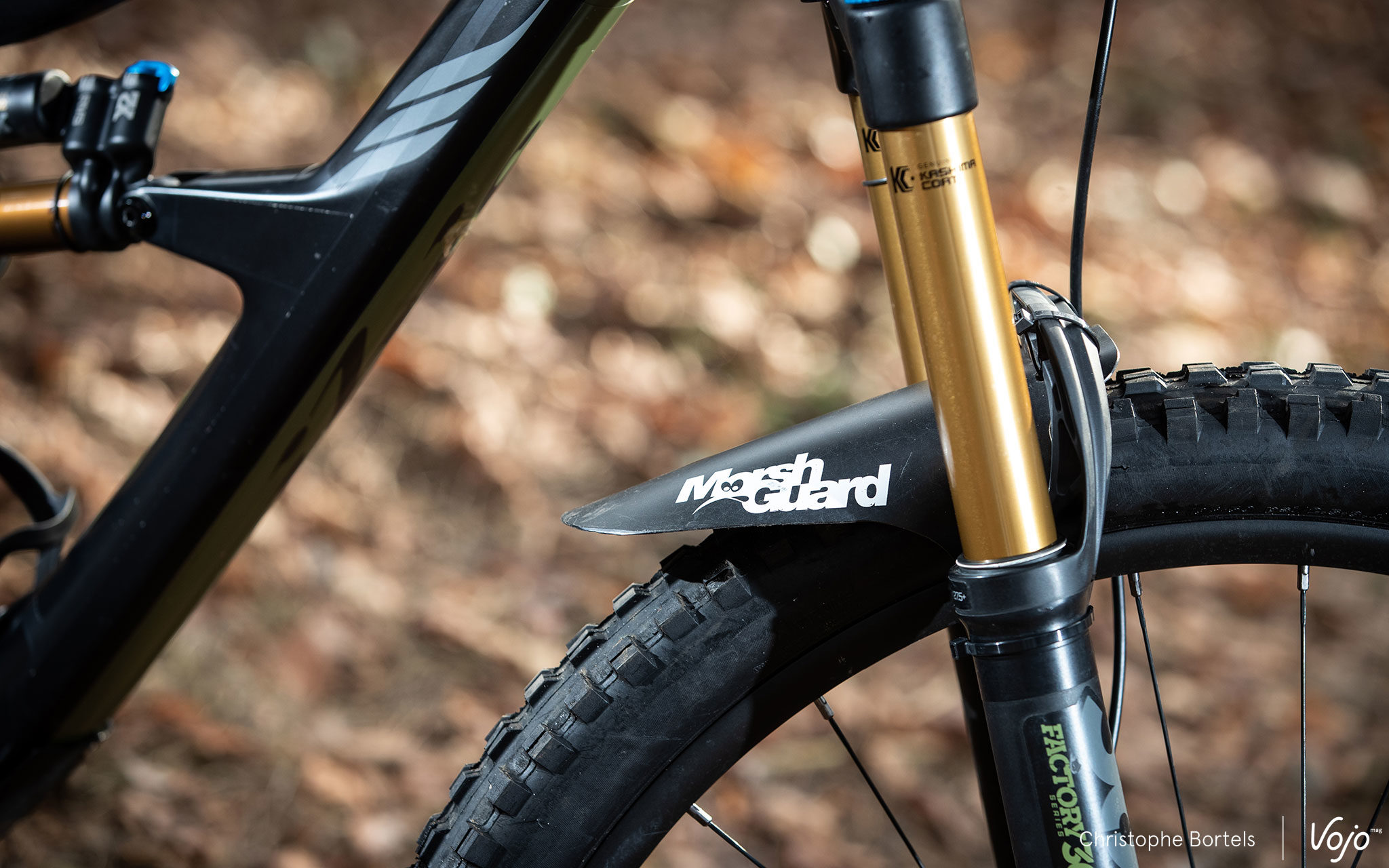 On ne sait pas si c’était le premier du genre, mais c’est sans aucun doute le MarshGuard qui a popularisé ce type de garde-boue avant à fixer sur l’arceau de fourche, et c’est probablement toujours celui qu’on voit le plus sur les VTT actuellement. Il faut dire que niveau look, il n’y a pas trop de prise de risque avec un design discret et tout en rondeurs qui ne dénature pas les lignes du vélo. La seule fantaisie peut éventuellement venir du lettrage disponible en divers coloris, du noir sur noir au rose en passant par quelques autres couleurs à assortir à son cadre ou sa fourche. Comme pour la plupart des garde-boue du genre, le MarshGuard arrive « à plat », il faut donc le courber pour qu’il prenne sa forme et ensuite le fixer à l’aide de serre-câbles (non fournis) à l’arceau et aux fourreaux de la fourche. Les perçages sont bien placés et permettent de faire coller le garde-boue au plus près de la fourche pour optimiser le dégagement, on peut ensuite « régler » la hauteur par rapport au pneu derrière la fourche en faisant tourner légèrement les fixations au niveau des fourreaux.