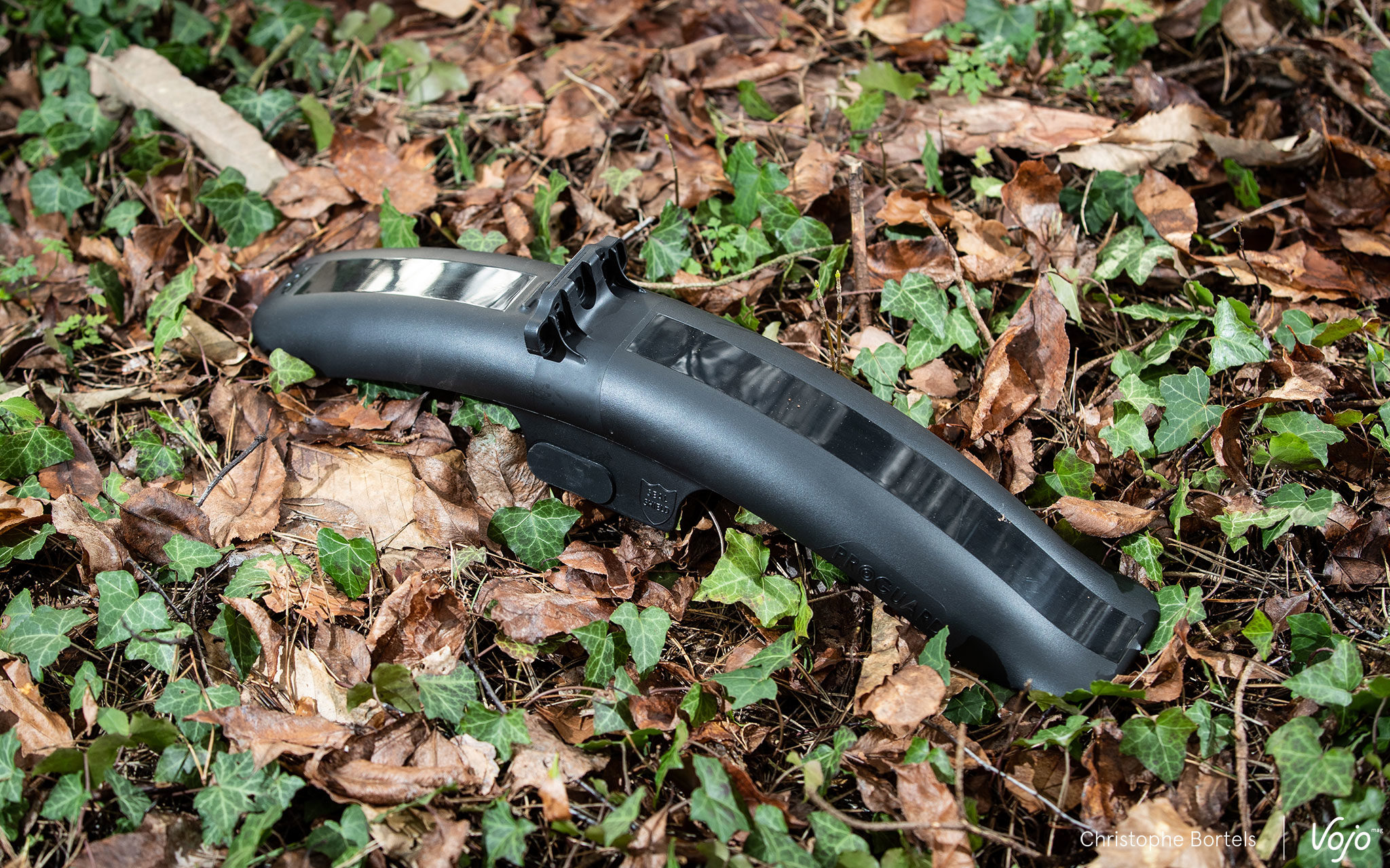 Niveau protection, malgré une longueur réduite (22,5 cm dans cette version 275 très légèrement plus grande que le modèle d’origine) et le fait qu’il ne dépasse pas vers l’avant de l’arceau, il fait le job plutôt correctement. Les projections vers l’avant sont réduites dans la plupart des situations et sa conception fait qu’on épargne également les joints-racleurs et les plongeurs. C’est clairement le genre de modèle passe-partout qui convient à la plupart des disciplines et qu’on aurait tendance à laisser sur le vélo toute l’année. Il trouve par contre ses limites dans des conditions très humides où sa couverture est clairement insuffisante. Il n’y a alors pas de miracle, mais c’est bien normal pour un modèle finalement plutôt minimaliste.