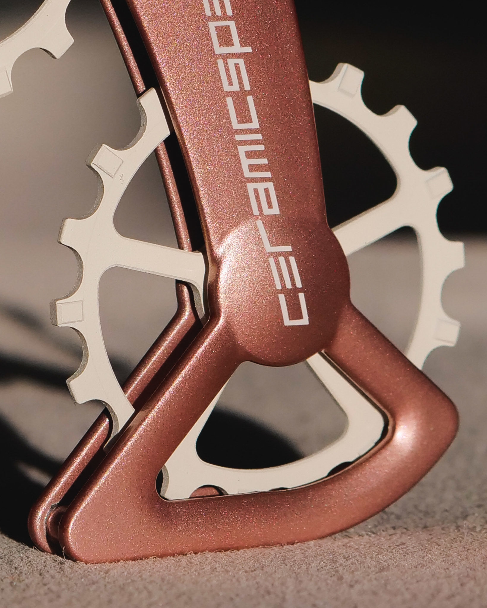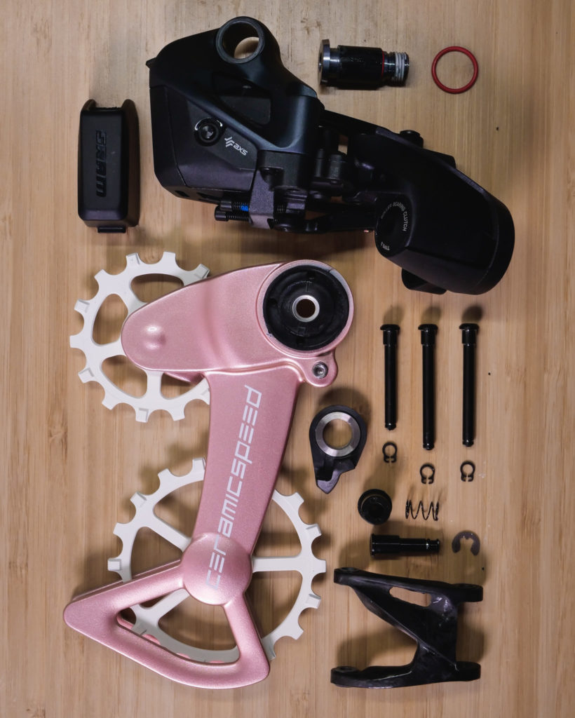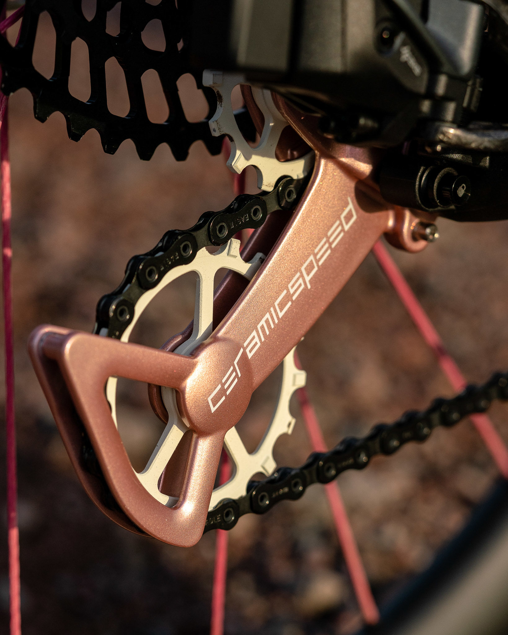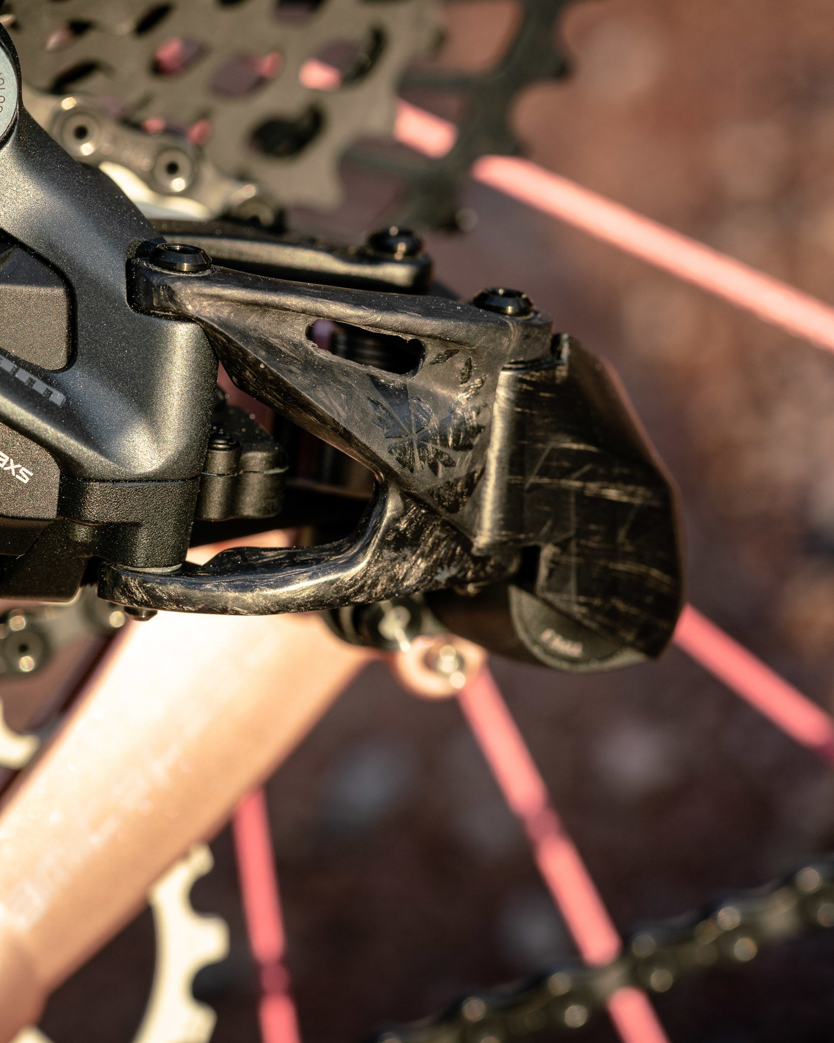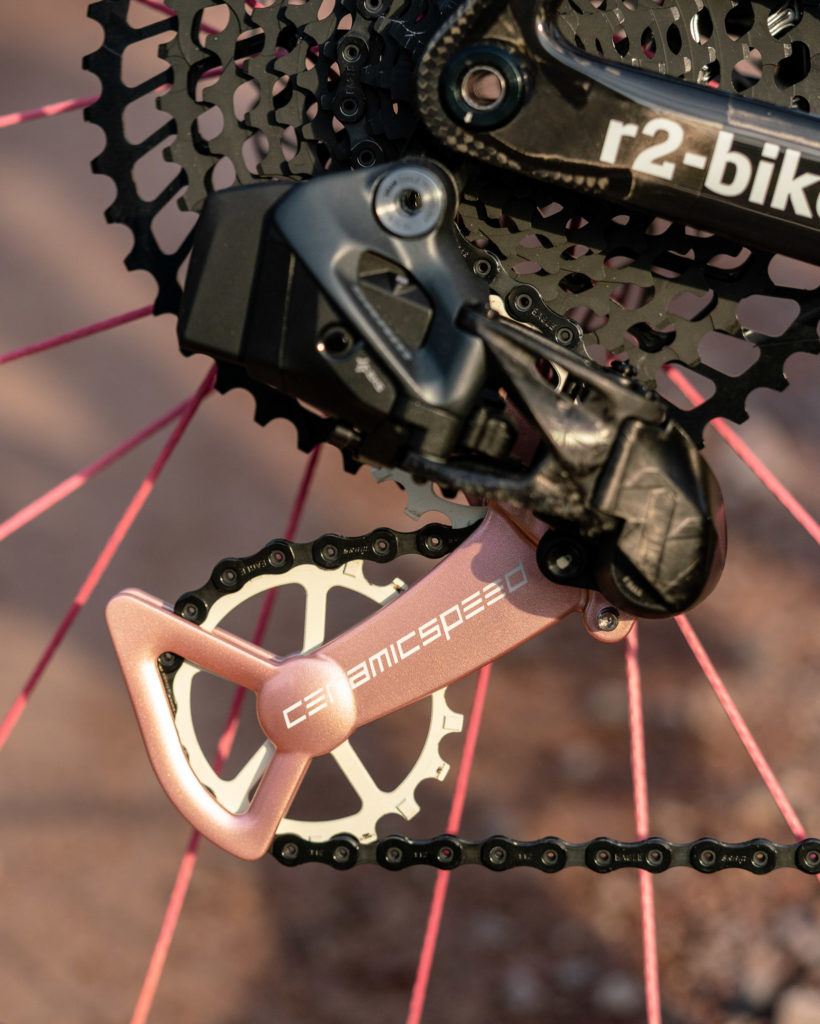 Pour la transmission, comme d’habitude c’est un dérailleur Sram qui a été retenu et comme d’habitude, il n’a plus grand chose à voir avec le modèle d’origine. Le X01 AXS Eagle a été largement modifié avec des pièces Hopp en carbone afin de gratter quelques grammes sur le corps et une chape CeramicSpeed OSPW, dotée comme une cerise sur le gâteau de galets recouverts d’un traitement Cerakote (film à base de céramique) blanc.