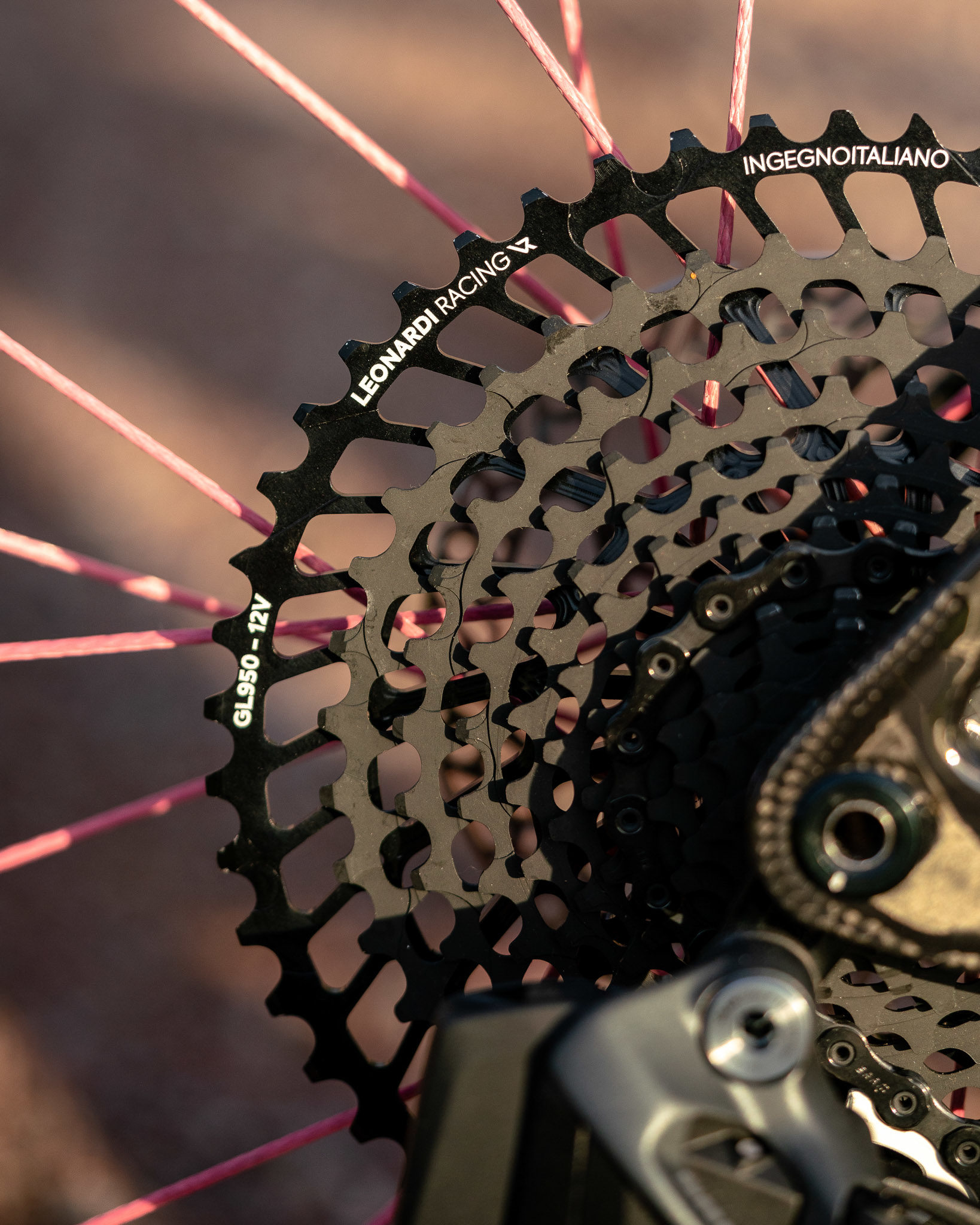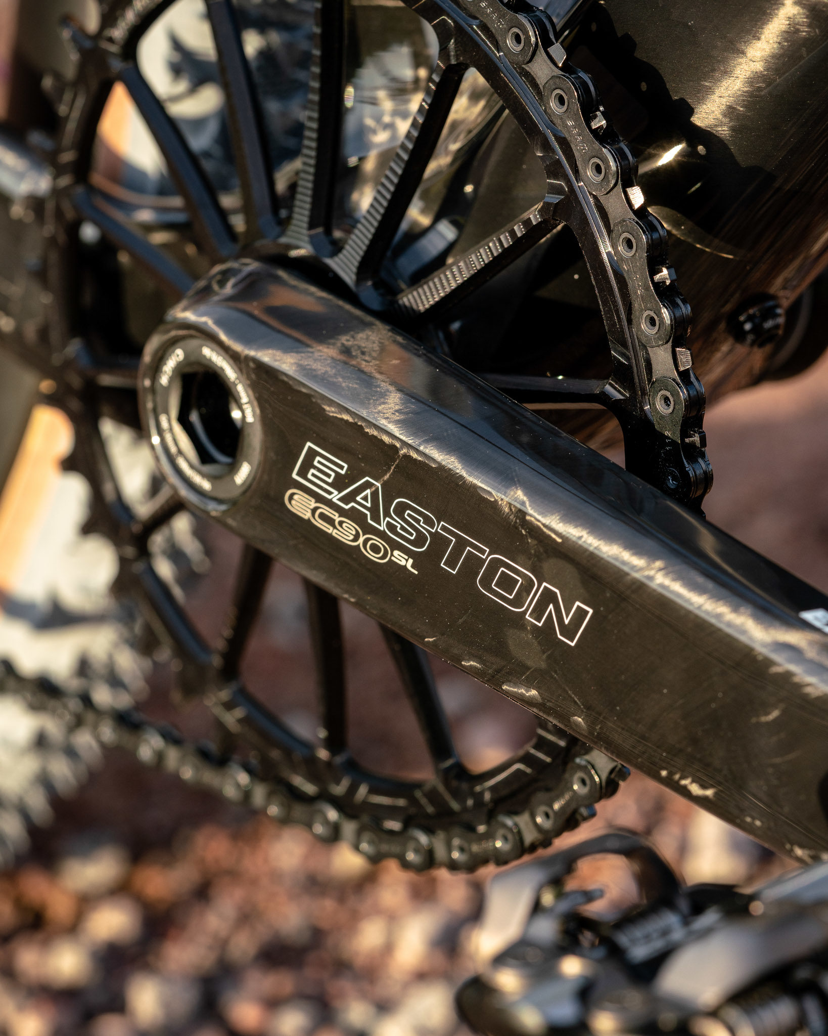 Il s’articule autour d’une cassette Leonardi General Lee en 9-50 (« un essai », confie Gustav) et d’un pédalier Easton EC90 SL, lui aussi gratté et verni pour s’assortir à la finition du cadre. Le plateau est un Garbaruk en 42 dents et le boîtier de pédalier est signé CeramicSpeed, comme la chape.