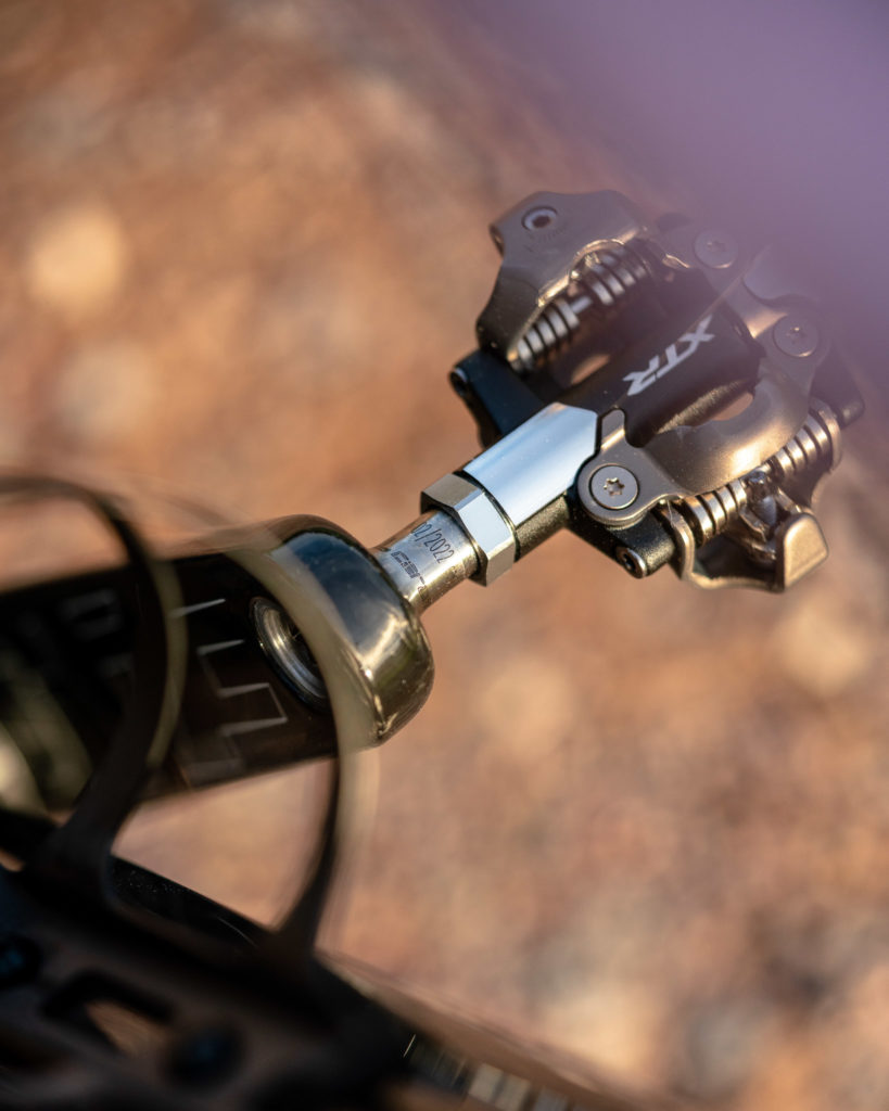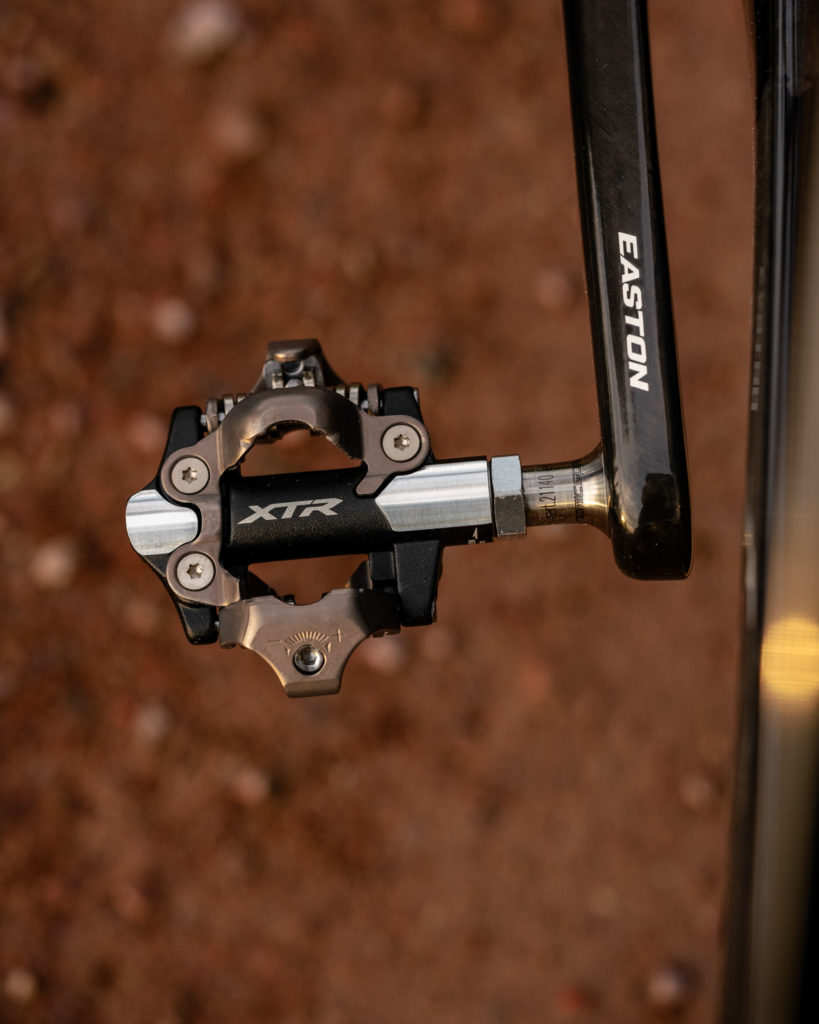 Au bout des manivelles, on trouve des pédales Shimano XTR d’apparence tout à fait normales mais en réalité très exclusives. Il s’agit d’une édition spéciale réalisée par r2-bike.com, site allemand partenaire de Gustav, et produite à seulement 13 exemplaires ! Les modifications ? Des axes en titane réalisés par METI en Italie et des roulements CeramicSpeed, encore une fois.