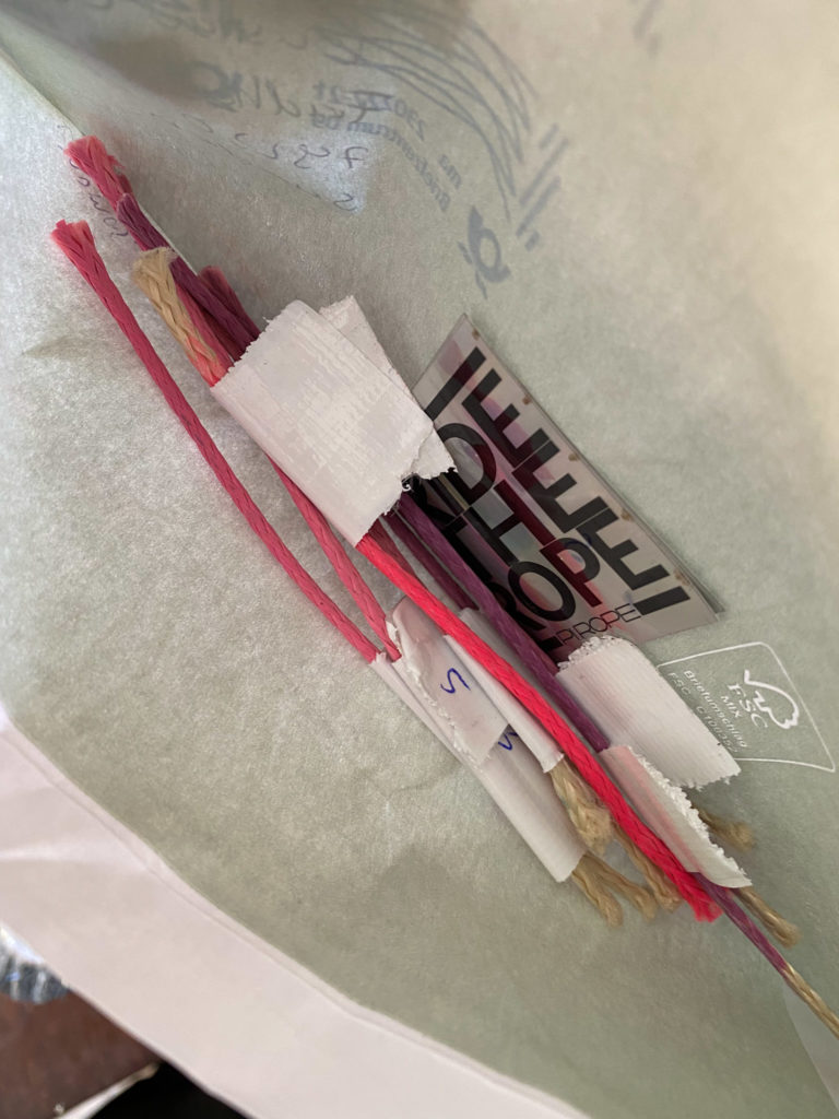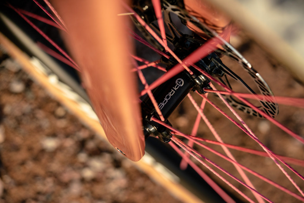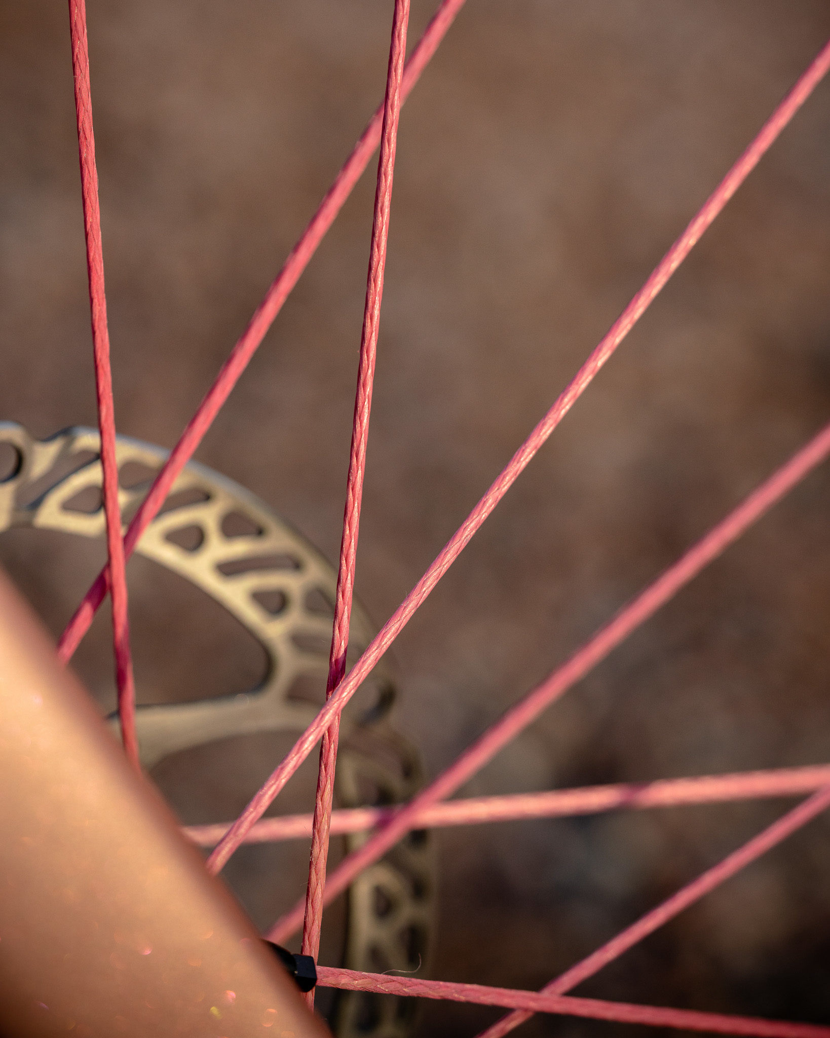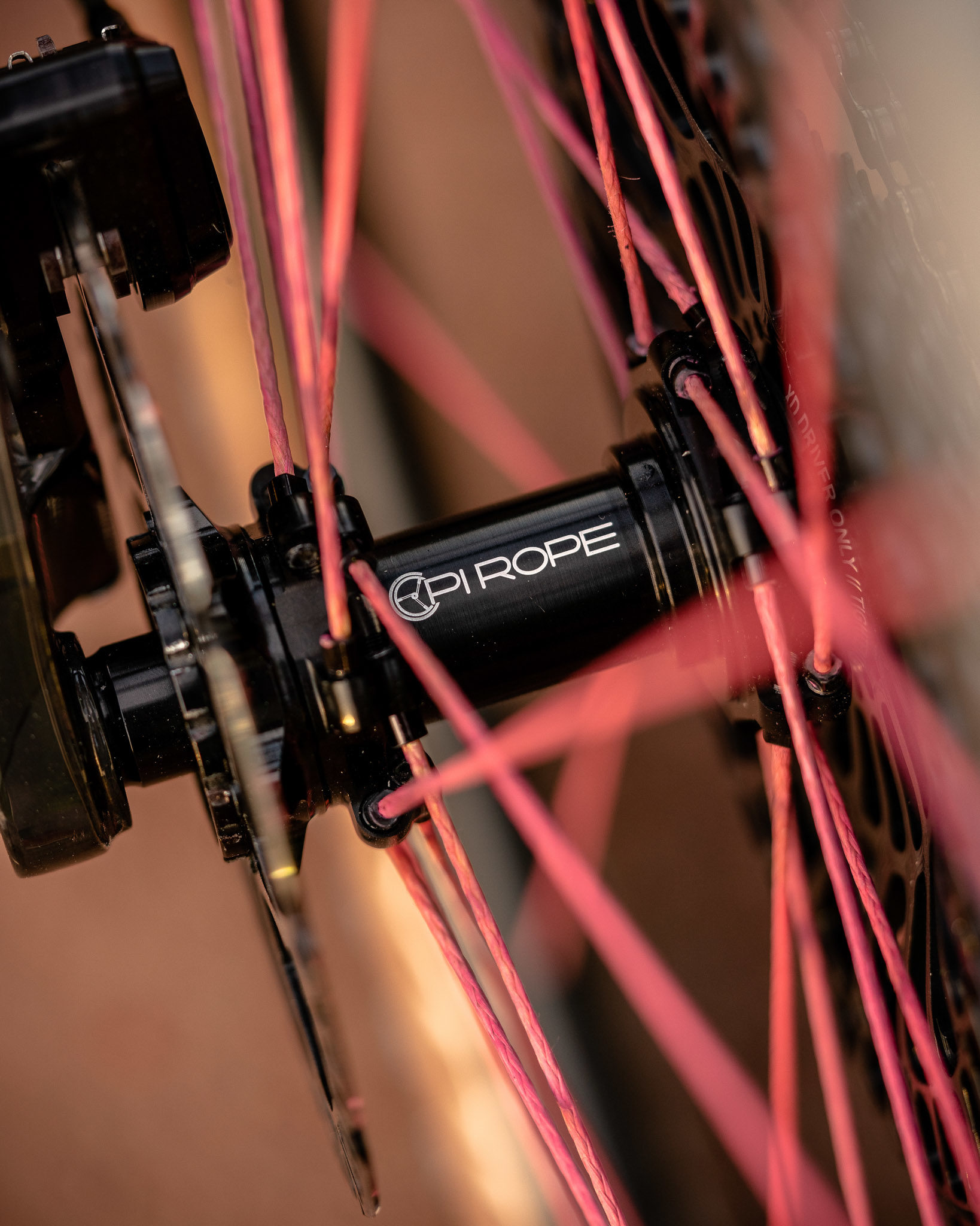 Autre avantage, la fibre peut être teintée dans n’importe quelle couleur ou presque et après quelques essais, c’est un rose qui fait écho au reste du montage qui a été retenu. Les moyeux sont également de chez Pi Rope, spécialement conçus pour s’adapter à ces rayons.