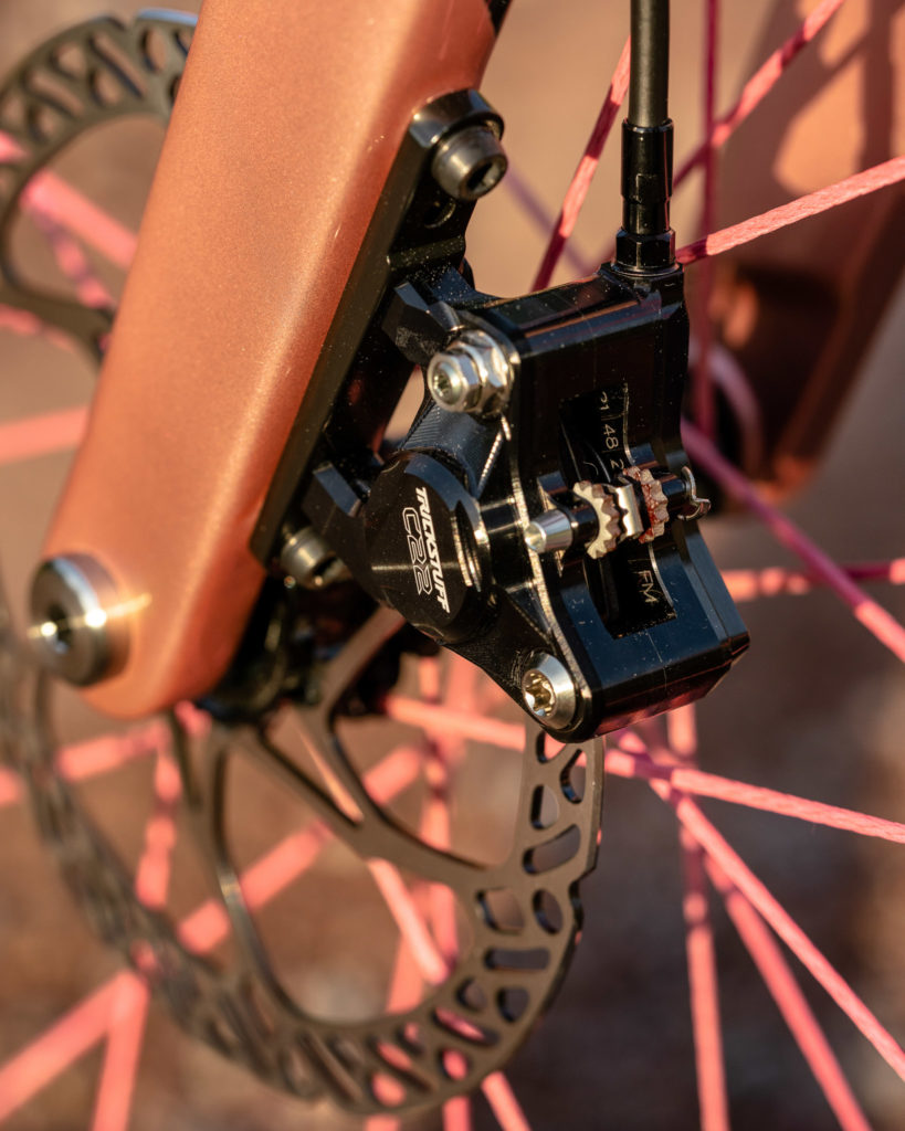 Côté freinage, Pernilla et Gustav n’ont pas eu le choix des manettes (des Sram Force AXS), indissociables des shifters en route/gravel mais le tandem s’est « rattrapé » sur les étriers : ce sont des Trickstuff C22, disponibles en version Sram ou Shimano (et même Magura, Rotor ou Campagnolo moyennant quelques modification sur les Durits) pour faire évoluer ses freins. Logiquement, les disques (160/140 mm) ont été eux aussi choisis chez Trickstuff, modèle Dächle UL, pour Ultra Light…