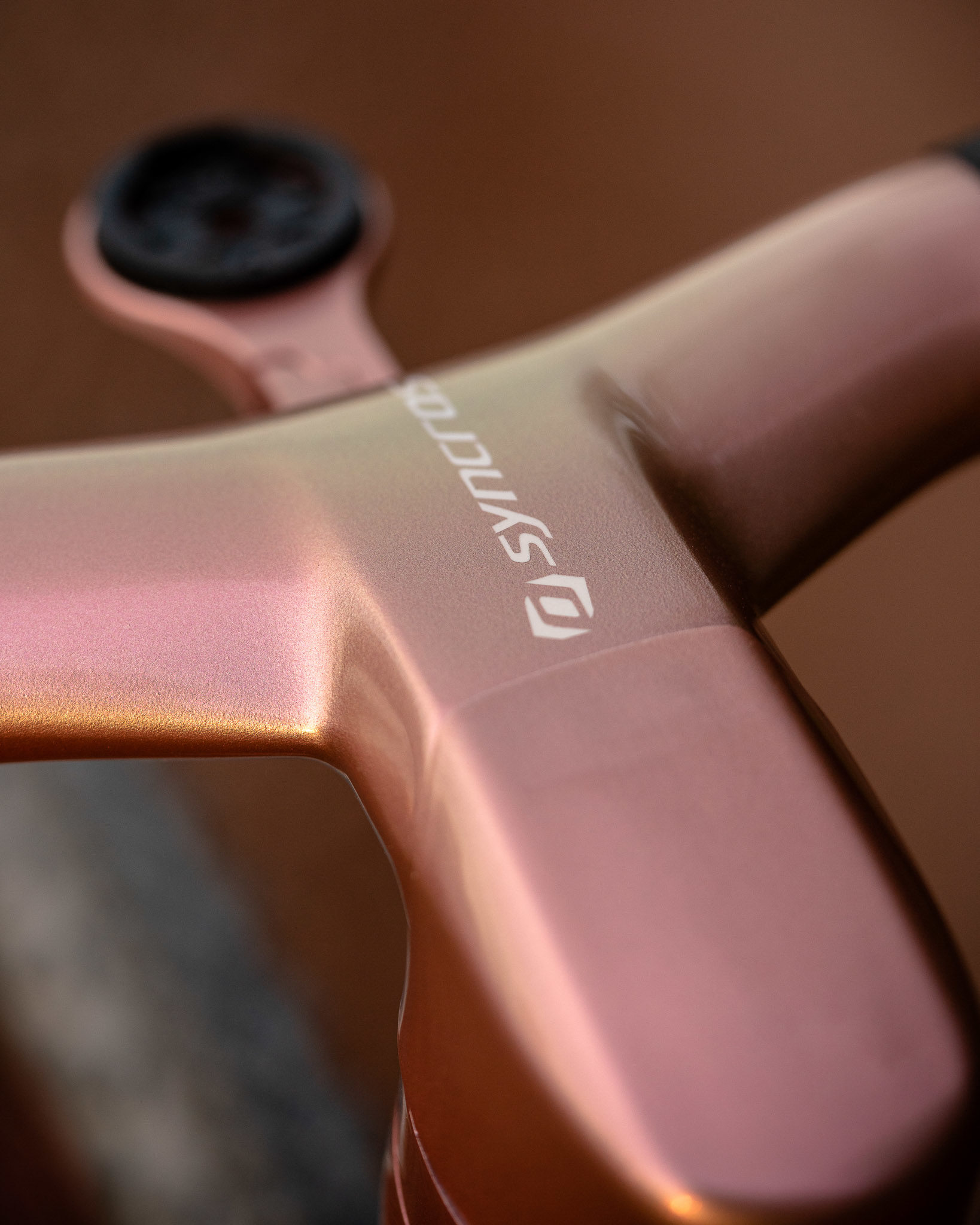 Les périphériques, tous signés Syncros, ont droit au même traitement. Et si la tige de selle séduit avec cette petite touche de noir qui vient prolonger le tube de selle, que dire du poste de pilotage en une pièce intégralement recouvert de cette peinture unique… Comme toujours, aucun détail n’a été oublié et le collier de serrage de la tige de selle comme les entretoises de la potence s’intègrent parfaitement dans cette finition.