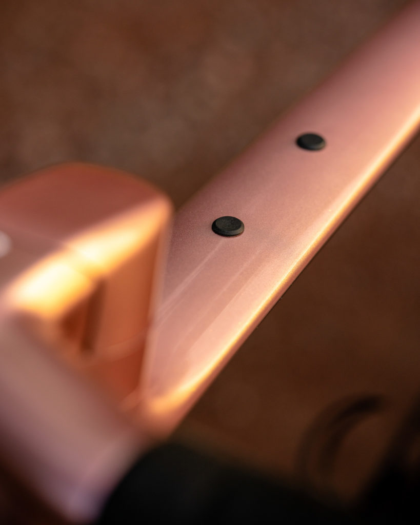 Reste qu’un vélo tout noir, cela peut-être un peu triste, surtout quand on a pris l’habitude de jouer avec des peintures exceptionnelles. La fibre est donc mise en valeur par une complexe peinture rose sur le haut et l’avant du vélo. De profil, ce n’est qu’un liseré qui contraste de belle manière avec le noir du carbone mais vu du dessus, c’est bien tout le vélo qui paraît rose.