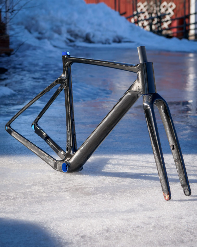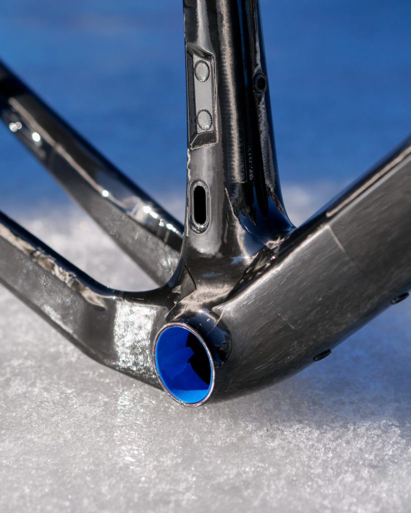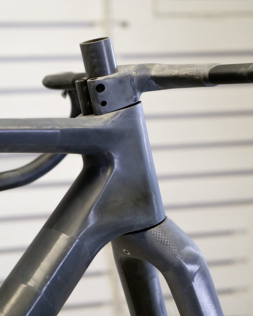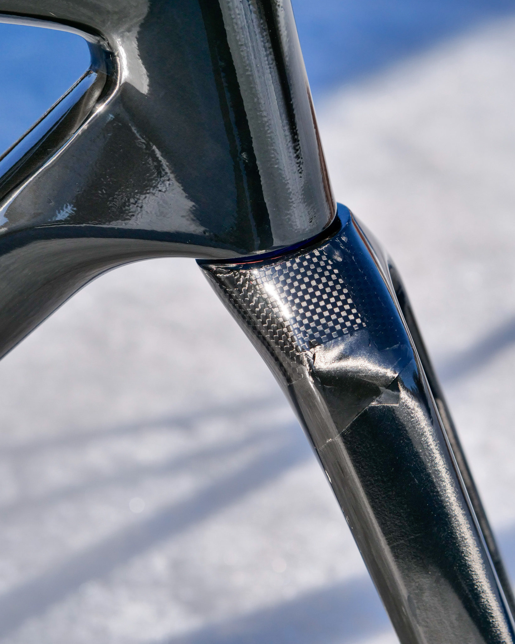 Presque d’origine car comme d’habitude, la finition a été entièrement retirée pour céder la place à quelque chose de bien plus exclusif. Adieu la peinture bi-ton rose, Pernilla a choisi de mettre en avant la fibre nue pour ce vélo. Le carbone est donc laissé nu sur la plus grande partie du cadre, seulement recouvert d’un vernis brillant qui permet au vélo d’afficher deux visages différents selon la luminosité, tantôt noir profond tantôt fibre apparente.