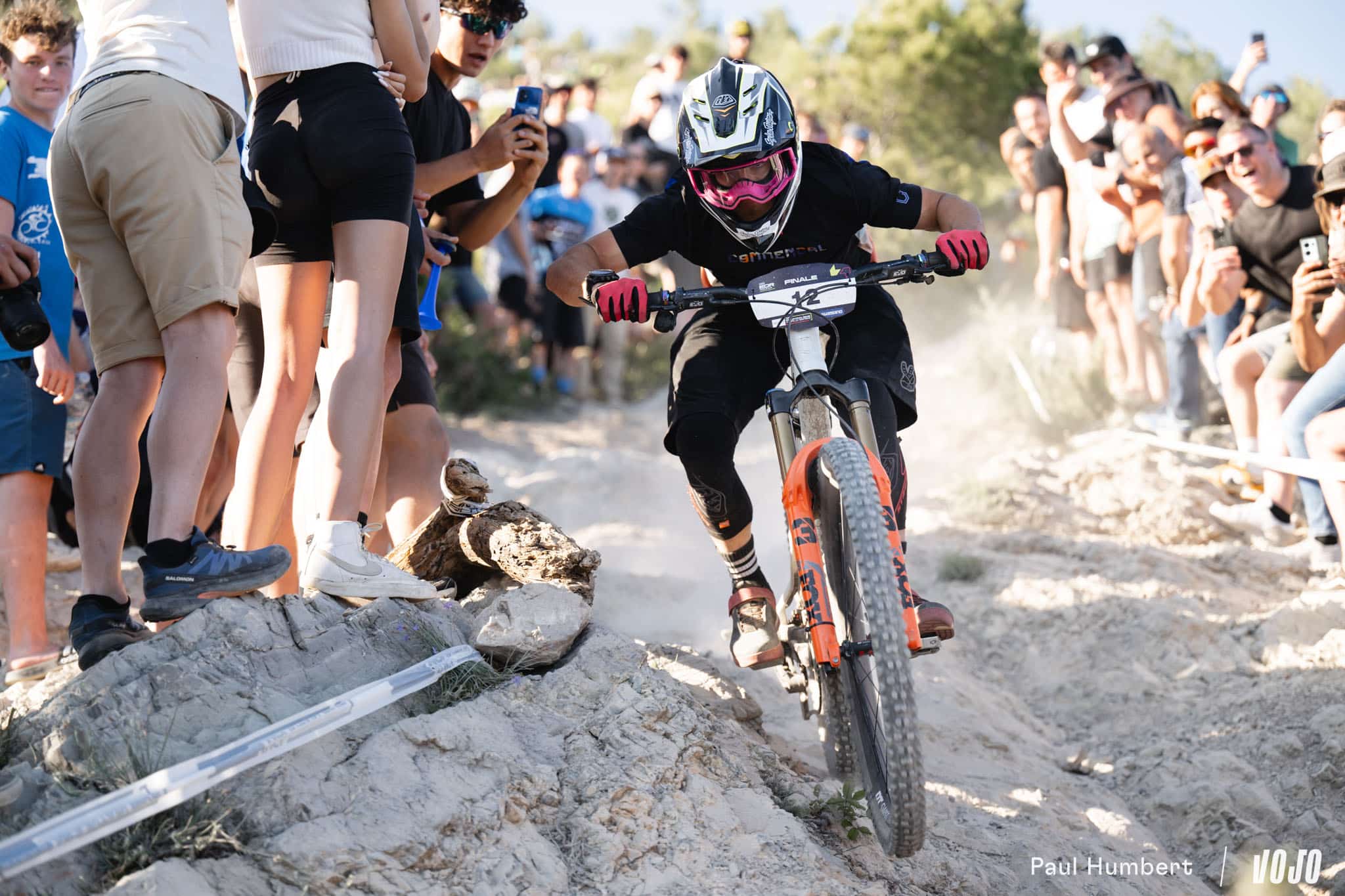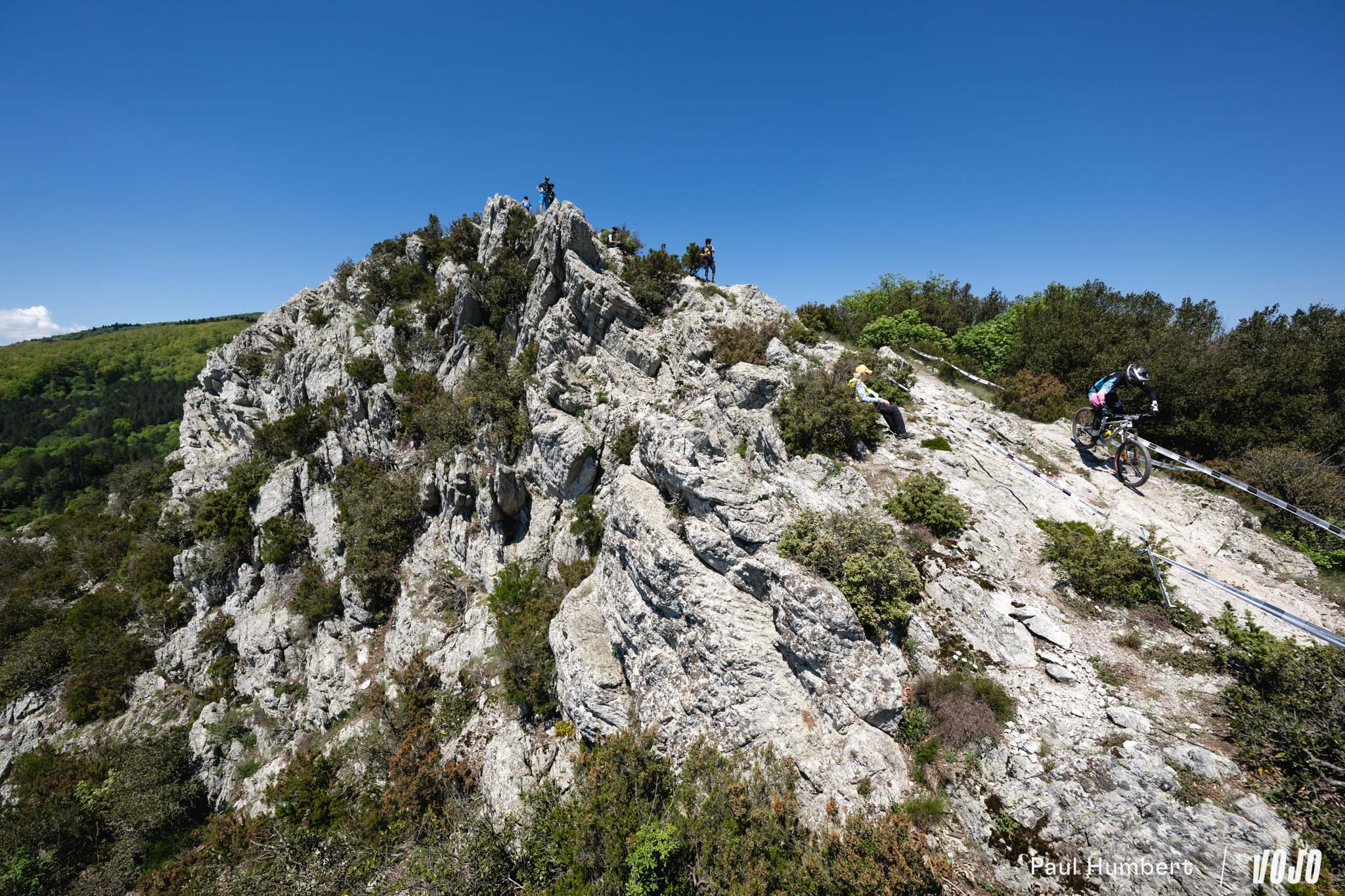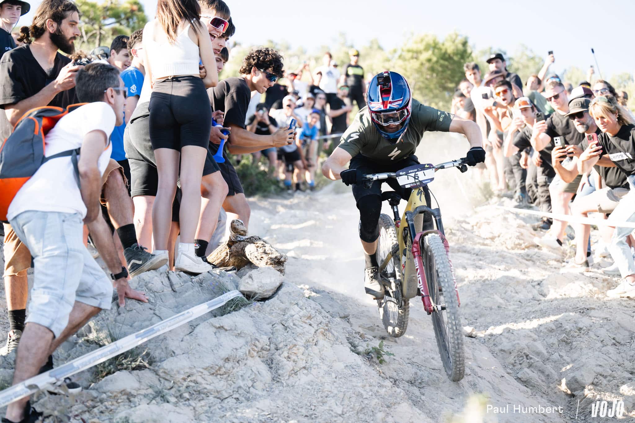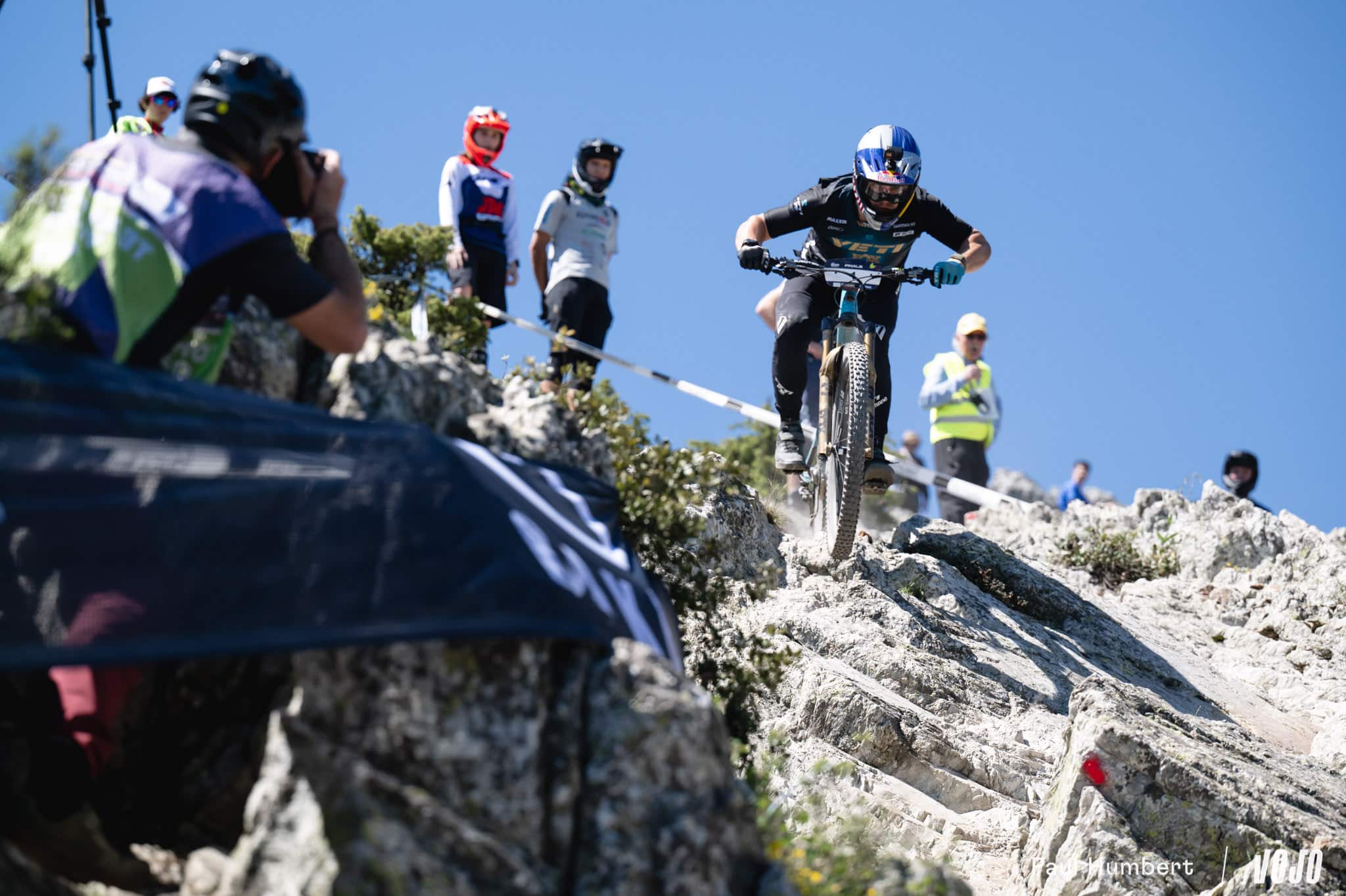 Si l’enduro devait avoir une spéciale iconique, ça serait « DH Men » : un nom désuet et un intérêt hors compétition assez limité, mais une des plus belle vues du sport. Dans le dernier pierrier, des centaines de spectateurs s’amassent.