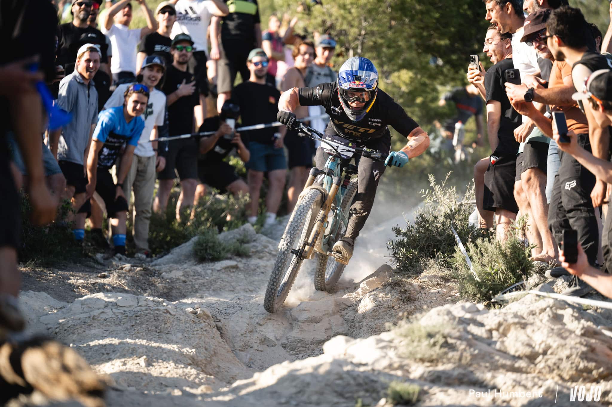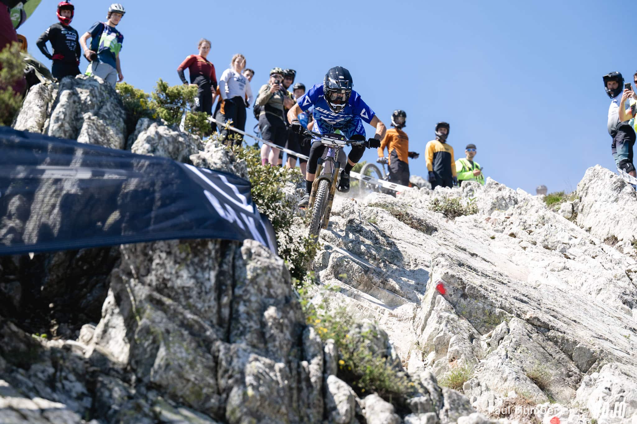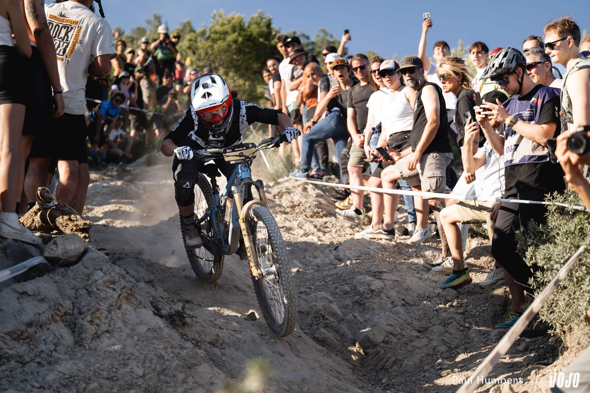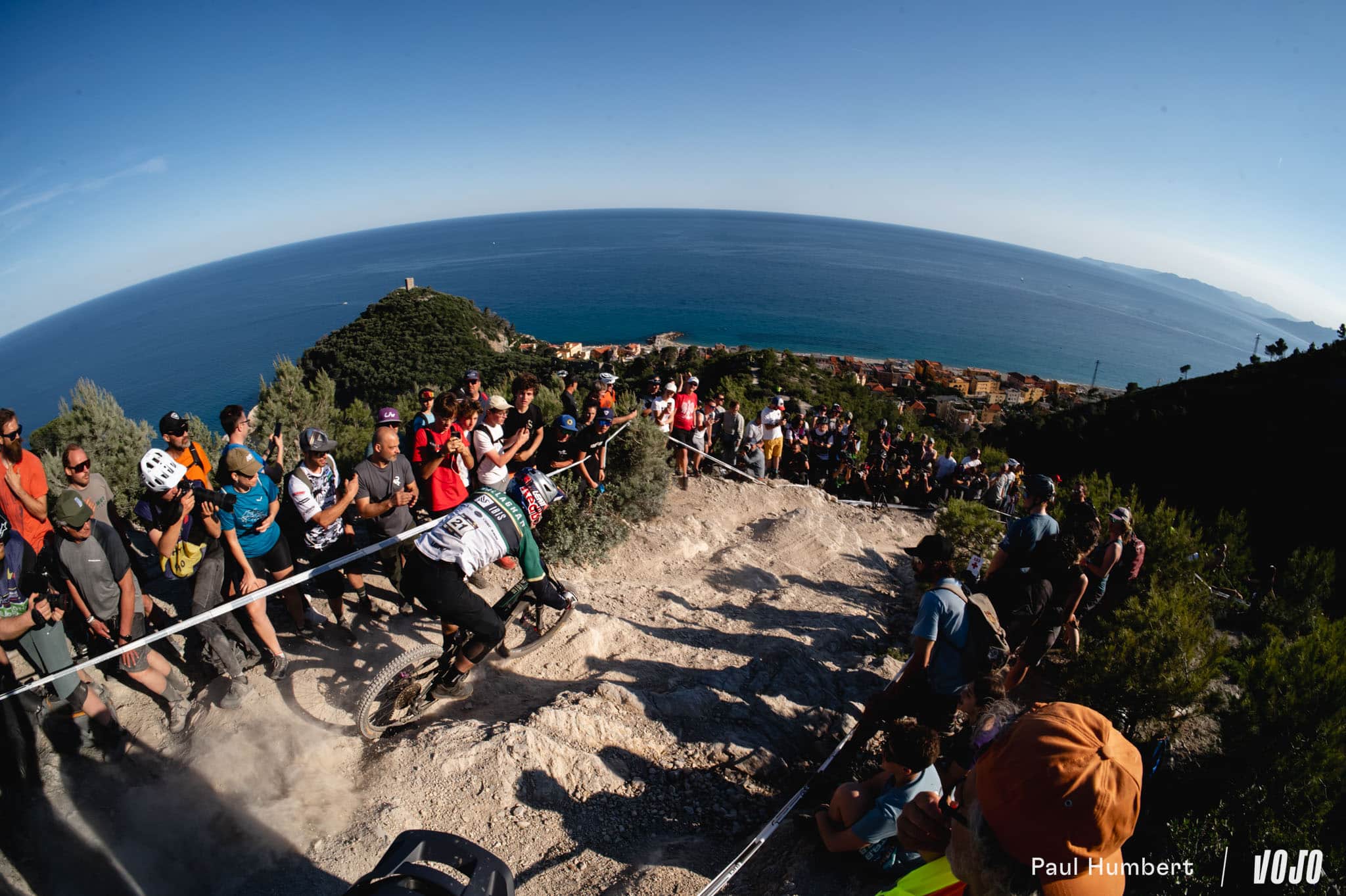 Si l’enduro devait avoir une spéciale iconique, ça serait « DH Men » : un nom désuet et un intérêt hors compétition assez limité, mais une des plus belle vues du sport. Dans le dernier pierrier, des centaines de spectateurs s’amassent.