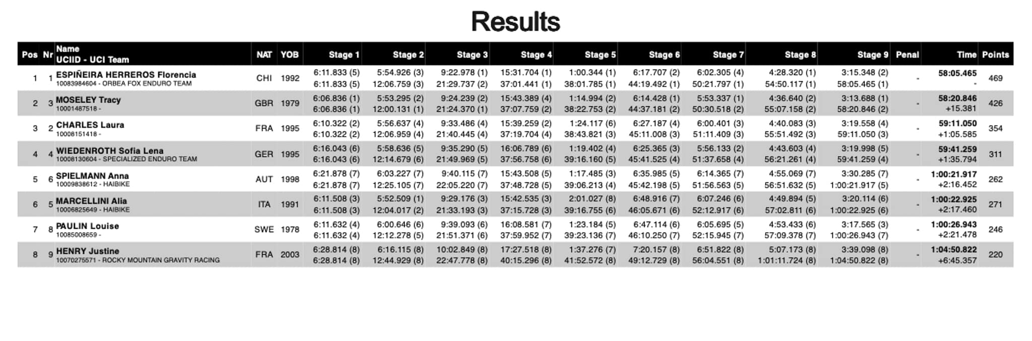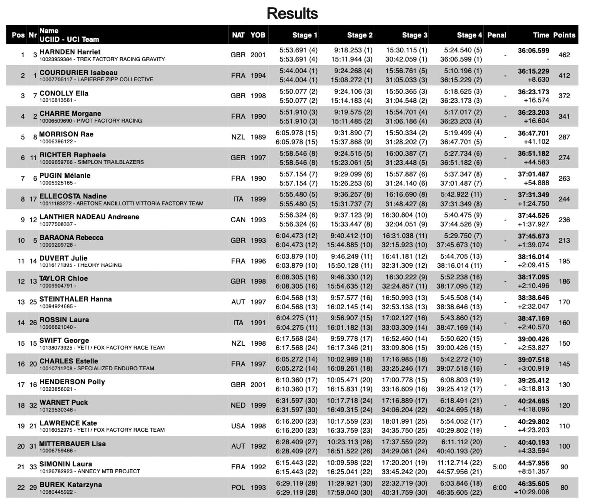 Ça ne suffira toutefois pas à rattraper le retard creusé par la pilote Trek. Harriet Harnden s’impose avec plus de 8 secondes au général : « Je ne pensais pas que ça arriverait. Je doutais de moi avant le début de la course, mais j’ai pu inverser ça et m’adapter à ce qui se présentait à nous. C’est ça l’enduro. »
