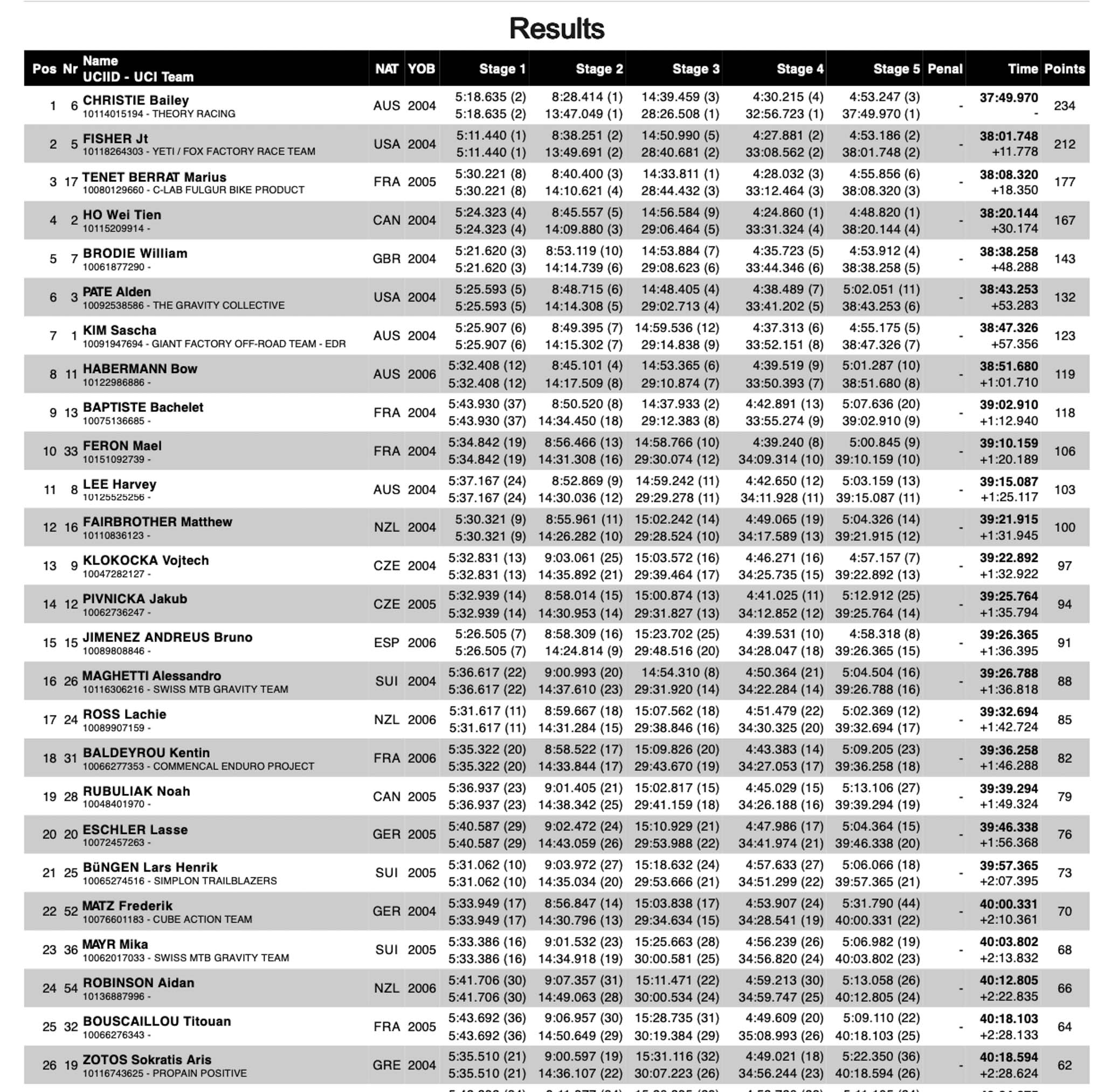 Chez les juniors hommes, c’est le jeune Bailey Christie qui l’emporte devant un autre pilote Yeti : Jt Fisher. On retrouve ensuite un Français à la troisième place : Marius Tenet Berrat monte sur le podium de Finale Ligure.