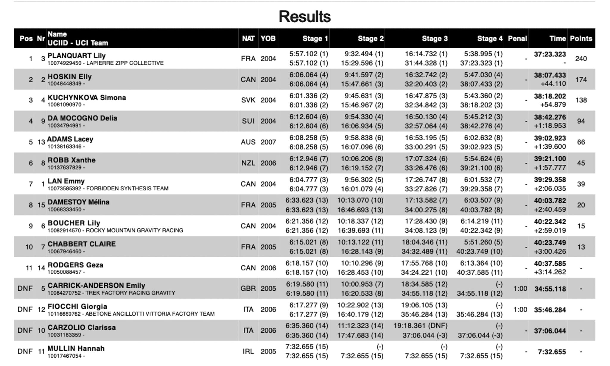Chez les dames, la victoire est tricolore : Lily Planquart s’impose avec une généreuse avance de 44 secondes sur la Canadienne Elly Hoskin. Simona Kuchynkova prend le bronze.