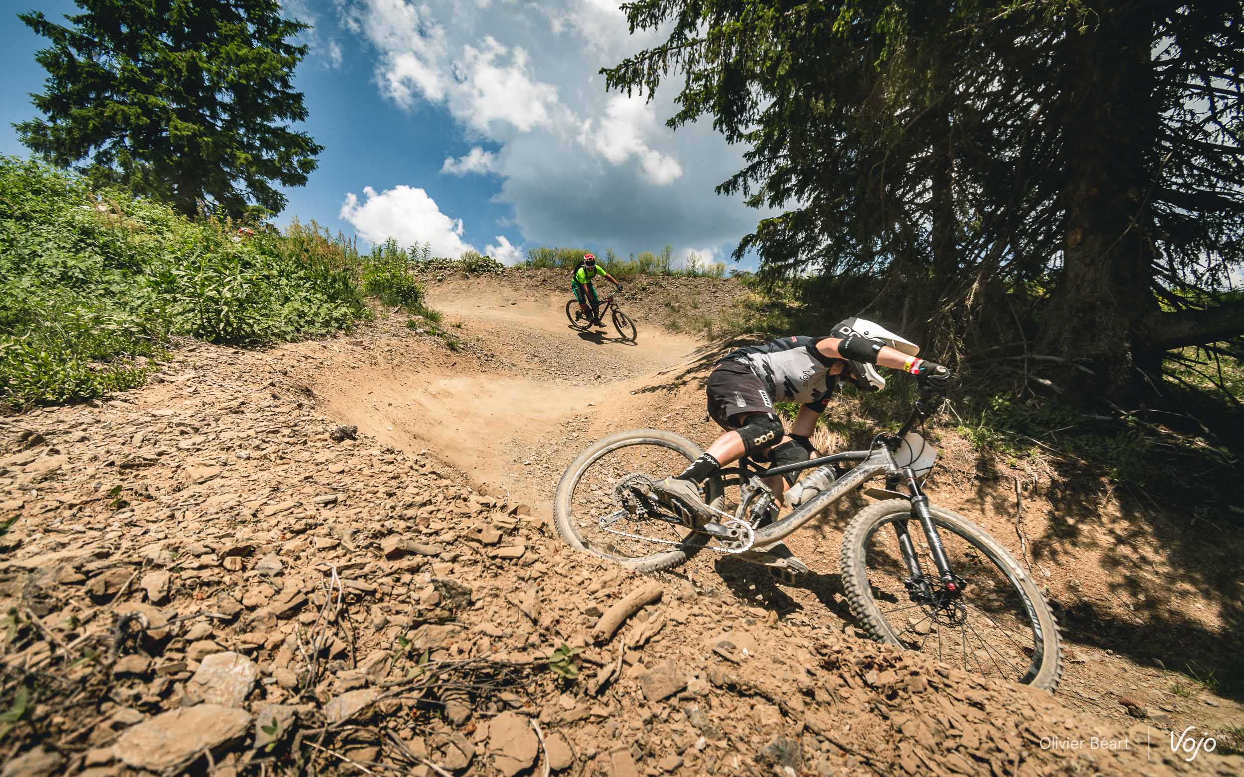 Notre nouveau rider tout frais se découvre alors un talent caché pour le pilotage, épaulé par les conseils aguerris de ses acolytes de la journée, Léo et Olivier : pierriers, racines, il passe tout ! Et sur le vélo s’il vous plait !