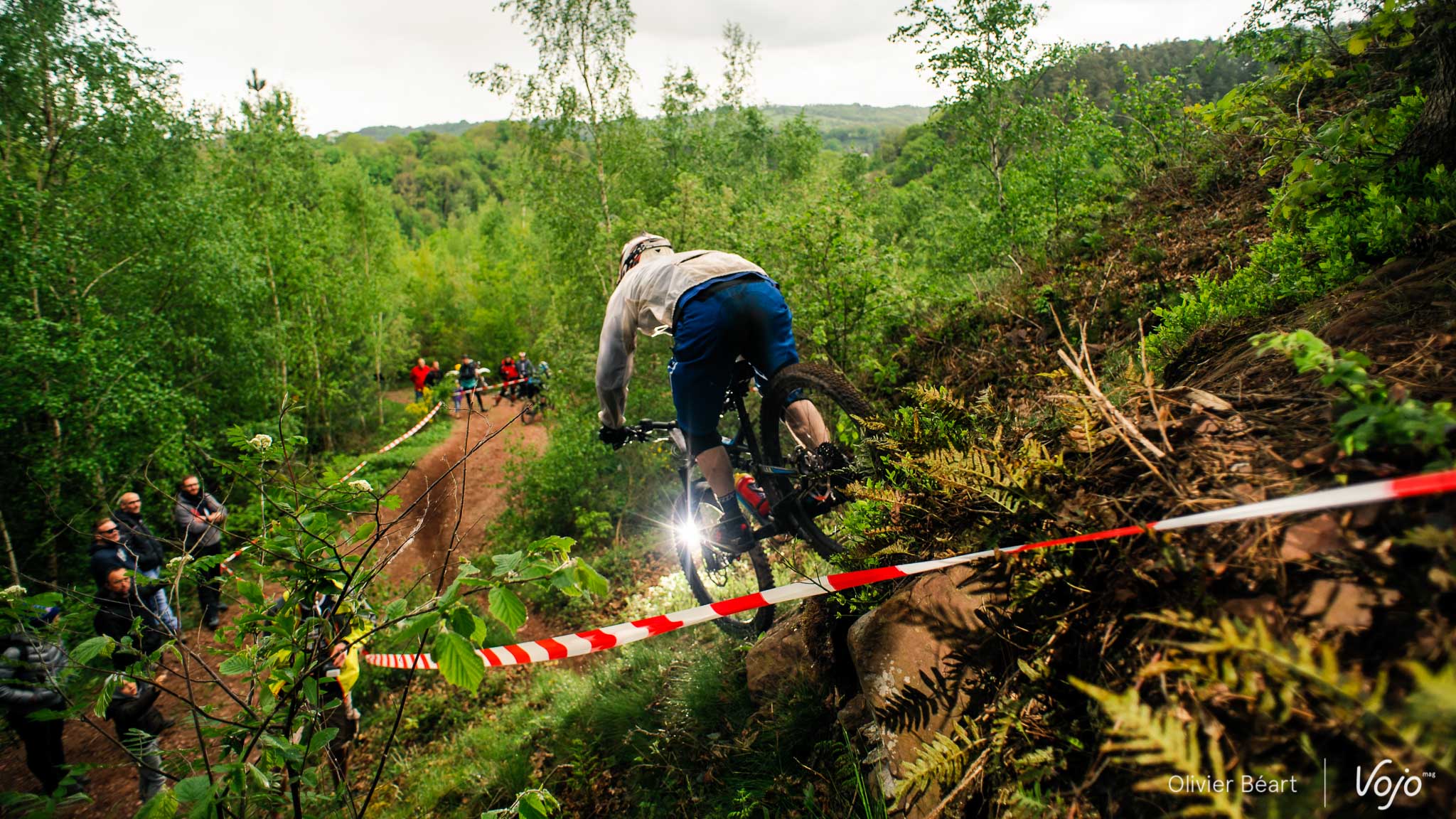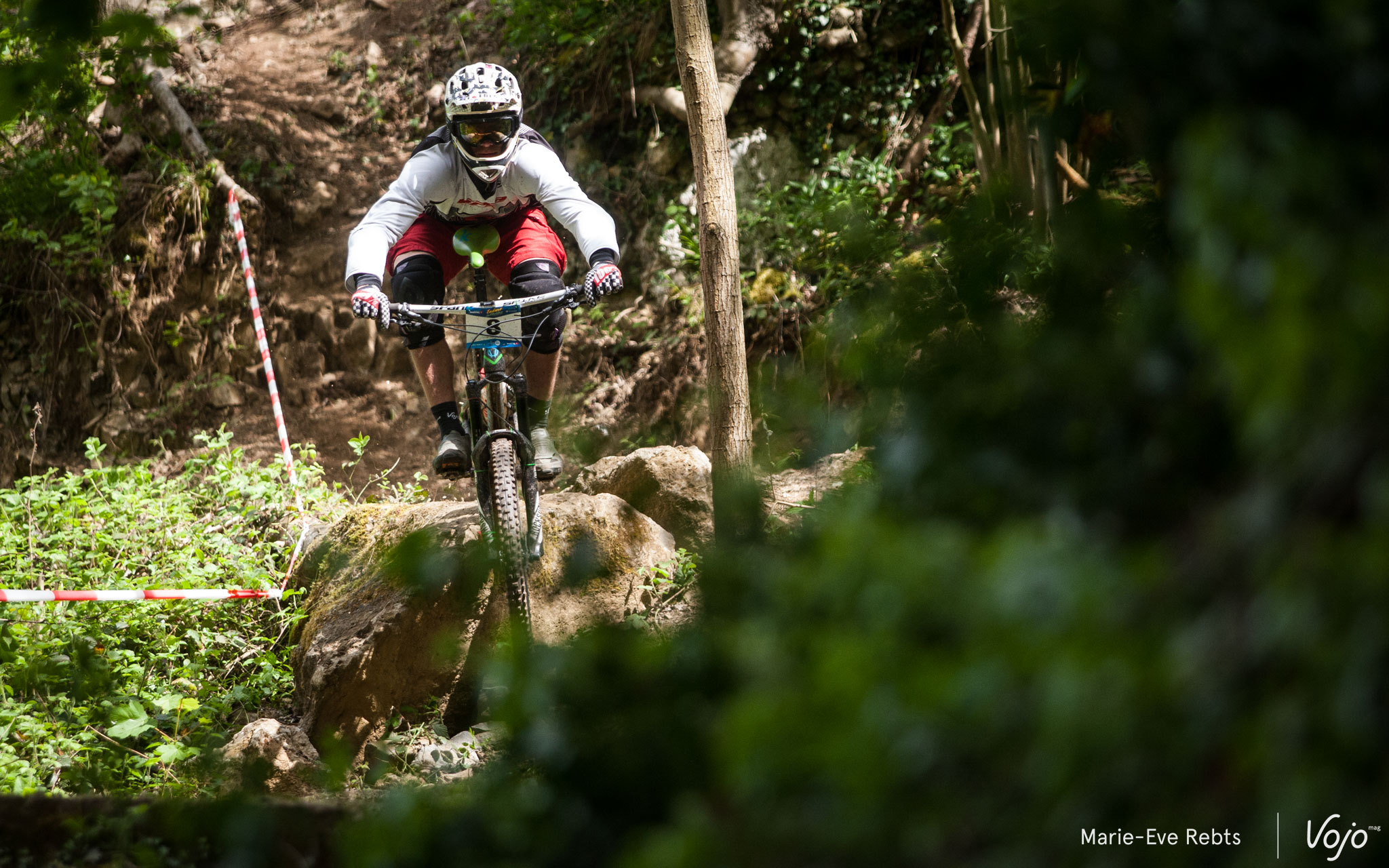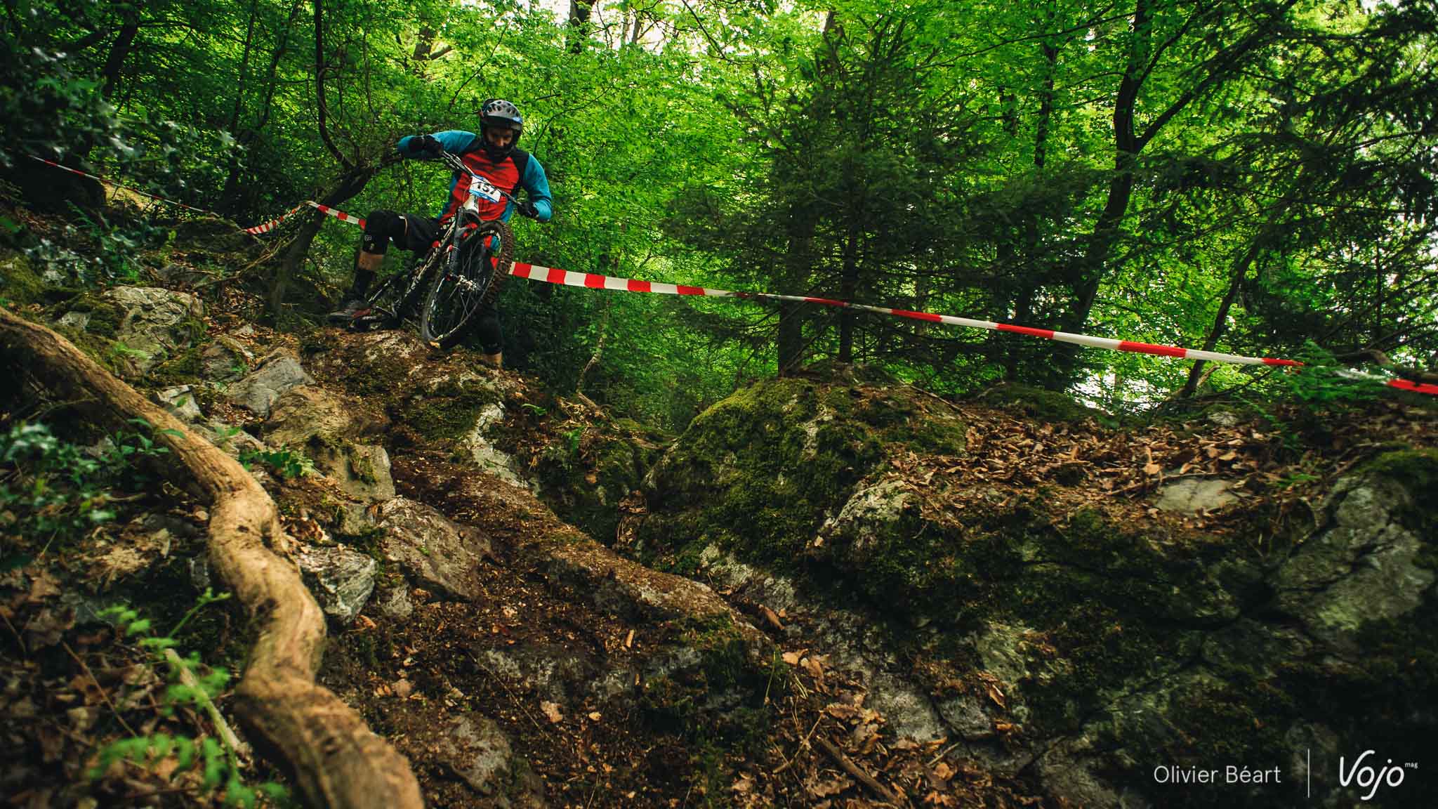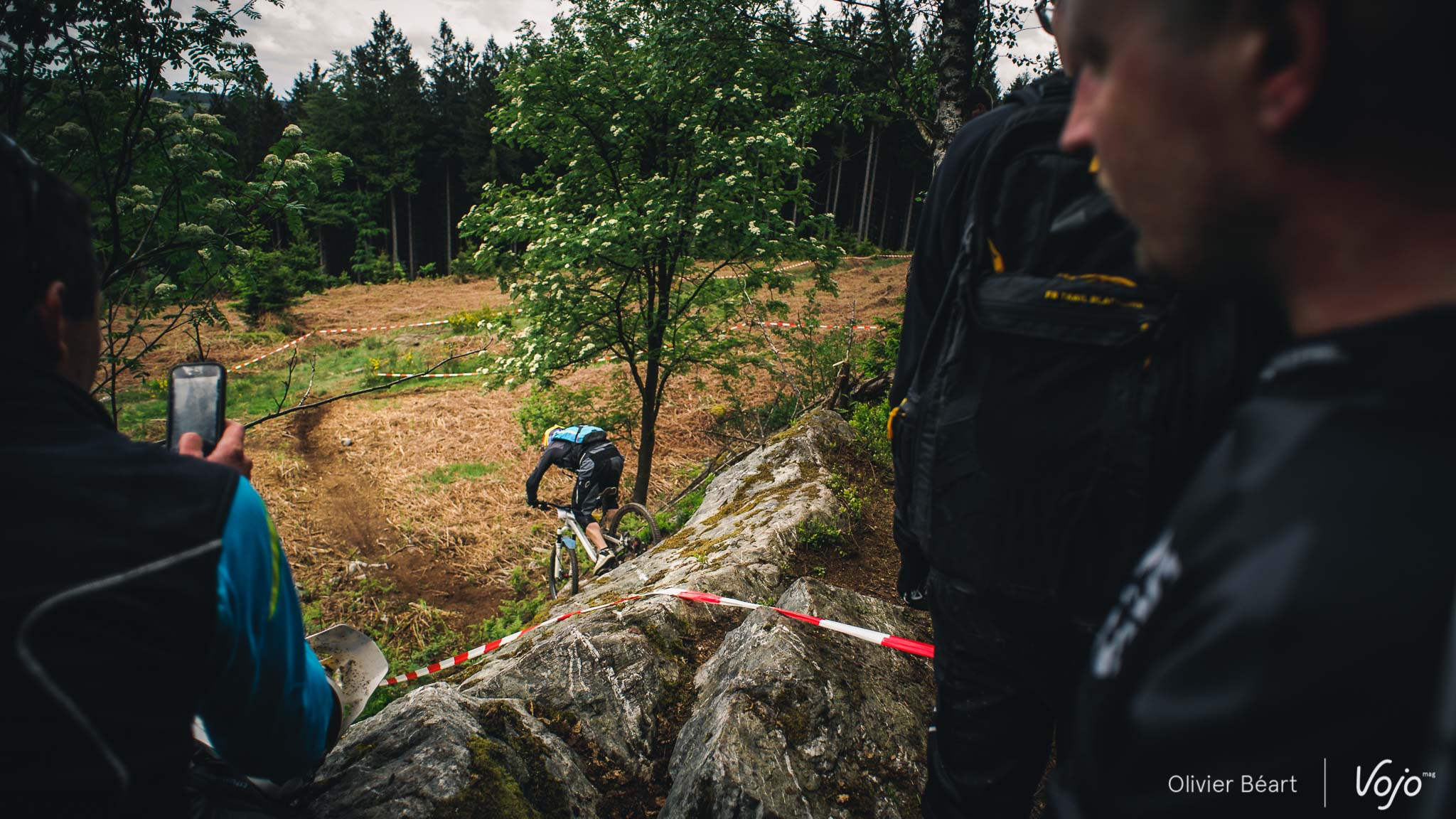 … quelques pierres au milieu… Et un final qui a causé une grosse frayeur à certains. Une racine placée à hauteur de cintre, le truc à côté duquel on passe 100 fois lors des repérages sans noter que ça peut être dangereux puis, en course, la voilà qui entraîne plusieurs chutes. La difficulté a rapidement été signalée ensuite mais on a évité le pire. Regardez cette petite vidéo pour vous rendre compte :