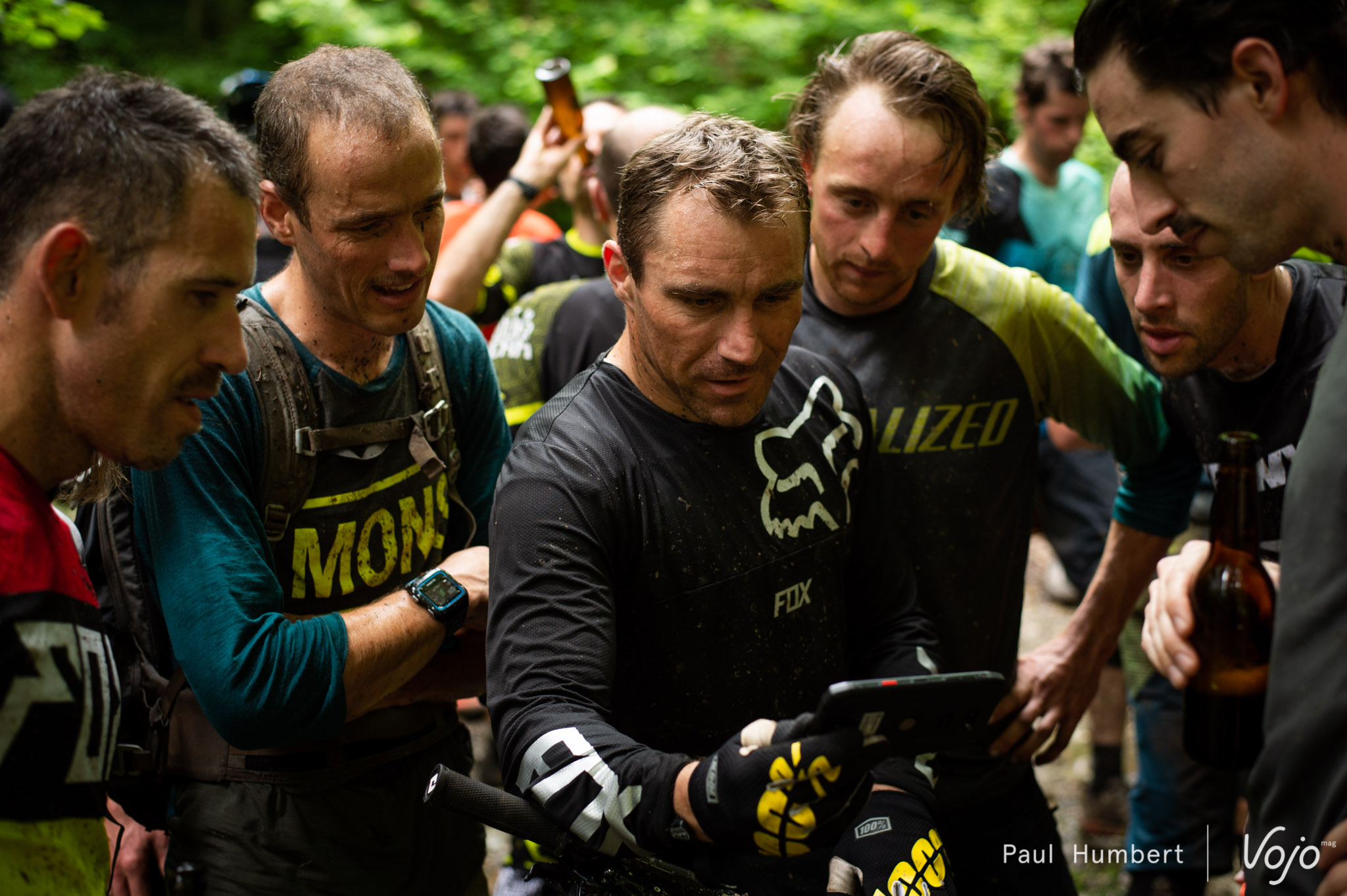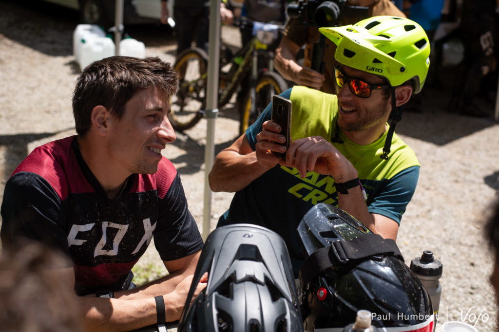 Par hasard, l’arrivée des pilotes coïncidait avec la fin de la manche de coupe du Monde de descente à Leogang. Les pilotes se sont donc rapprochés autour de Yoann Paccard pour regarder le run victorieux d’Amaury Pierron.