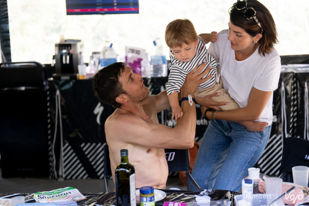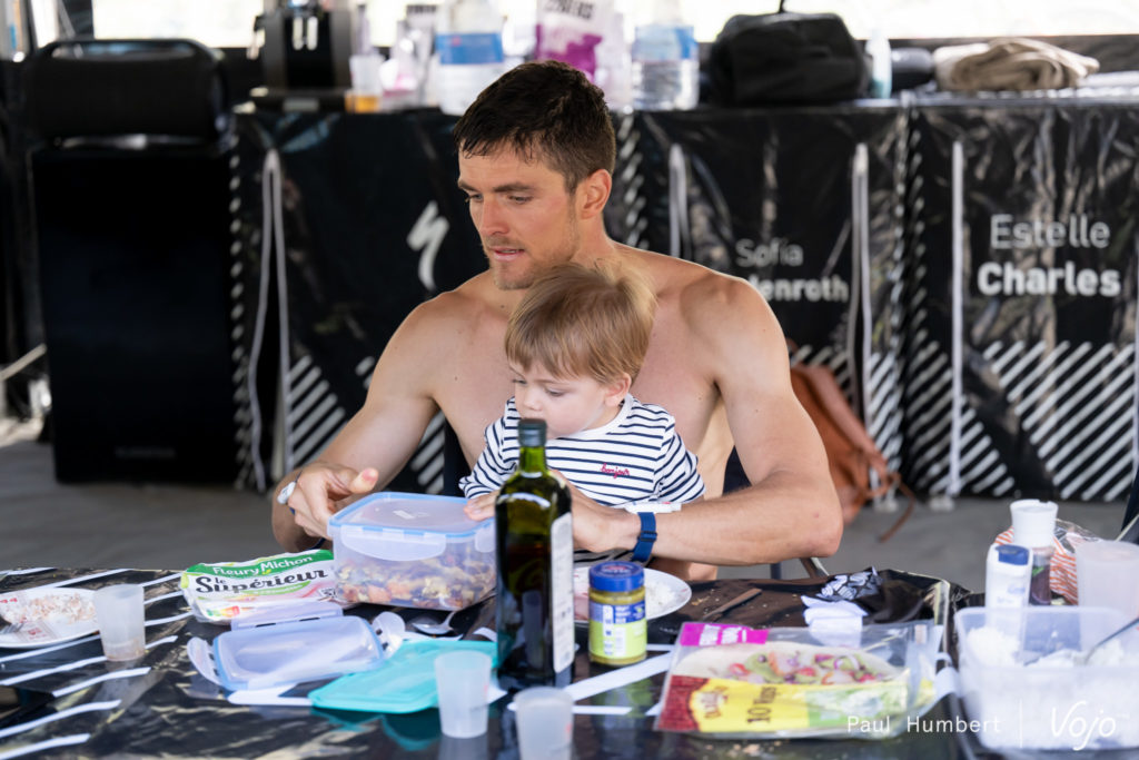 Pendant les quelques minutes de repos accordées aux athlètes en milieu de journée, on retrouve Kévin Miquel en famille juste avant de repartir sur les reliefs d’Avoriaz. Il terminera la course 12ème.