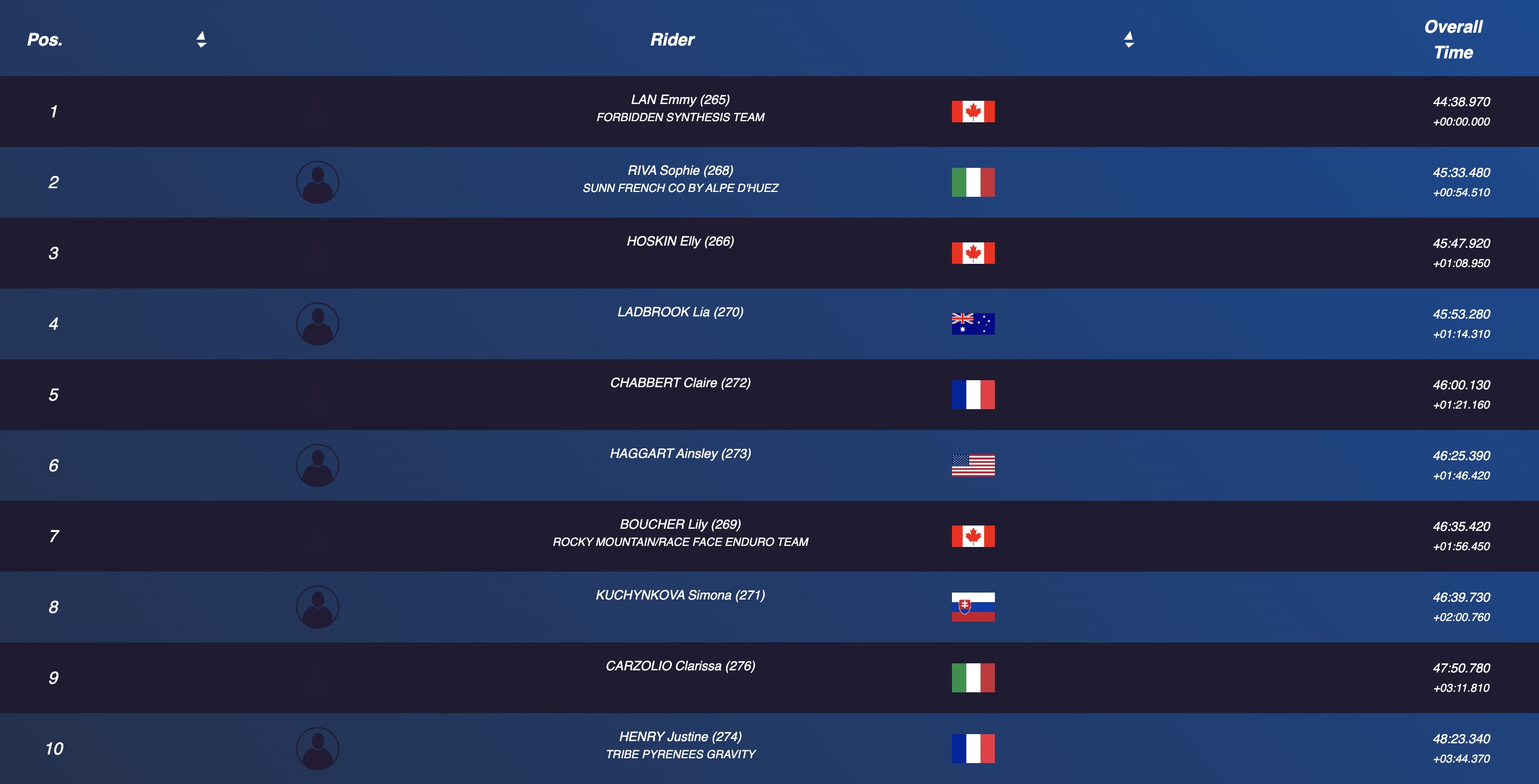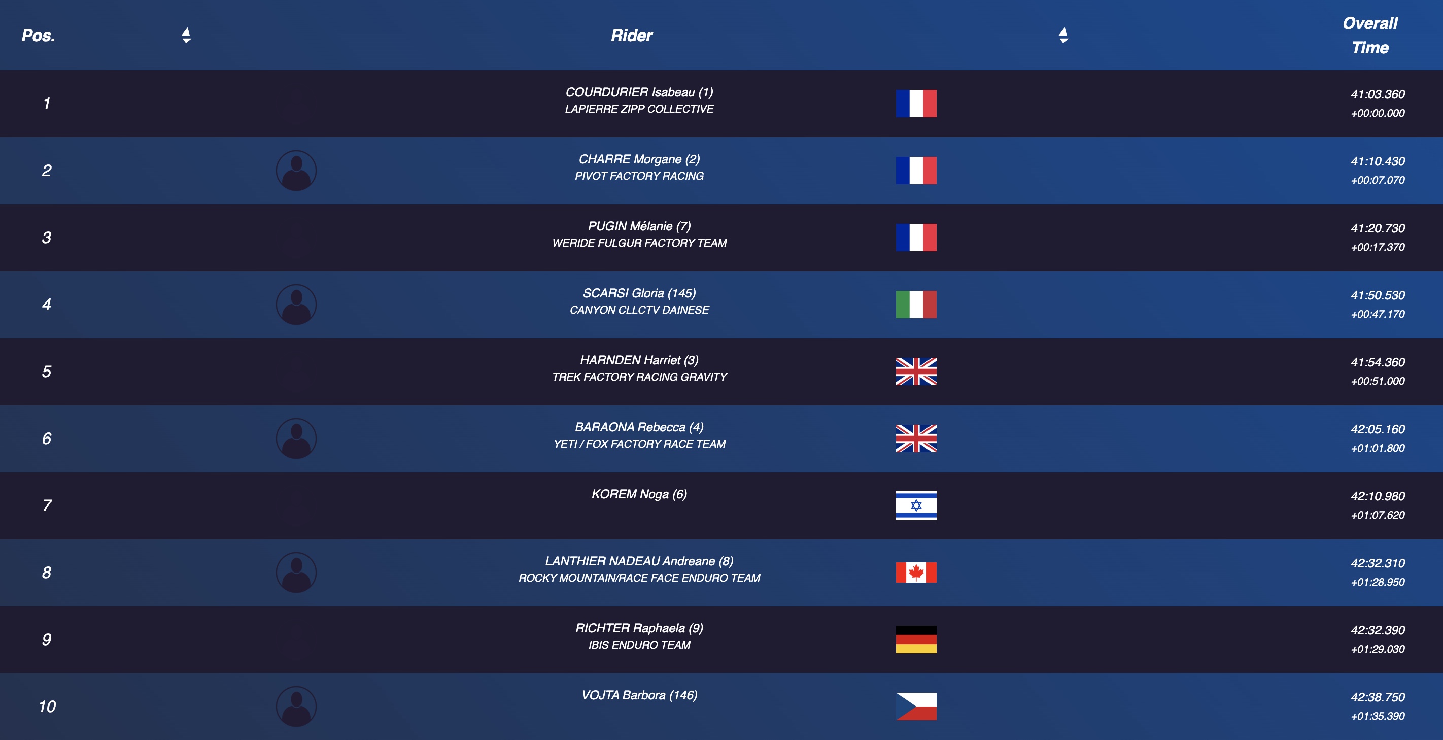 Le podium est même 100% français puisque Mélanie Pugin prend la 3e place, à 17 secondes de Courdurier et 10 secondes de Charre. La championne 2021 retrouve doucement son niveau, et ça fait plaisir à voir !