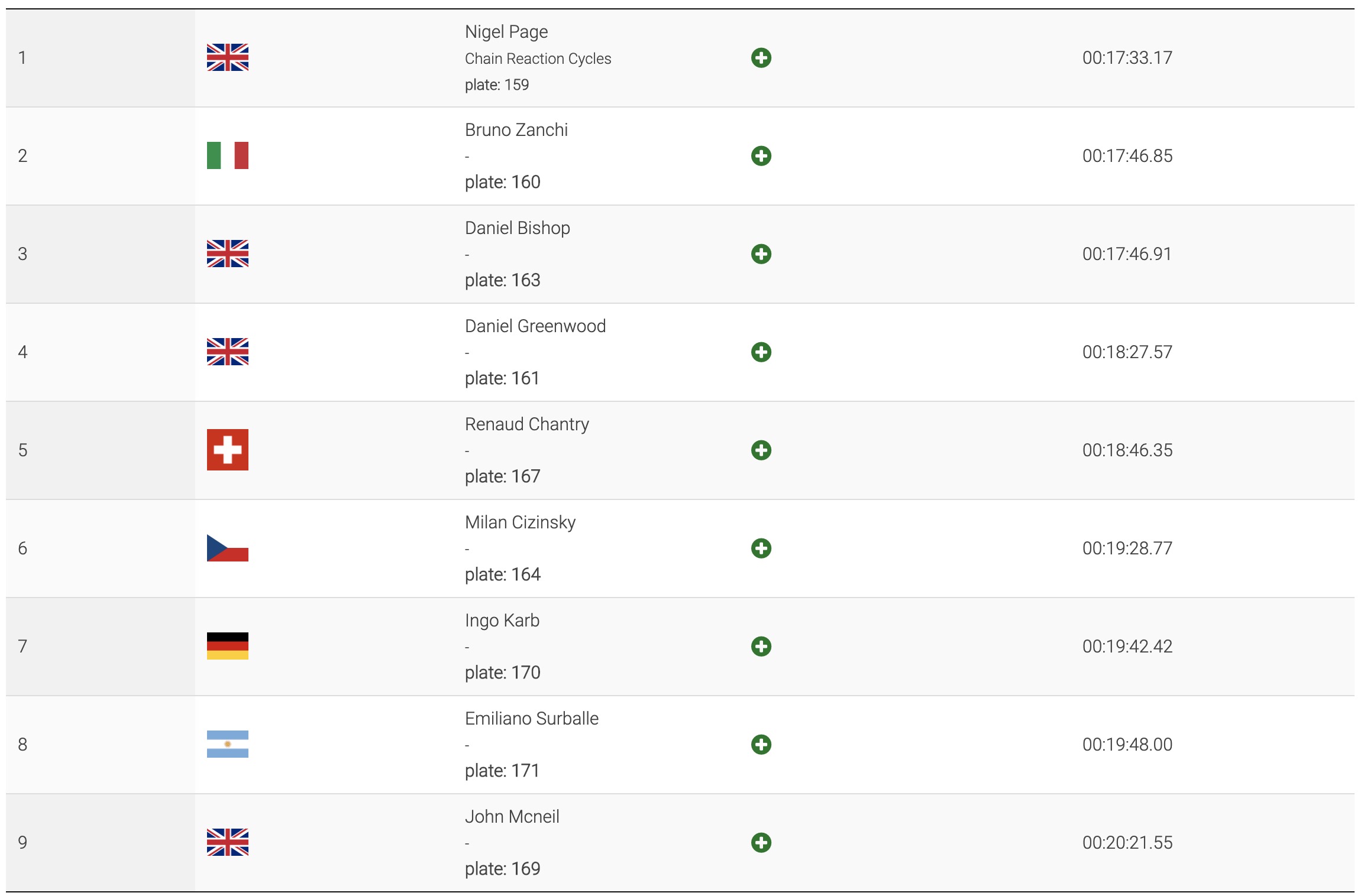 Chez les Masters 40+, c’est Nigel page, le team manager de Sam Hill au sein du team CRC-Nukeproof, qui s’impose devant Bruno Zanchi et Daniel Bishop.