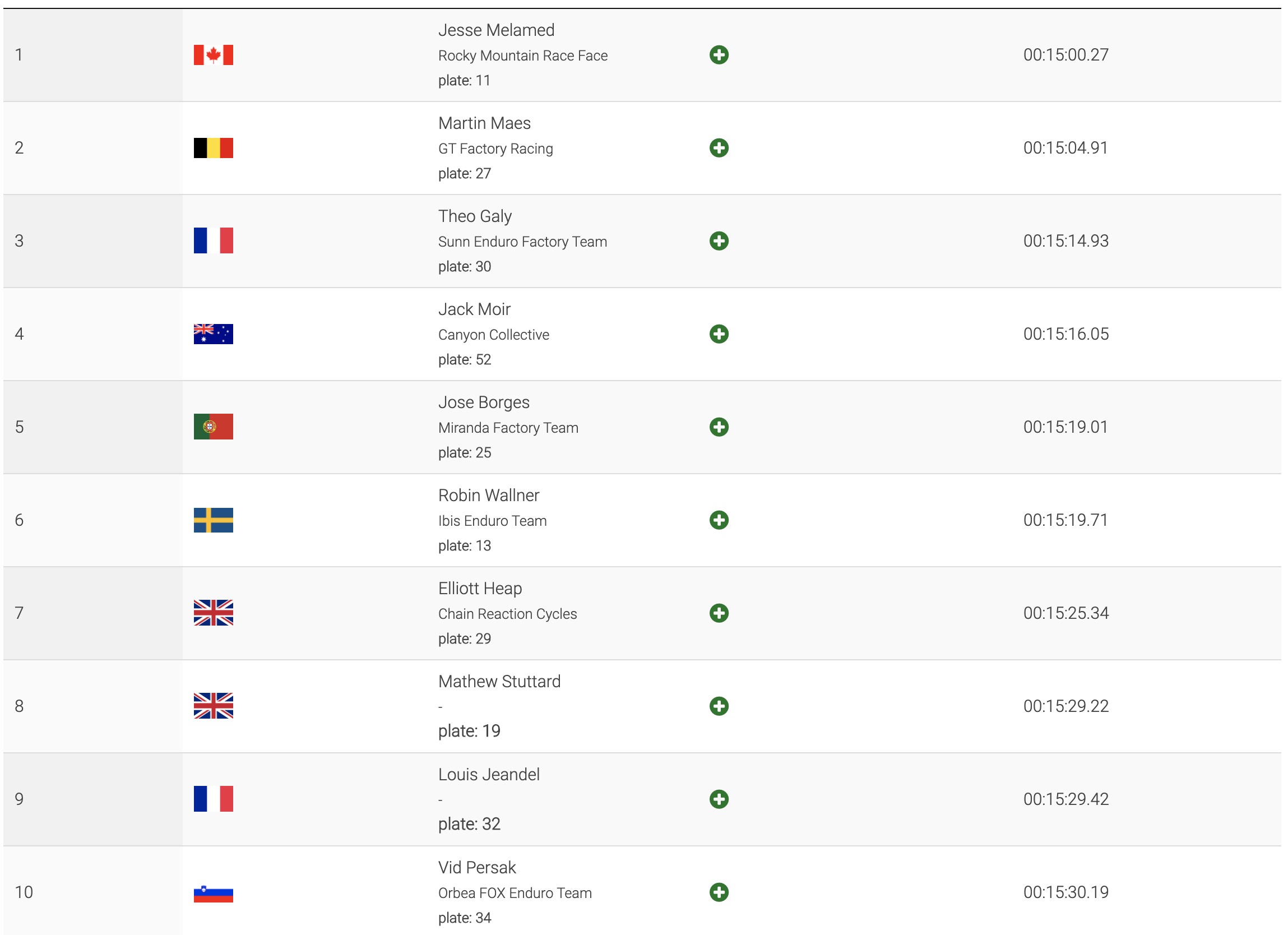 Dans ces conditions particulières, sur un terrain âpre et en l’absence de Rude, Hill et autres pointures, on attendait Martin Maes, déjà vainqueur à Zermatt la saison dernière. Mais le jeune Belge concède d’emblée pas moins de 10 secondes dans la SP1, remportée de main de maître par Jesse Melamed, signant le 4e temps derrière Robin Wallner et Elliott Heap. Tous trois sont très loin du redoutable Canadien, mais ils sont dans la même seconde ! Les Français sont eux un peu à la peine à la mi-course : Theo Galy est alors 7e et seul frenchie dans le top 10 et il faut aller jusqu’à la 12e place pour trouver un de ses compatriotes, Dimitri Tordo, tandis que Louis Jeandel pointe à la 14e position, Thomas Lapeyrie à la 18e et Flo Nicolai à la 19e.
