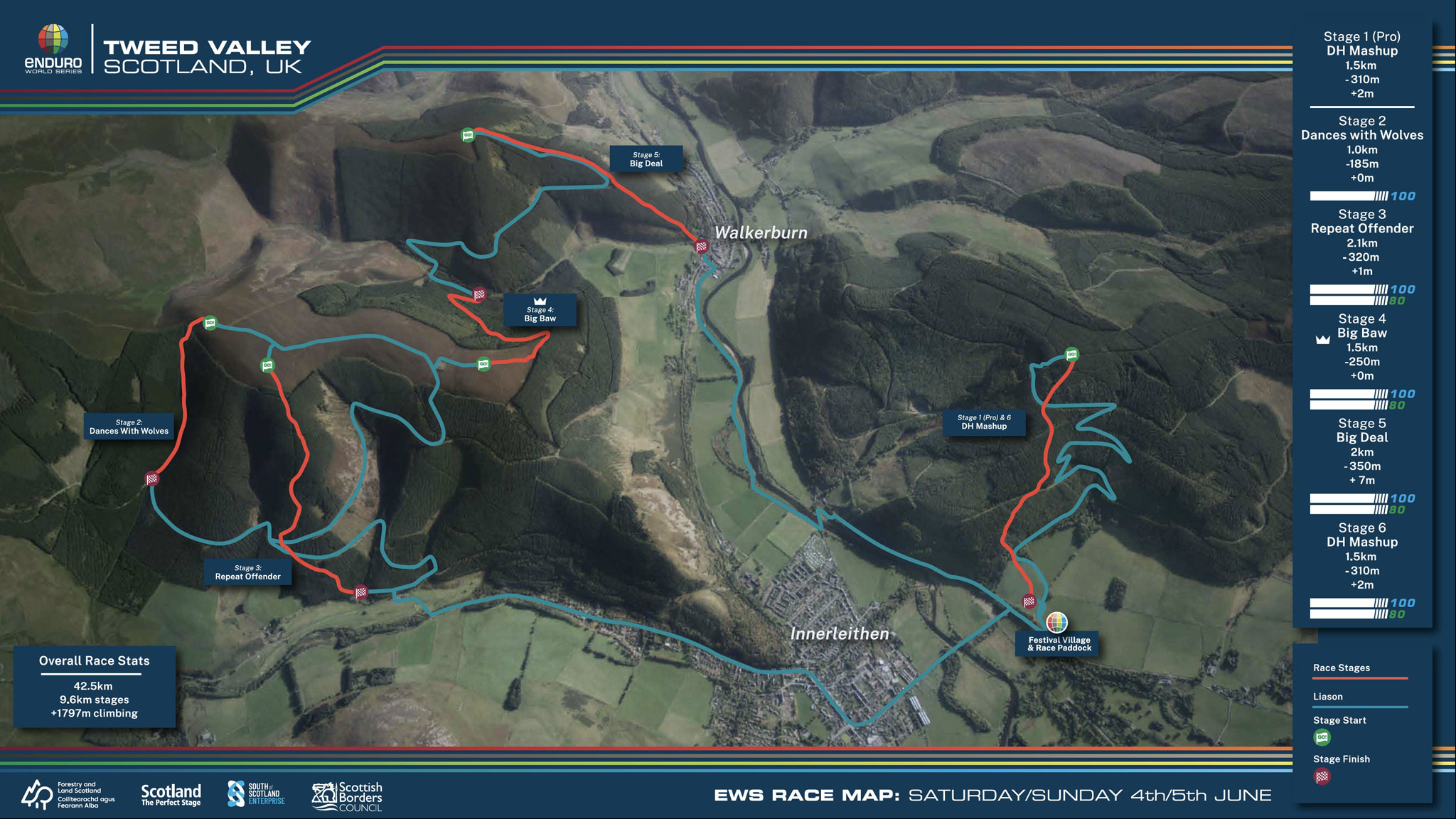 A Tweed Valley cette semaine, il y a 6 spéciales au programme. Les pilotes s’entraîneront ce vendredi sur les spéciales 2 à 5, puis pourront reconnaître la Pro Stage samedi matin, avant de s’y retrouver dès 11h30 pour se mesurer au chrono. Cette Pro Stage fera office de SP1 le samedi donc, mais aussi de 6e et dernière spéciale de la course le dimanche. Plus tôt dans la journée du dimanche, les enduristes se seront affrontés sur les spéciales 2 à 5, celles qu’ils avaient pu reconnaître le vendredi.