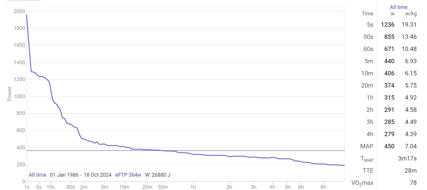 Concrètement, le point de départ est la définition d’un profil de puissance record (PPR, les watts maximum pour une durée donnée en abscisses, quand on regarde le schéma ci-dessus), qui donnera la puissance maximale que le coureur peut tenir en fonction du temps. Ce PPR est en quelque sorte le graphique de la courbe de puissance du coureur après son passage au banc, pour reprendre une analogie avec un moteur. Ce PPR peut être établi grâce à différents protocoles de test. Par exemple, on va demander au coureur de faire un effort maximal sur 1”, 30”, 5’ et 20’ ; ce qui permet ensuite d’extrapoler les données sur des durées plus longues et d’établir un PPR complet.