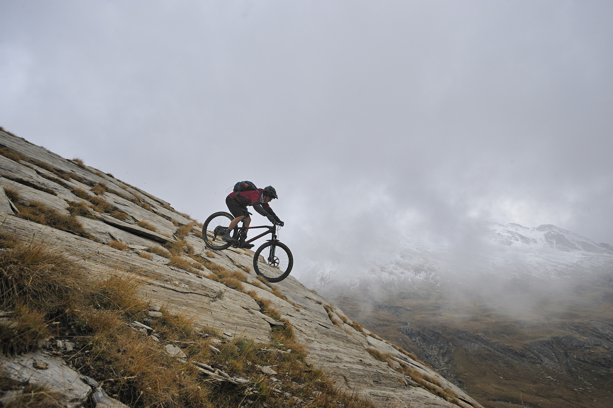 Plus on roule dans ce bout d’Italie, plus on s’imprègne de sa substance. La roche, de couleur ocre, semble peinte comme si elle avait cuit, ressemblant à ces roches volcaniques d’Islande. Dans la descente, le sentier devient un vrai singletrack pour les chamois. Le VTT enduro donne ici sa pleine mesure, en milieu naturel.
