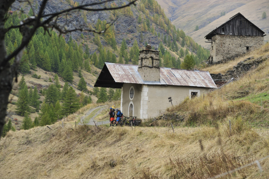 D’Abriès, nous poursuivons la route pour rejoindre encore plus haut, son alter ego le Roux. Nous touchons ici un certain paradis, avec comme jardin extraordinaire des espaces sans fin se déroulant vers le Bric Froid et le Bric Bouchet. Le village s’apprête à passer un hiver vigoureux. Plus haut est posé le hameau du Pré Roubaud. Autrefois, les cloches de la chapelle sonnaient peut-être la sonate du courage. Elle a sans doute guidé les passeurs et les contrebandiers qui descendaient de là-haut, du col Saint-Martin en plein brouillard. Ces pauvres erres affrontaient l’inconnu, le domaine de la haute montagne avec leurs bardas sur le dos, les godillots plongés dans la neige. Et ils passaient, quel que soit le climat, pour amener de l’autre côté leurs marchandises. Nous sommes humbles et un peu ridicules avec nos VTT derniers cris et nos suspensions absorbant le moindre rocher.