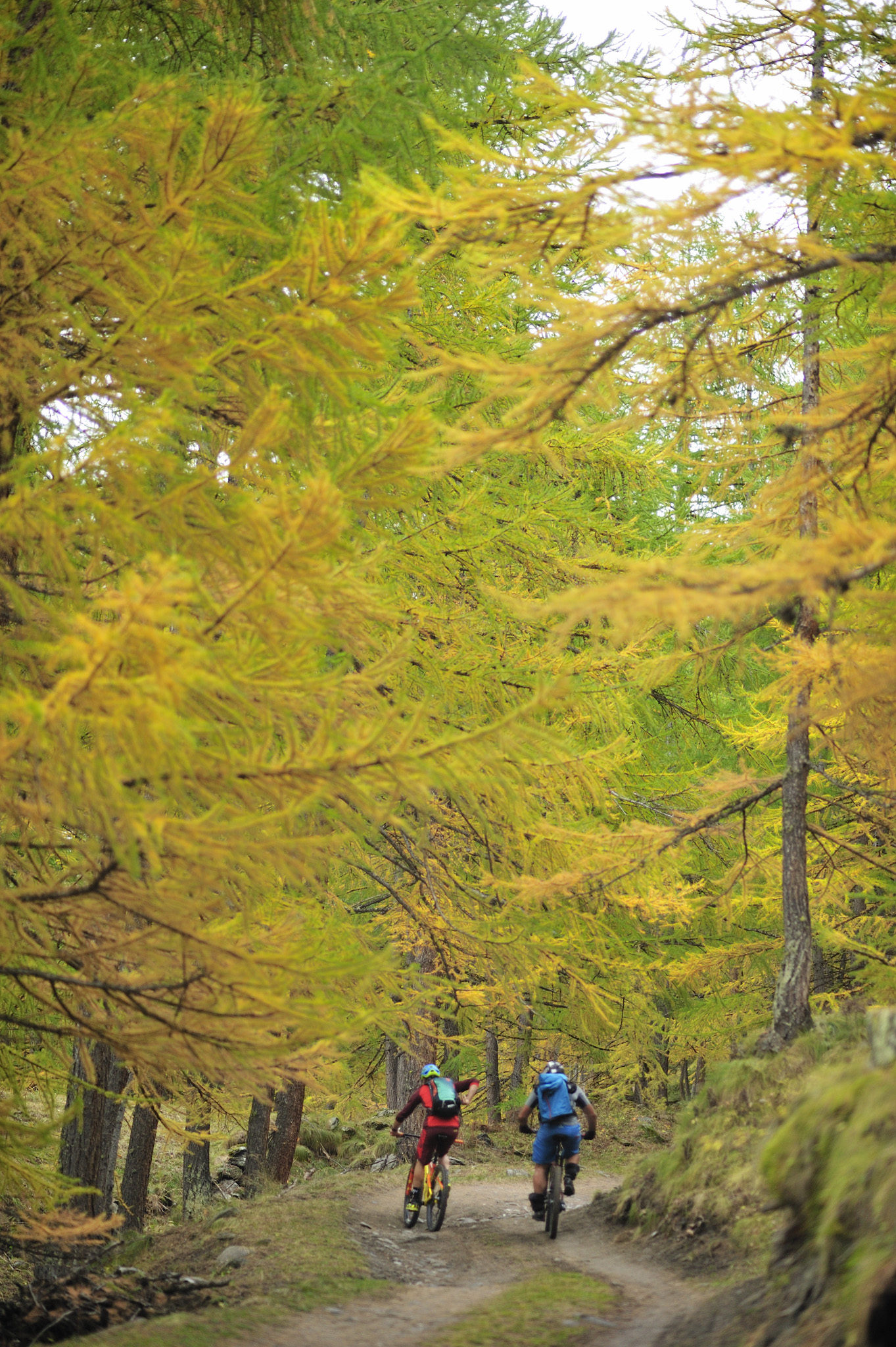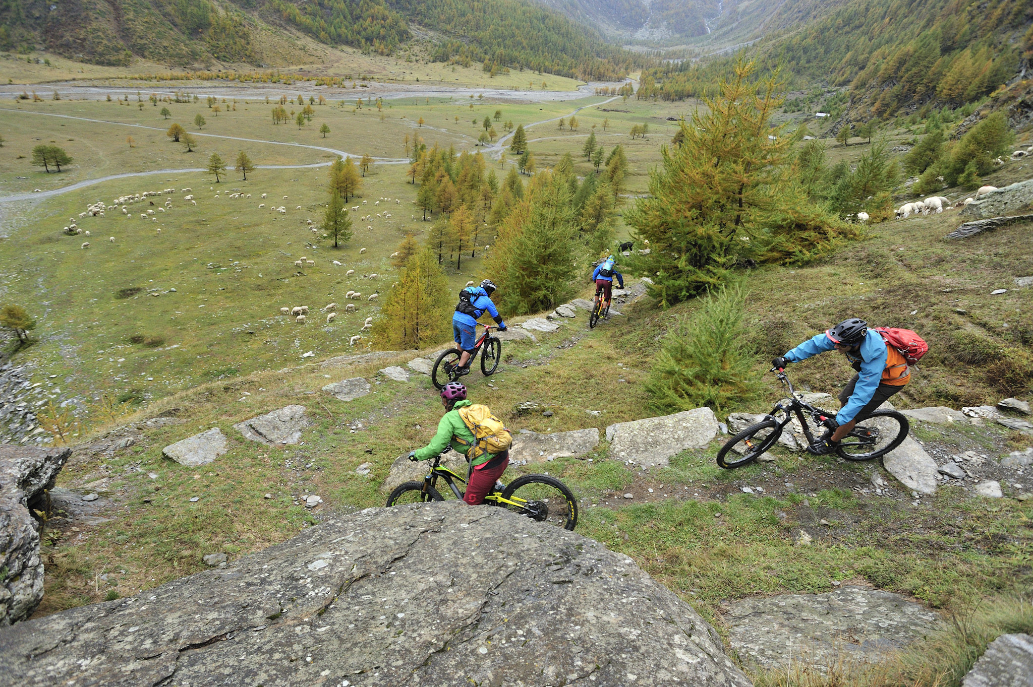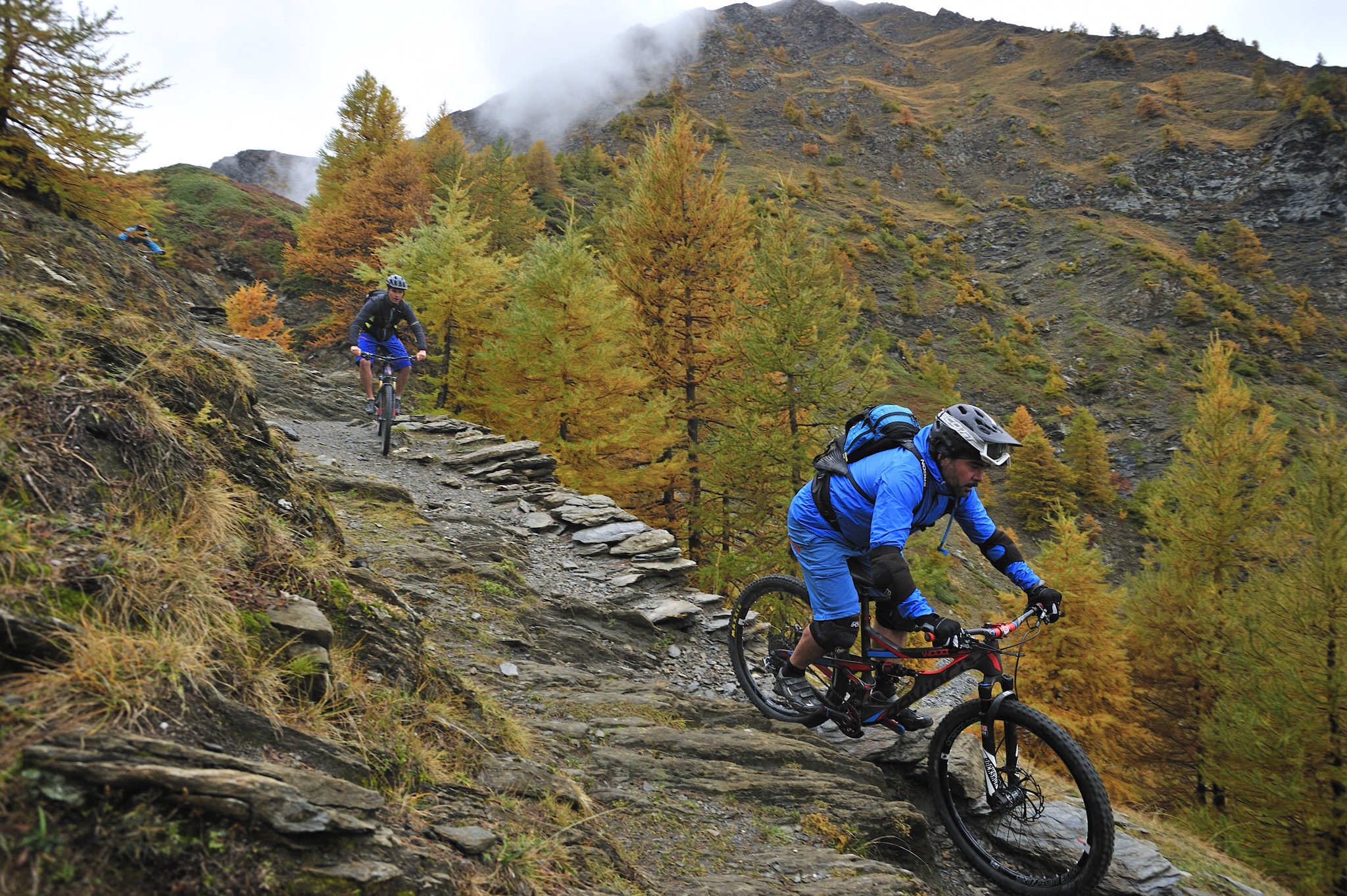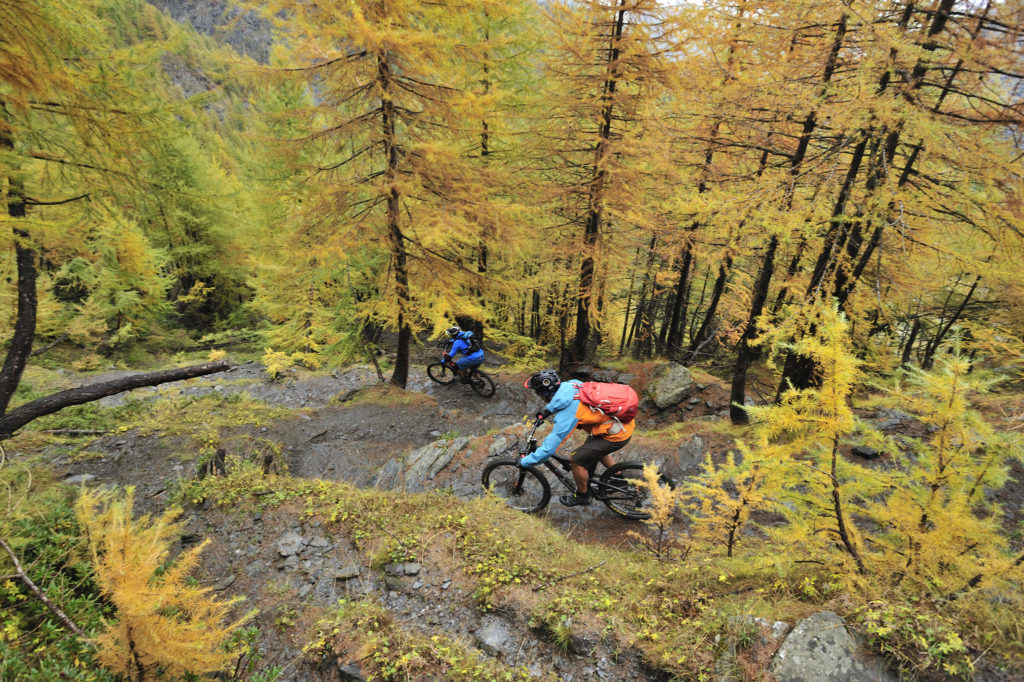 Plus on roule dans ce bout d’Italie, plus on s’imprègne de sa substance. La roche, de couleur ocre, semble peinte comme si elle avait cuit, ressemblant à ces roches volcaniques d’Islande. Dans la descente, le sentier devient un vrai singletrack pour les chamois. Le VTT enduro donne ici sa pleine mesure, en milieu naturel.