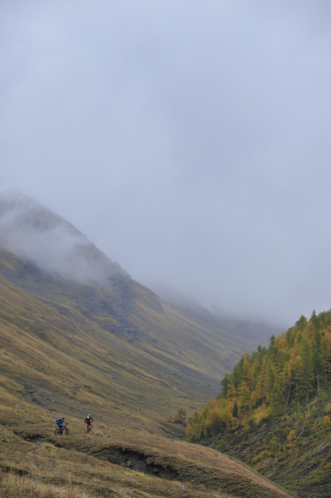 A Saint-Véran, nous bouclons nos sacs à dos pour deux jours. Cette autonomie nous permettra d’aller au-delà de ce que peuvent porter nos machines pour une itinérance aux confins du Queyras et de s’immerger dans ce massif reculé. Depuis la magnifique chapelle de Clausis, nous entrons dans un autre monde. En ce mois d’octobre, seul l’écho du torrent de la Selle résonne dans la montagne. A hauteur du refuge de la Blanche, maintenant désert, Vincent, Xavier et Bastien portent sur leur dos leur bike. Comme eux, je deviens un mulet et gravis marche par marche le col de la Noire situé là-haut, à près de 3000 mètres d’altitude. Mes compagnons de route s’envolent tandis que je m’époumone à trouver mon rythme dans cet air plus raréfié. Gravir 500 m de dénivelé en portage est un exercice que les riders du Queyras effectuent régulièrement pour aller chercher cette pente sur l’autre versant et ce singletrack magnifique.