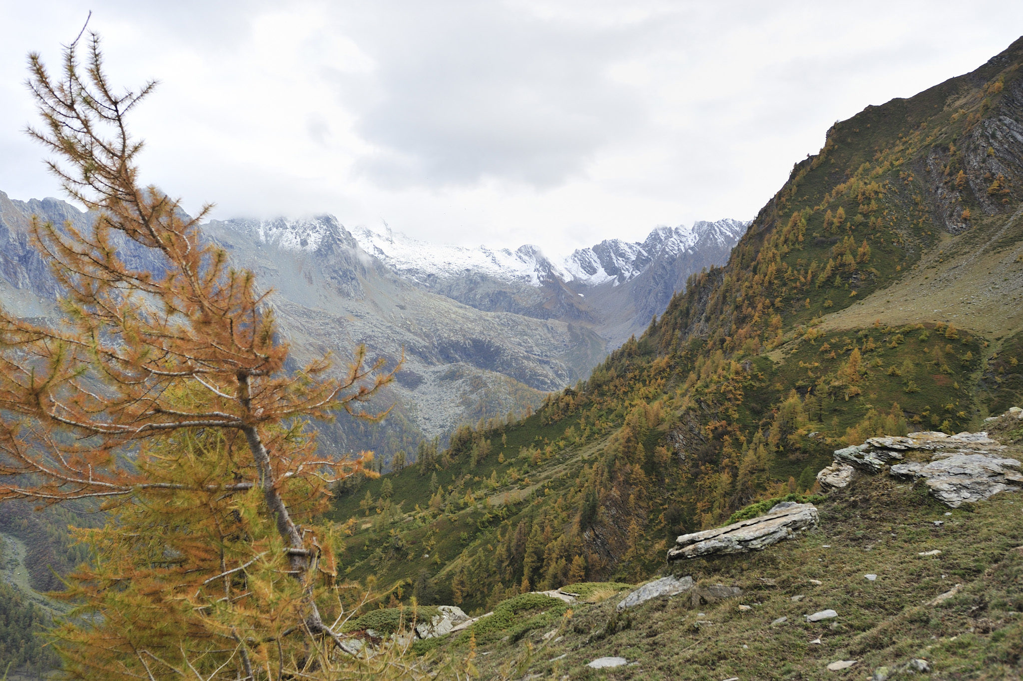 Dans le bois de Mamezel, le temps maussade empêche les mélèzes de briller de leur couleur or. Le soleil d’octobre a toutes les peines à sortir de l’ombre de cette muraille aux confins du Queyras : toute la matinée, il jouera à cache-cache avec nous. Mais ce ciel tourmenté n’est pas pour me déplaire. Si les images risquent d’être plus ternes, elles pourraient se charger en émotion. A 2000 m d’altitude, les derniers mélèzes tentent de s’accrocher sur la pente. Bastien me fait d’ailleurs remarquer le résultat de la dernière coulée d’avalanche qui a couché comme un mikado tout un pan de conifères.