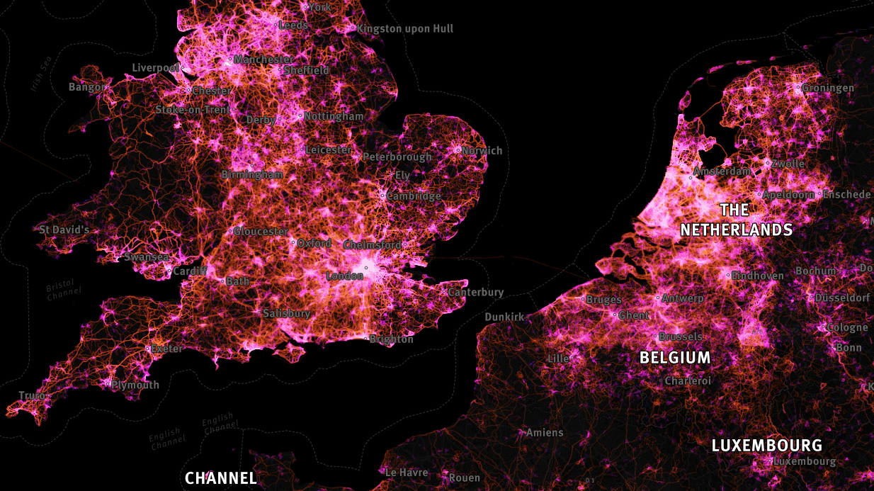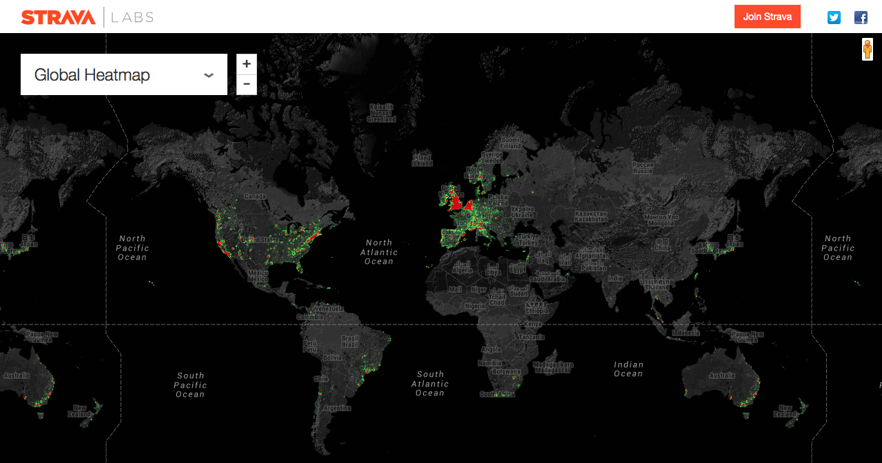 Autre carte, mais dont le visuel est tout aussi impressionnant et intéressant: celle de Strava, qui propose également un travail similaire via sa « Heatmap ». Ici, 160 millions de sessions sont encodées, soit 375 milliards de points GPS (!!!) et on peut séparer les activités vélo et course à pied.
