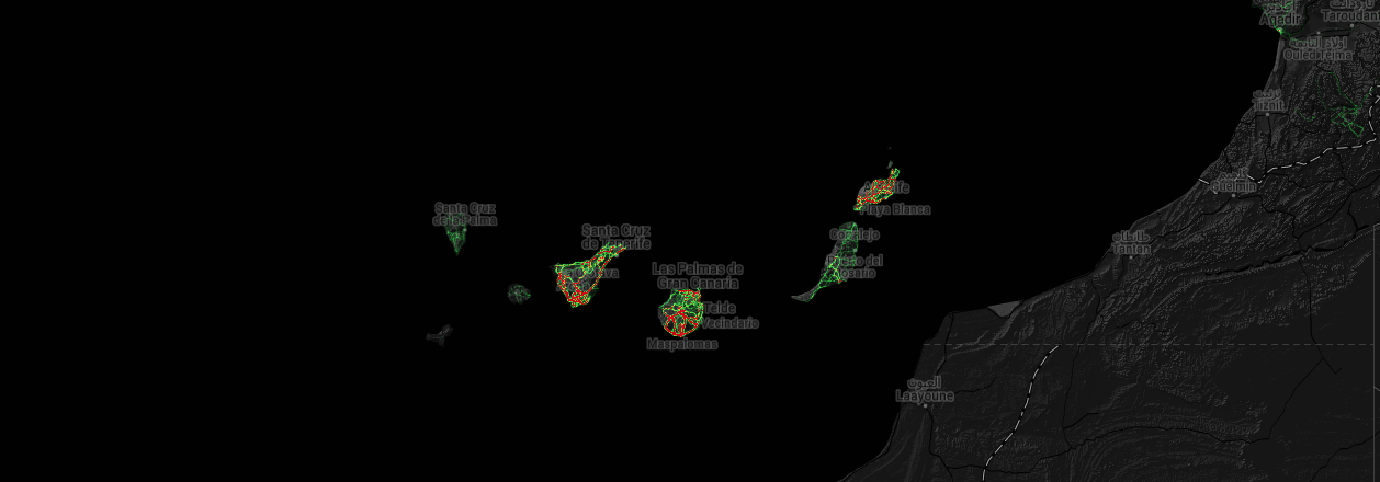 On note aussi que Strava est plus utilisé par les sportifs au long cours et les « purs et durs », dans la mesure où les régions plus éloignées des centres urbains, mais très jolies et réputées pour y pratiquer le vélo, sont plus colorées que sur la carte MapBox. On voit aussi que des îles très appréciées pour s’entraîner l’hiver sont fortement colorées, comme les Canaries par exemple.