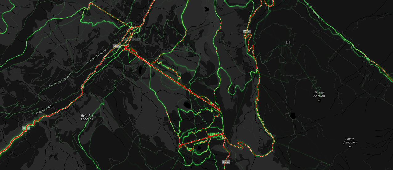 On remarque que le vélo de route reste majoritaire, mais il est possible de deviner certains tracés VTT, comme par exemple du côté de Fréjus et de l’Estérel (tiens, tiens,…), ou encore dans les Alpes où quelques remontées mécaniques apparaissent comme des segments très fréquentés comme ci-dessous aux Gets.