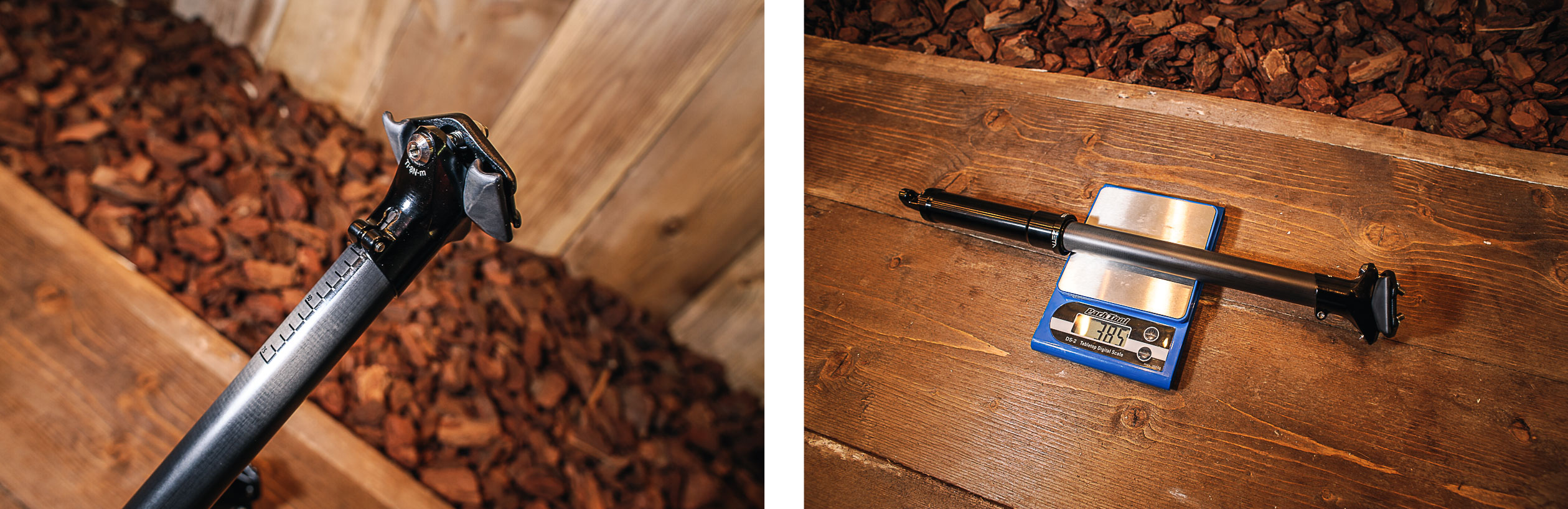 La partie qui contient le mécanisme air/huile est insérée dans le cadre et seul un long et fin tube dépasse du cadre. Celui-ci peut être soit en alu, soit en carbone. Le chariot de selle est amovible et on peut recouper le tube pour ajuster sa hauteur de selle en position haute. Elle sera disponible en 30,9 et 31,6mm de diamètre avec tube alu ou carbone. Nous avons pesé la KS Zeta Carbon à 381g sans commande au guidon.