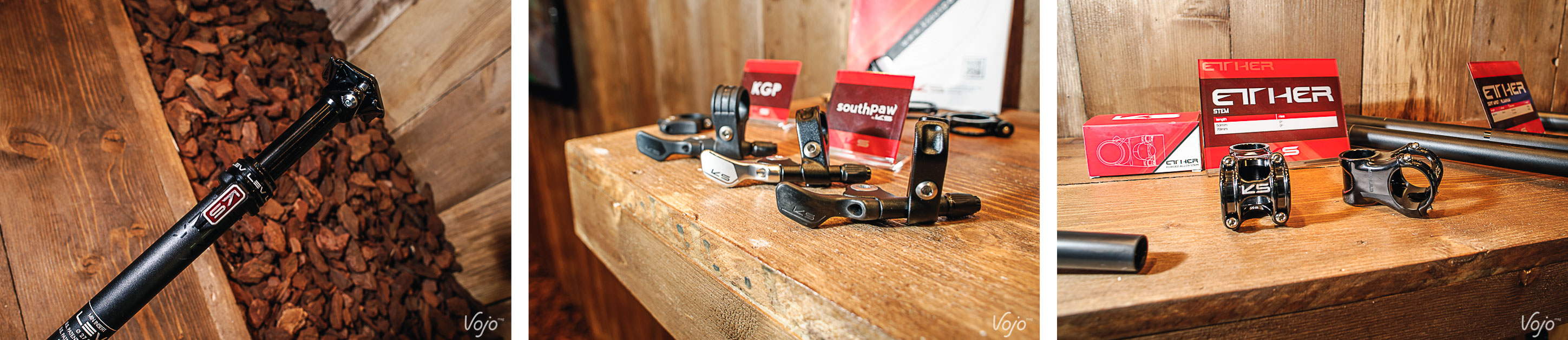 Pour le reste, KS proposera une version 27,2mm de diamètre de sa célèbre Lev Integra, uniquement en 65mm de débattement, ainsi qu’une version carbone de son levier de commande au guidon Southpaw (que nous avons testé un peu plus tôt cette saison en alu), ainsi qu’une déclinaison plastique/composite d’entrée de gamme uniquement pour la première monte. Le levier carbone est plus là pour le style car le gain de poids n’est que de 5g (40g au lieu de 45g). Le levier plastique/composite pèse quant à lui 31g. Nous avons également pu voir la ligne de composants de KS, baptisée Ether, qui comporte de fort belles potences, ainsi que des cintres (carbone et alu) et des tiges de selles classiques.