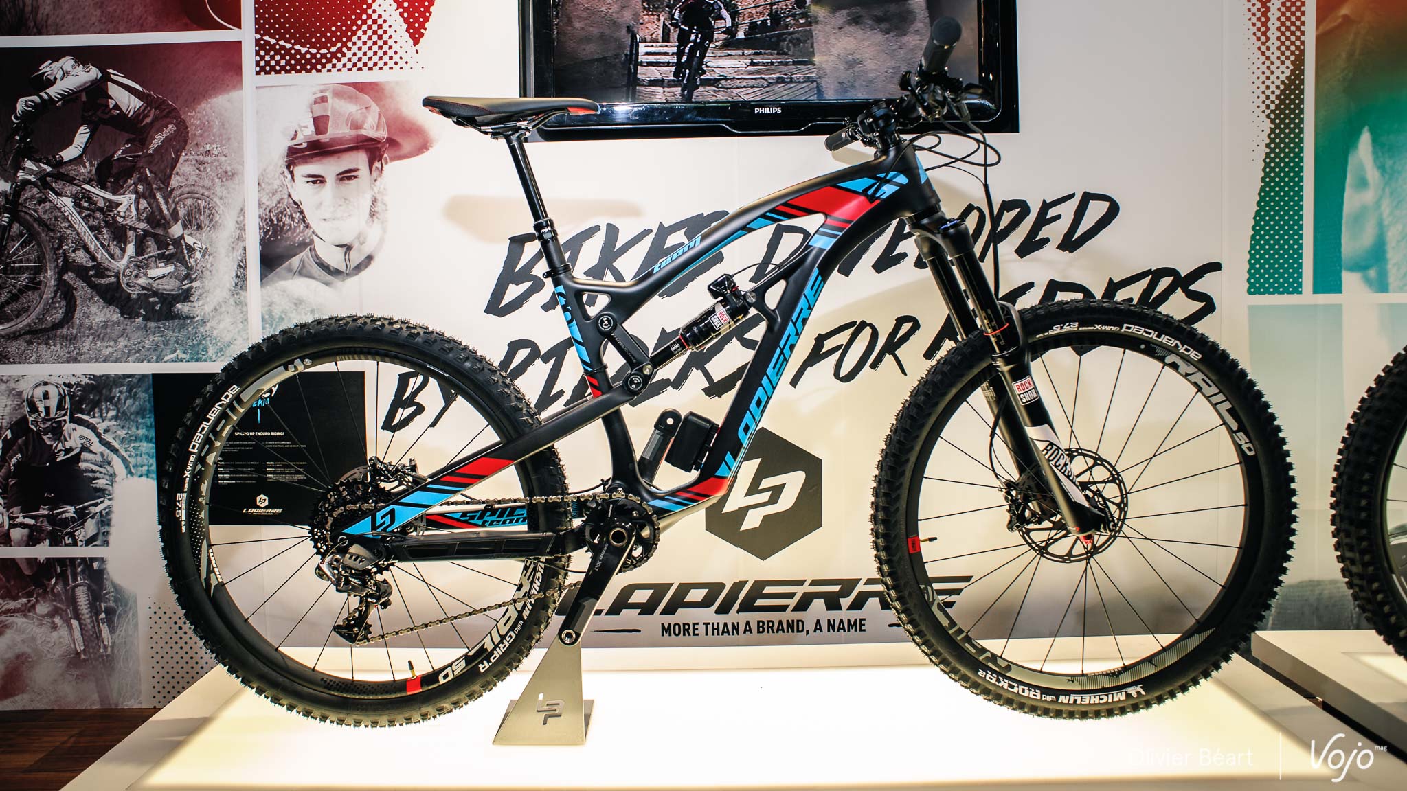 Après les Zesty AM et XM, Lapierre a présenté la nouvelle version de son Spicy. Il a été développé avec Nicolas Vouilloz dans une optique purement « enduro race », avec un reach allongé pour une stabilité maximale, ainsi qu’une suspension revue qui offre 165mm de débattement. A l’avant, il sera proposé en montage complet avec des fourches de 160mm, mais il est possible de monter également du 170mm. Il suffit alors de retirer la cale présente sous le jeu de direction afin de ne pas entraîner de modification de la géométrie.