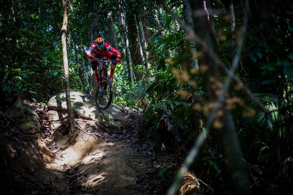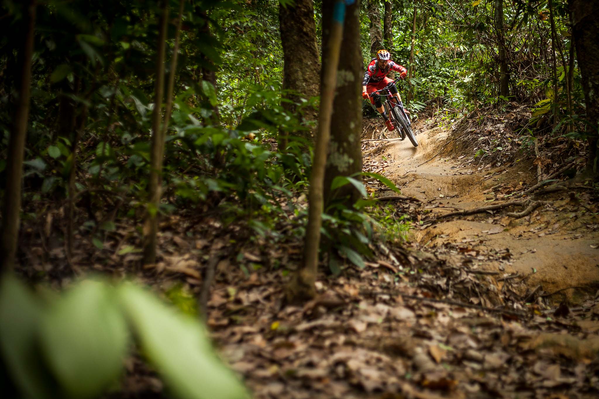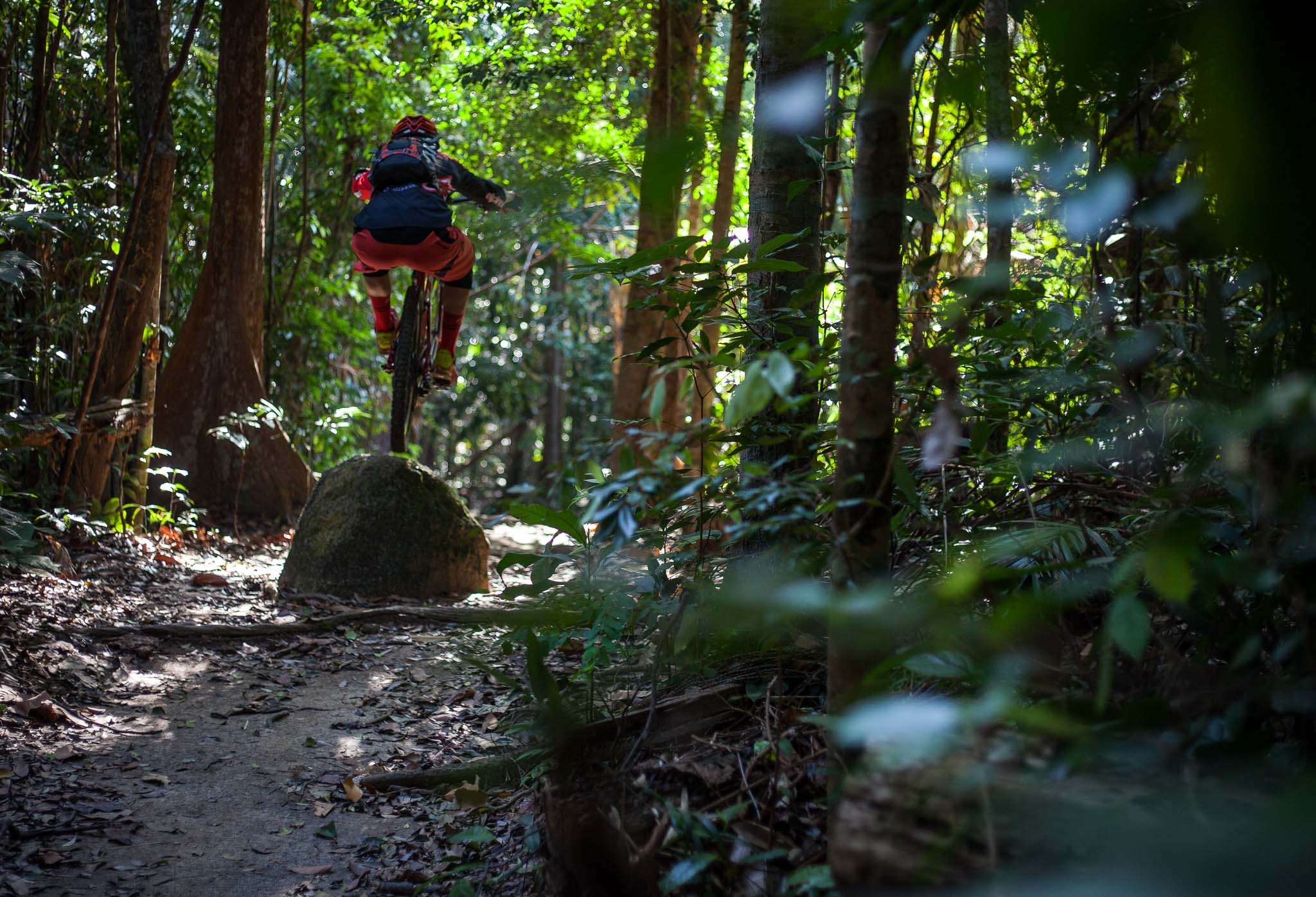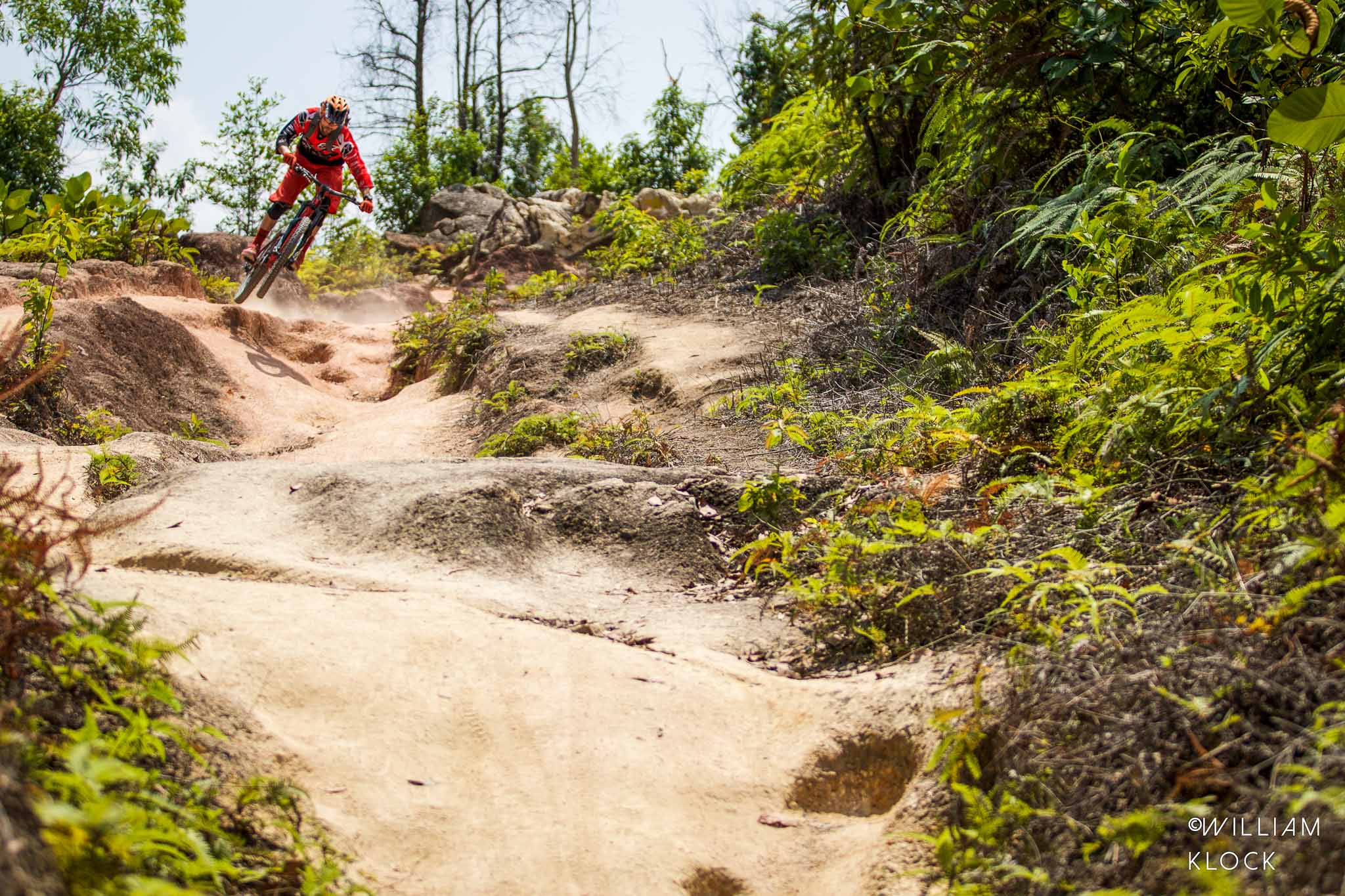 Les conditions sont très sèches et le terrain encore différent. De la pente, des racines et du dévers dans un mélange sablonneux, c’est le programme du jour. Les locaux nous ouvrent la route et se faufilent à travers des pistes sinueuses et piégeuses. Les trajectoires sont multiples mais hors de question de couper un arbre en travers du chemin, Jerai est une réserve naturelle.