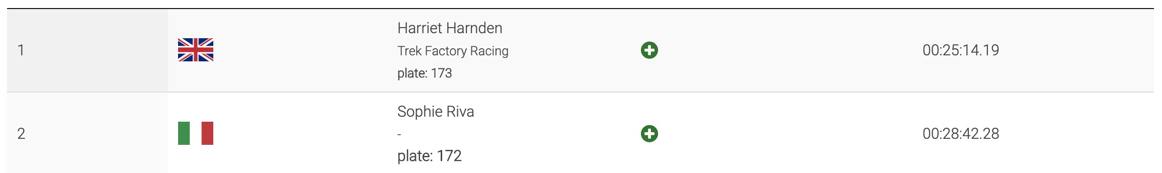 Tout comme à Pietra, elles n’étaient que deux pilotes à se disputer la victoire chez les Dames U21. Et c’est une nouvelle fois l’intouchable Harriet Harnden du Trek Factory Racing qui rafle la victoire, devant Sophie Riva.