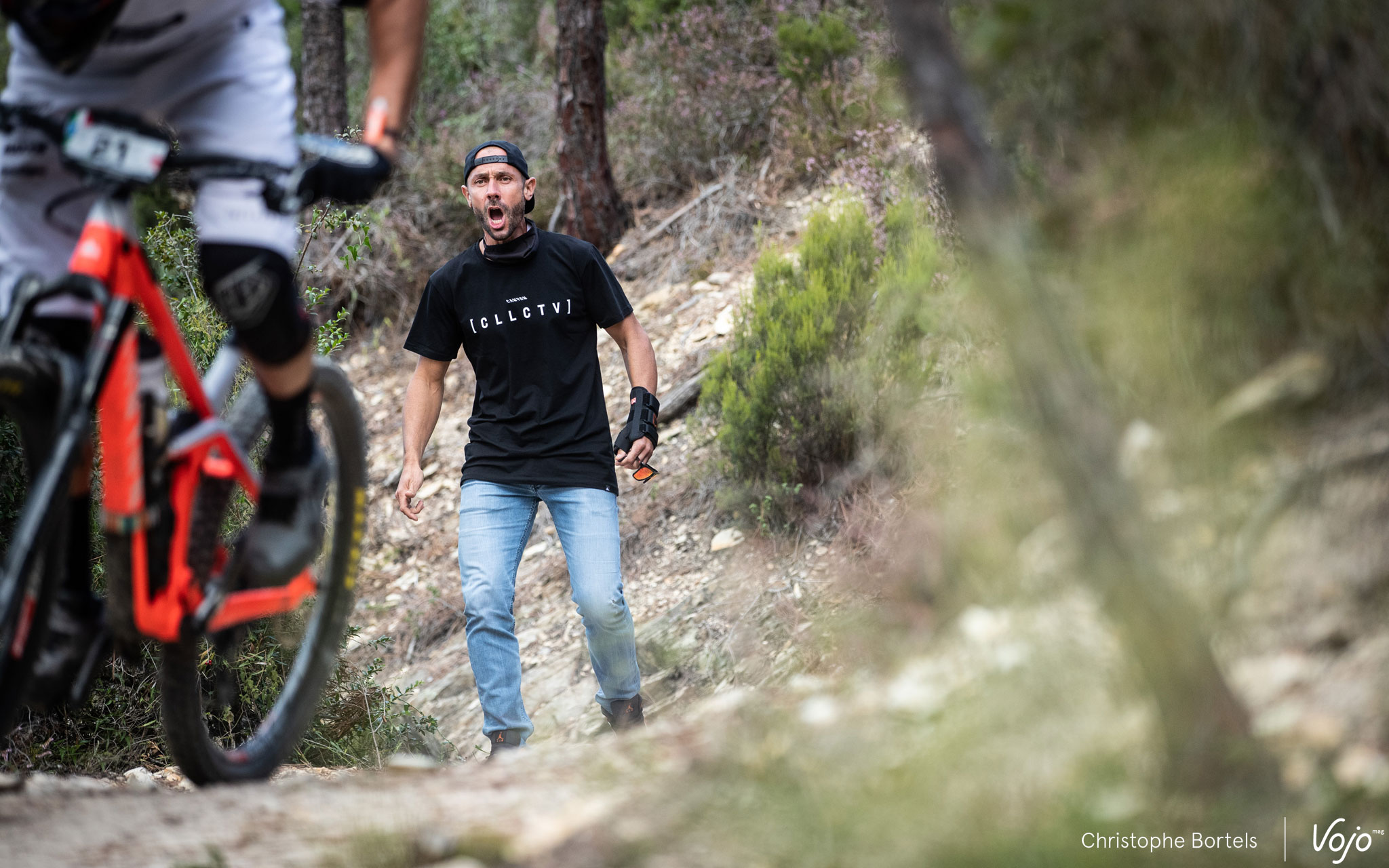 Malheureusement, une grosse chute dans la SP4 lors des entraînements et un poignet touché l’ont forcé à déclarer forfait pour la course, ce qui lui a du coup permis d’encourager avec entrain ses pilotes du team Canyon, comme ici Jack Moir dans la SP4… Et ça semble fonctionner puisque c’est précisément dans celle-là que l’Australien signe le scratch !