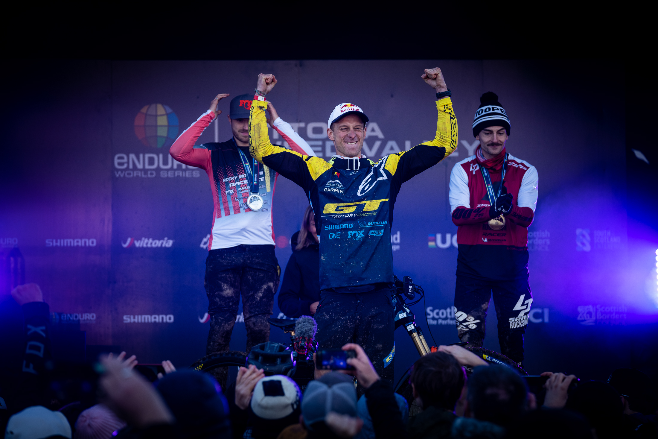 Le podium de cette manche finale : Martin Maes, Jesse Melamed et Adrien Dailly.
