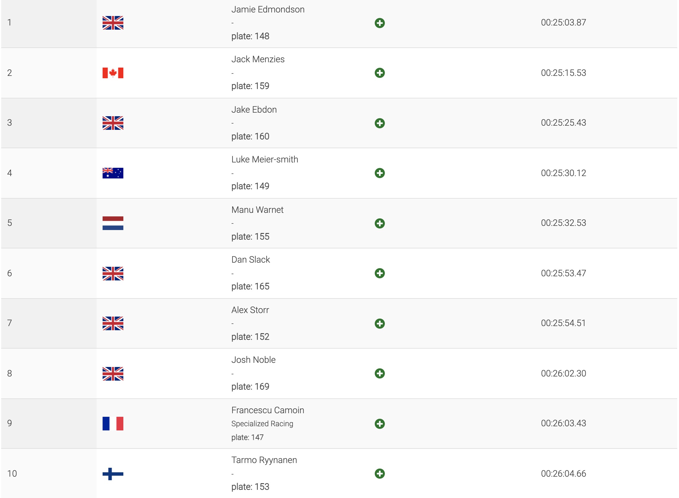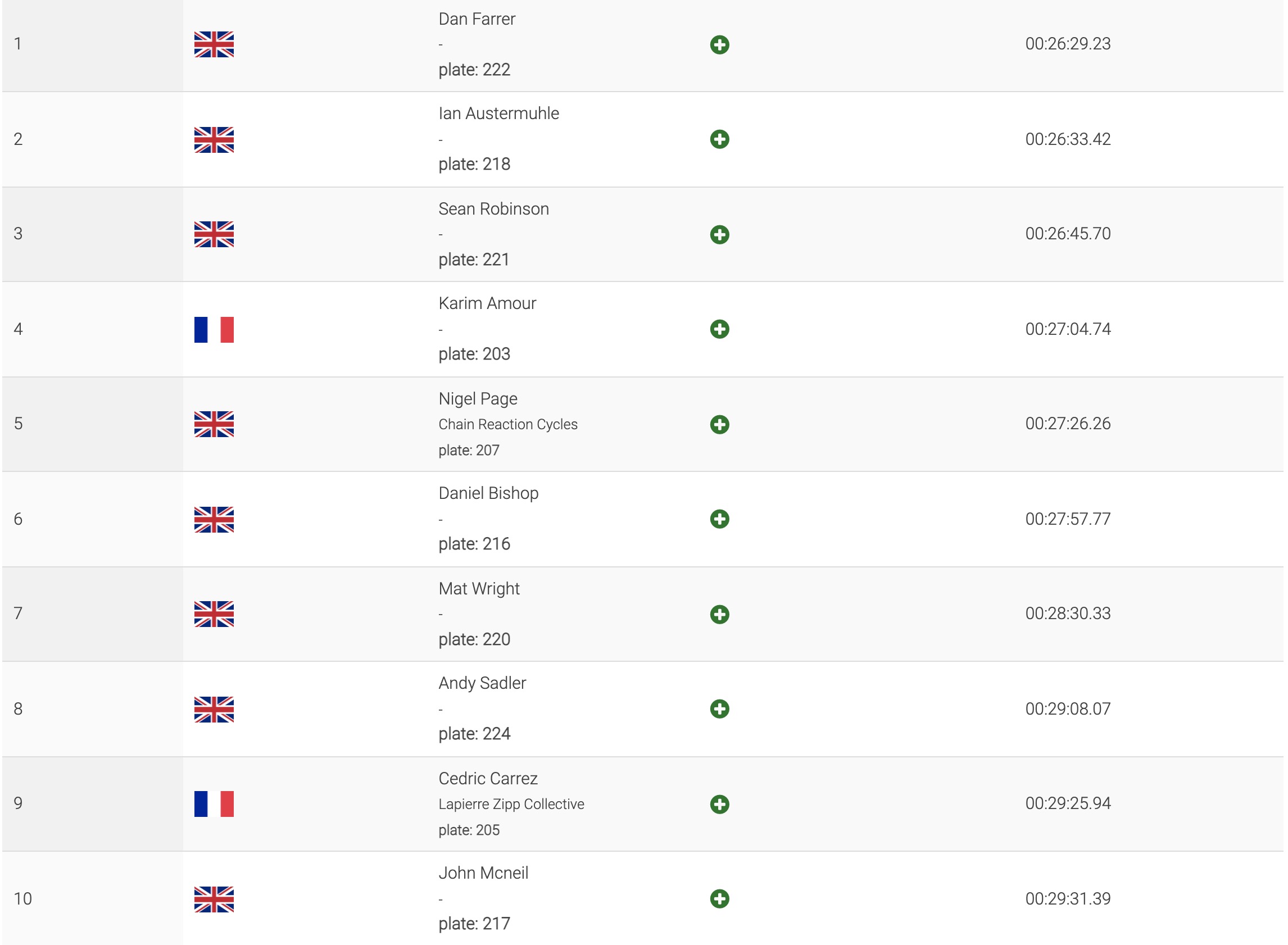 C’est un podium 100% britannique que l’on retrouve chez les Masters, avec la victoire de Dan Farrer devant Ian Austermuhle et Sean Robinson. Karim Amour ne termine que 4e, mais ce résultat est sans importance puisque le Français était déjà assuré de remporter le général avant même cette manche finale.