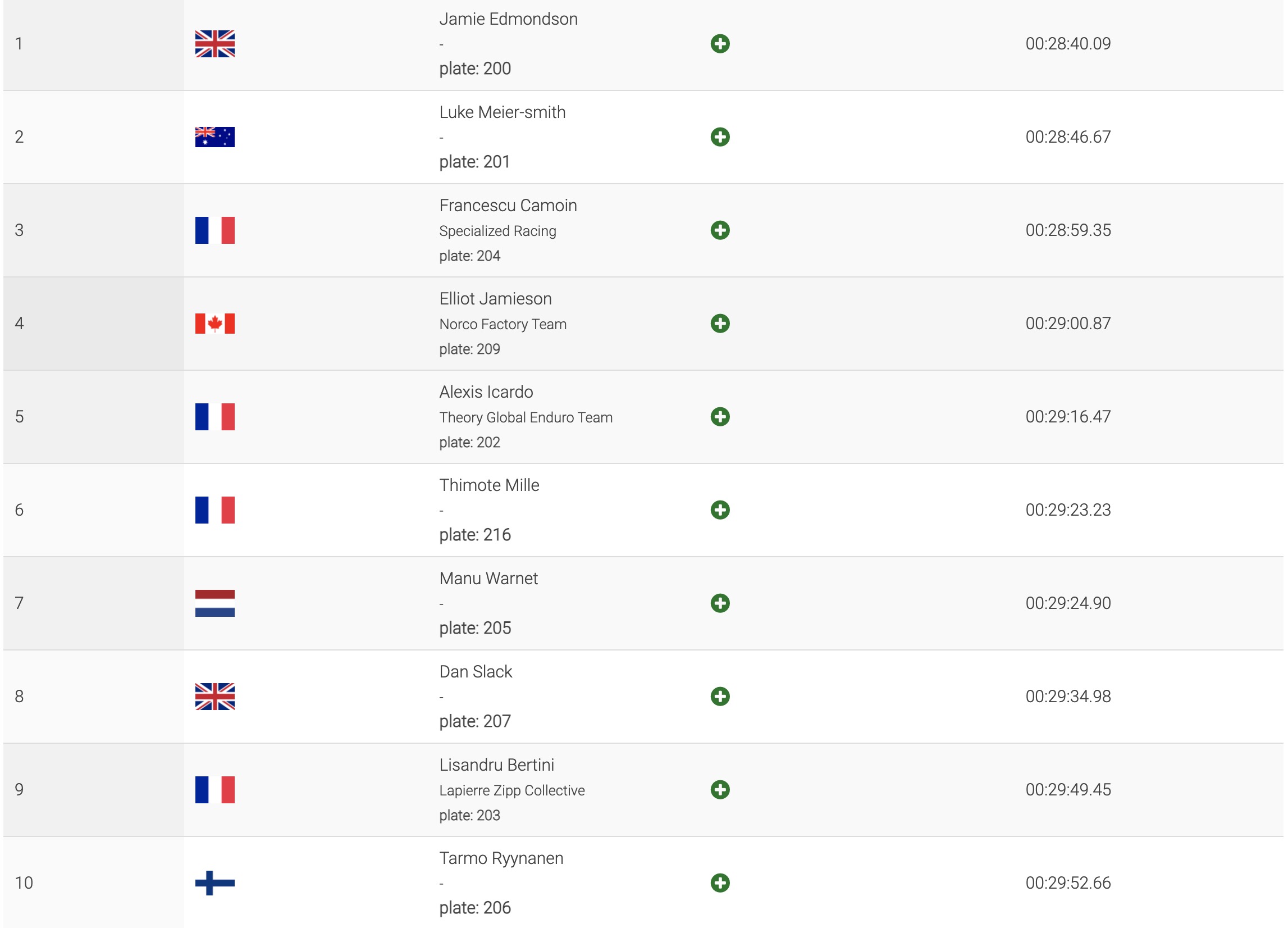 Chez les Masters 35+, les courses et même les saisons se suivent et se ressemblent, avec très souvent le même homme aux avant-postes : Karim Amour ! Cette fois, le Français n’avait pas Cédric Ravanel dans les pattes pour contrecarrer ses plans et s’impose plutôt facilement en raflant 3 des 4 spéciales du jour. Il relègue le Britannique Thomas Donhou et l’Américain Michael Broderick, respectivement 2e et 3e, à 1 minute et 20 secondes.